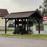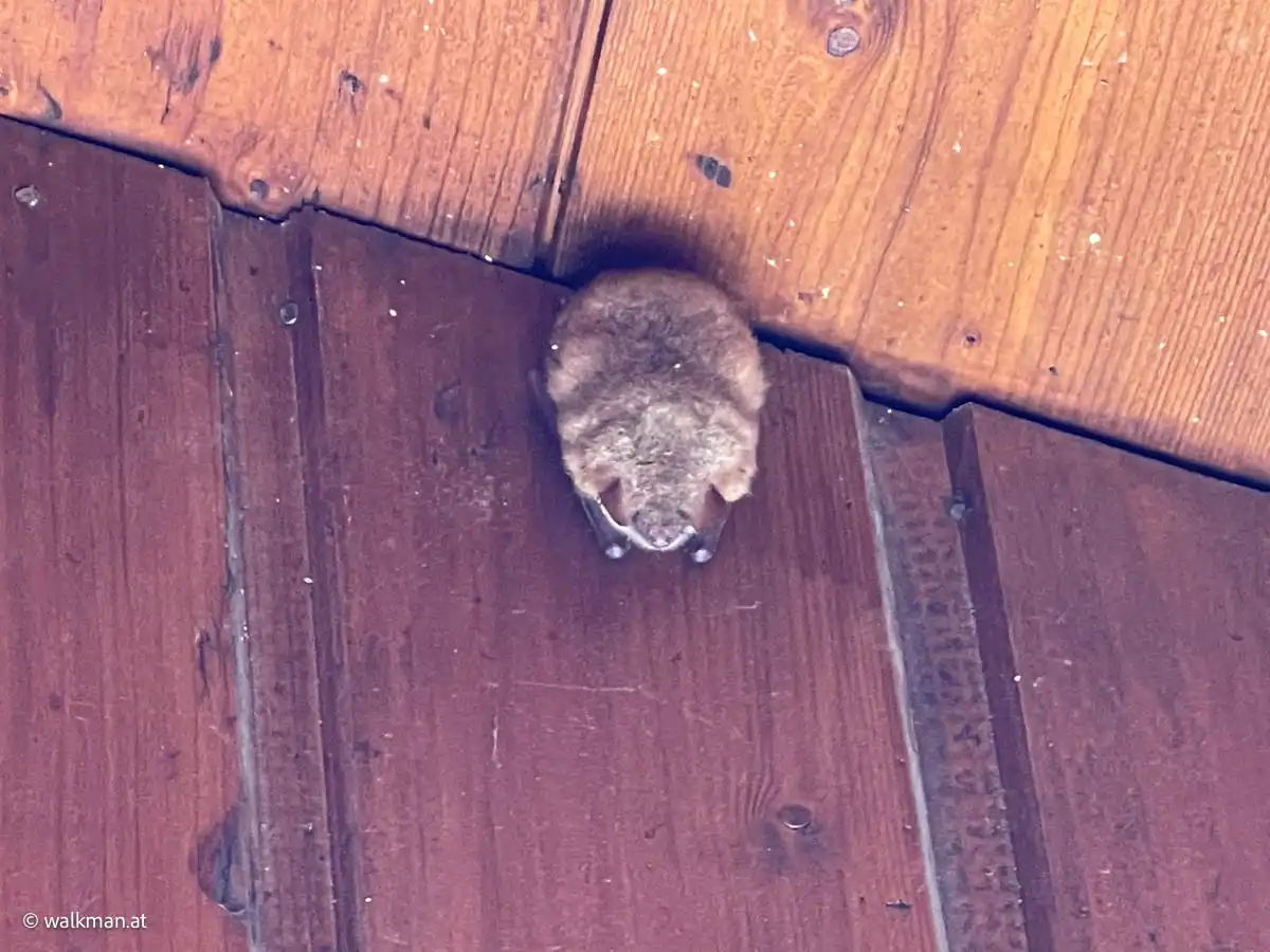 Der Ortsteil von Markt Neuhodis präsentiert sich uns heute, bei Kaiserwetter, von seiner ruhigen Seite. Ab und zu hören wir einen Traktor geschäftig rattern, ansonsten sehen wir nicht viel von den Einwohnern. Vielmehr nehmen wir das tierische Leben wahr. Beim Vorbeigehen versammelt sich gleich eine ganze Sippschaft an Flattervieh vor uns, hinter einem Zaun. Und unter dem Dach des Busshaltestellenhäuschens, an dem wir eine kleine Pause machten, entdecken wir eine schlafende Fledermaus.