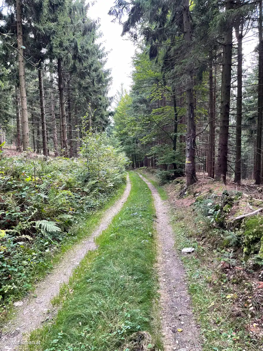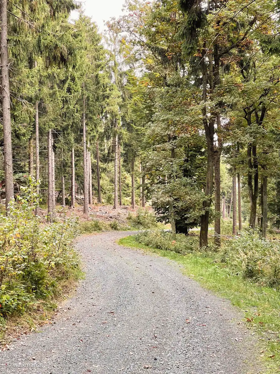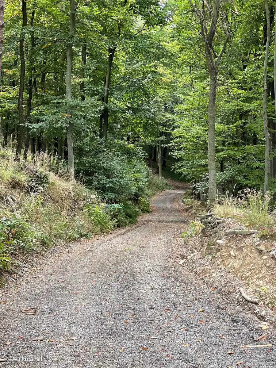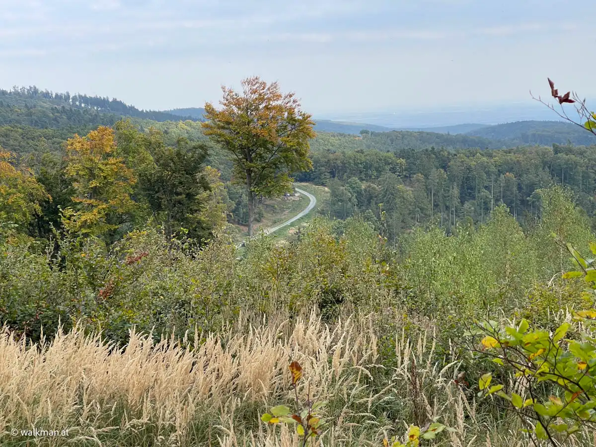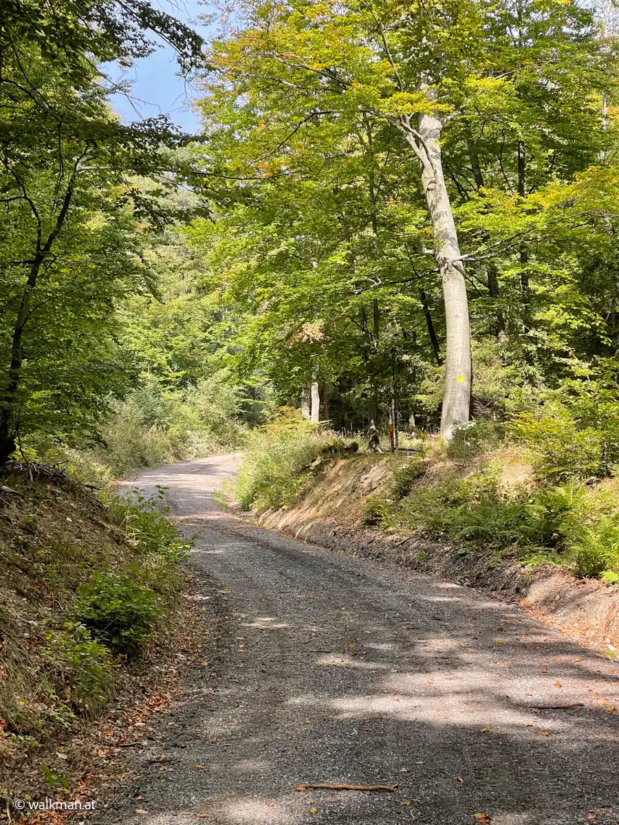 Bis dorthin ist es aber noch eine Strecke. Und die zieht sich hier zeitweise ganz schön. Anfangs hat man noch den einen oder anderen Panoramablick aus dem Wald raus übers Land, aber in weiterer Folge eigentlich nur mehr Waldweg mit Gefälle. Ist ja kurzfristig schön, geht aber langfristig auch ganz schön in die Wadeln.