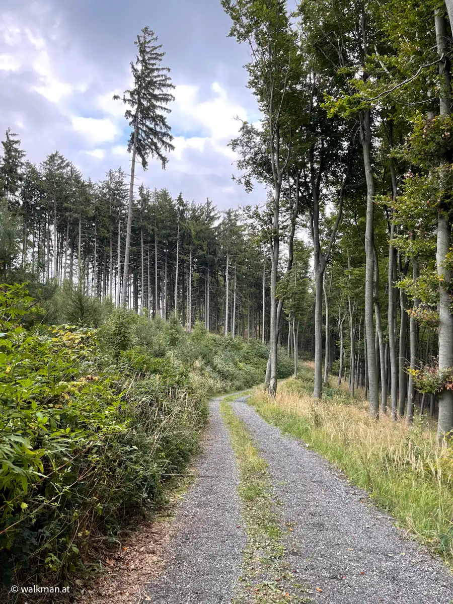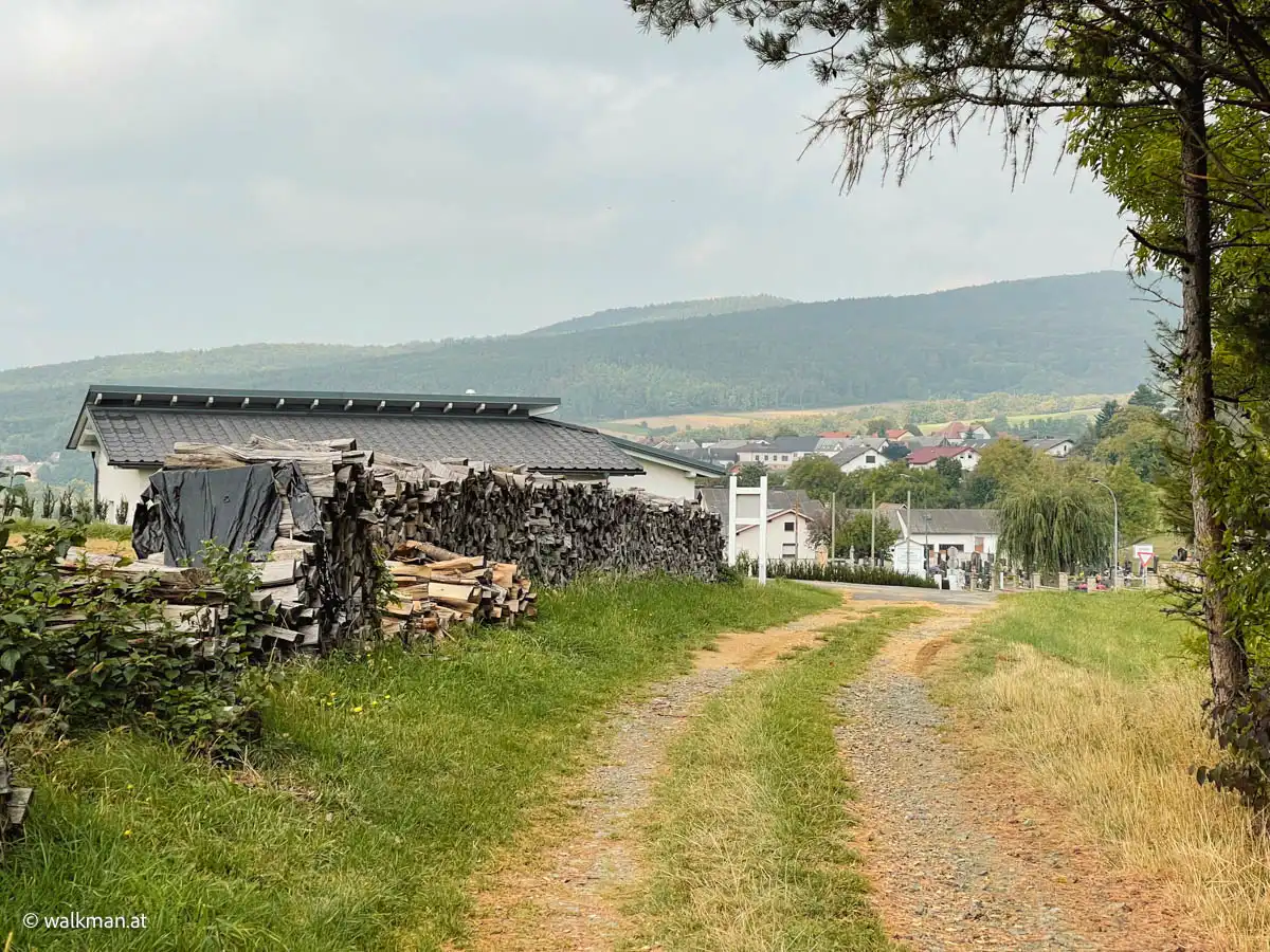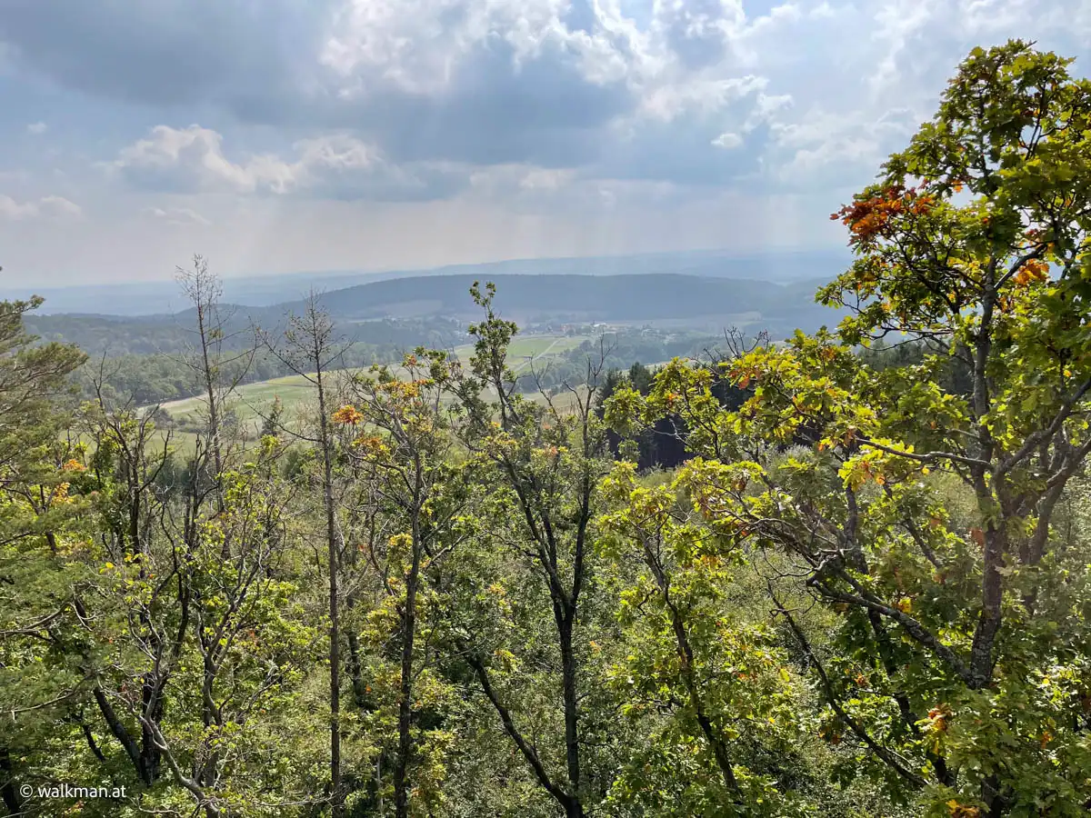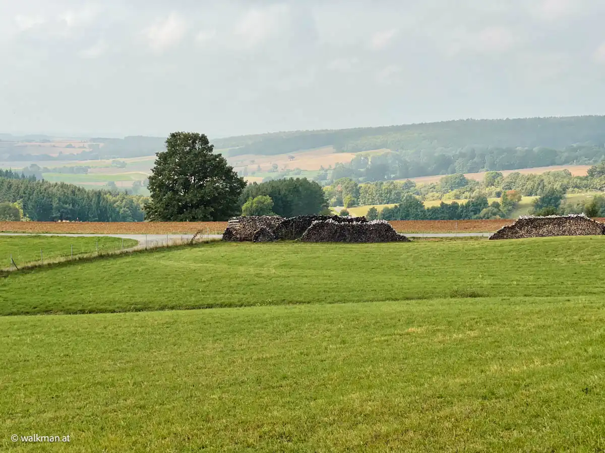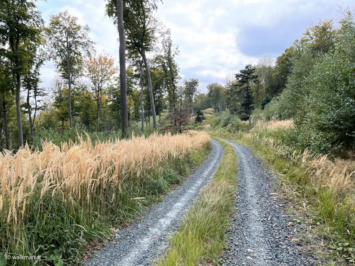 Bis dorthin ist es aber noch eine Strecke. Und die zieht sich hier zeitweise ganz schön. Anfangs hat man noch den einen oder anderen Panoramablick aus dem Wald raus übers Land, aber in weiterer Folge eigentlich nur mehr Waldweg mit Gefälle. Ist ja kurzfristig schön, geht aber langfristig auch ganz schön in die Wadeln.