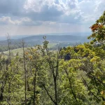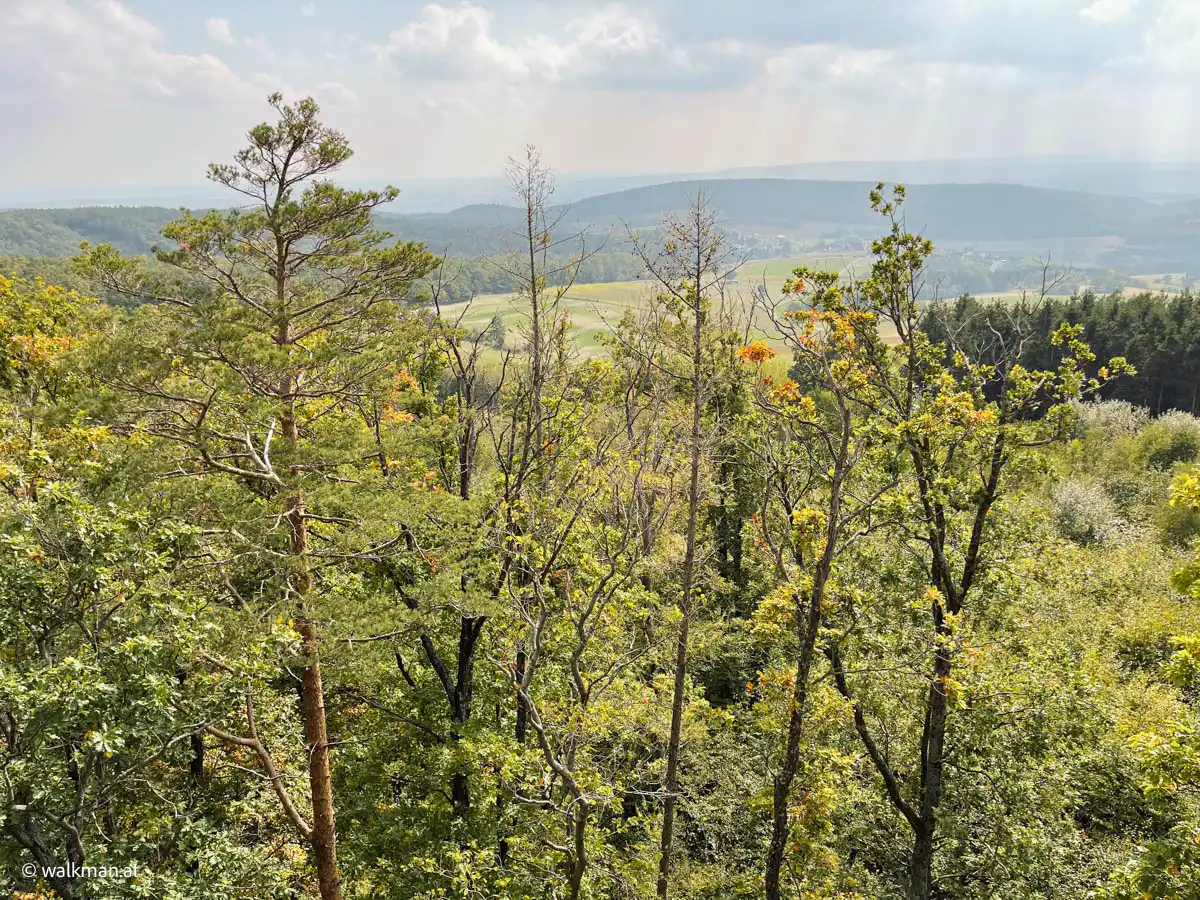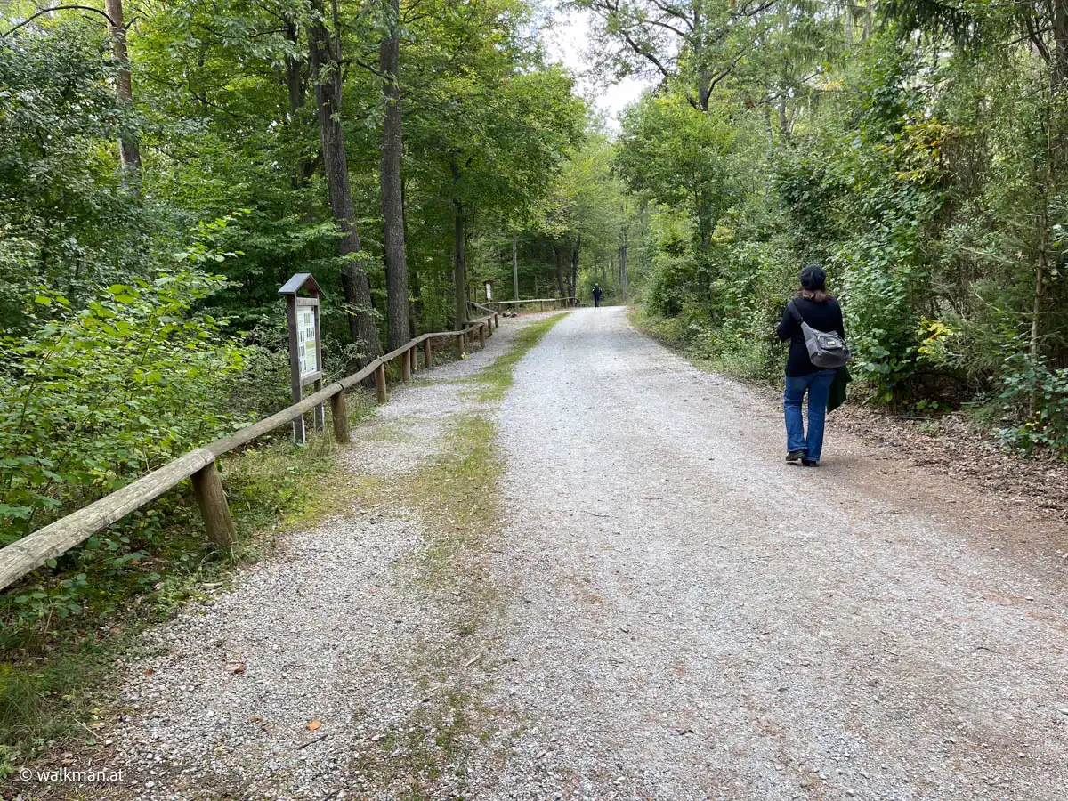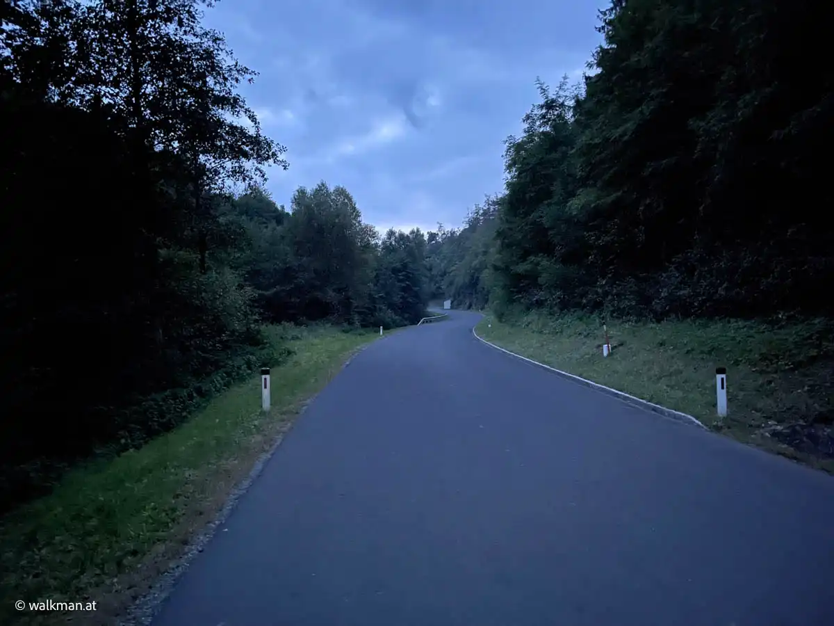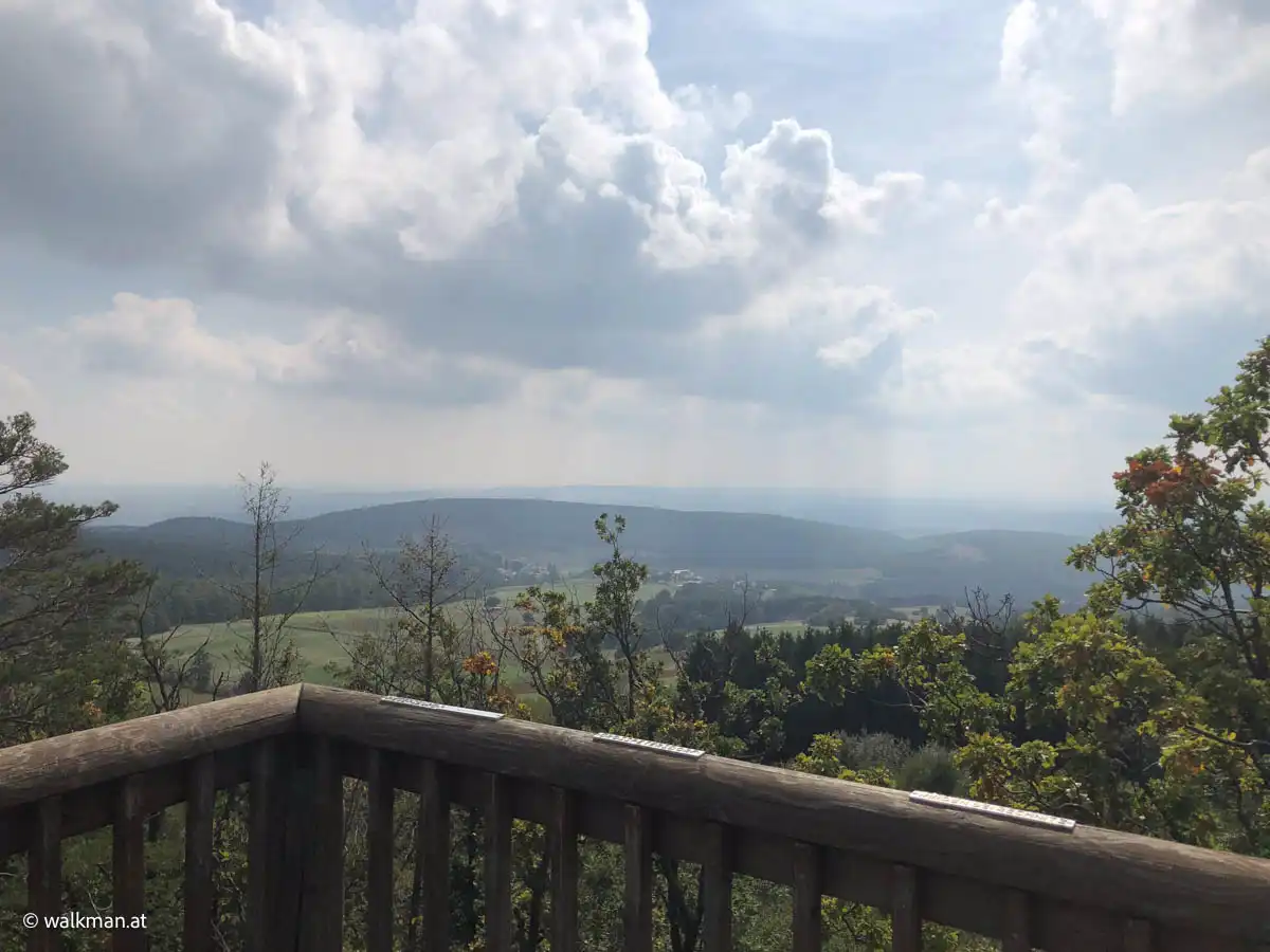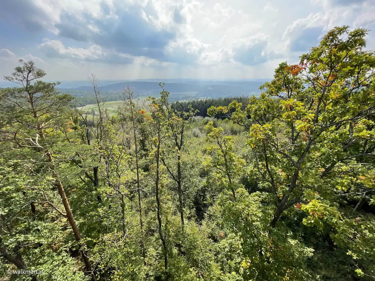 Bis dorthin ist es aber noch eine Strecke. Und die zieht sich hier zeitweise ganz schön. Anfangs hat man noch den einen oder anderen Panoramablick aus dem Wald raus übers Land, aber in weiterer Folge eigentlich nur mehr Waldweg mit Gefälle. Ist ja kurzfristig schön, geht aber langfristig auch ganz schön in die Wadeln.