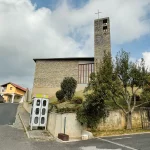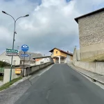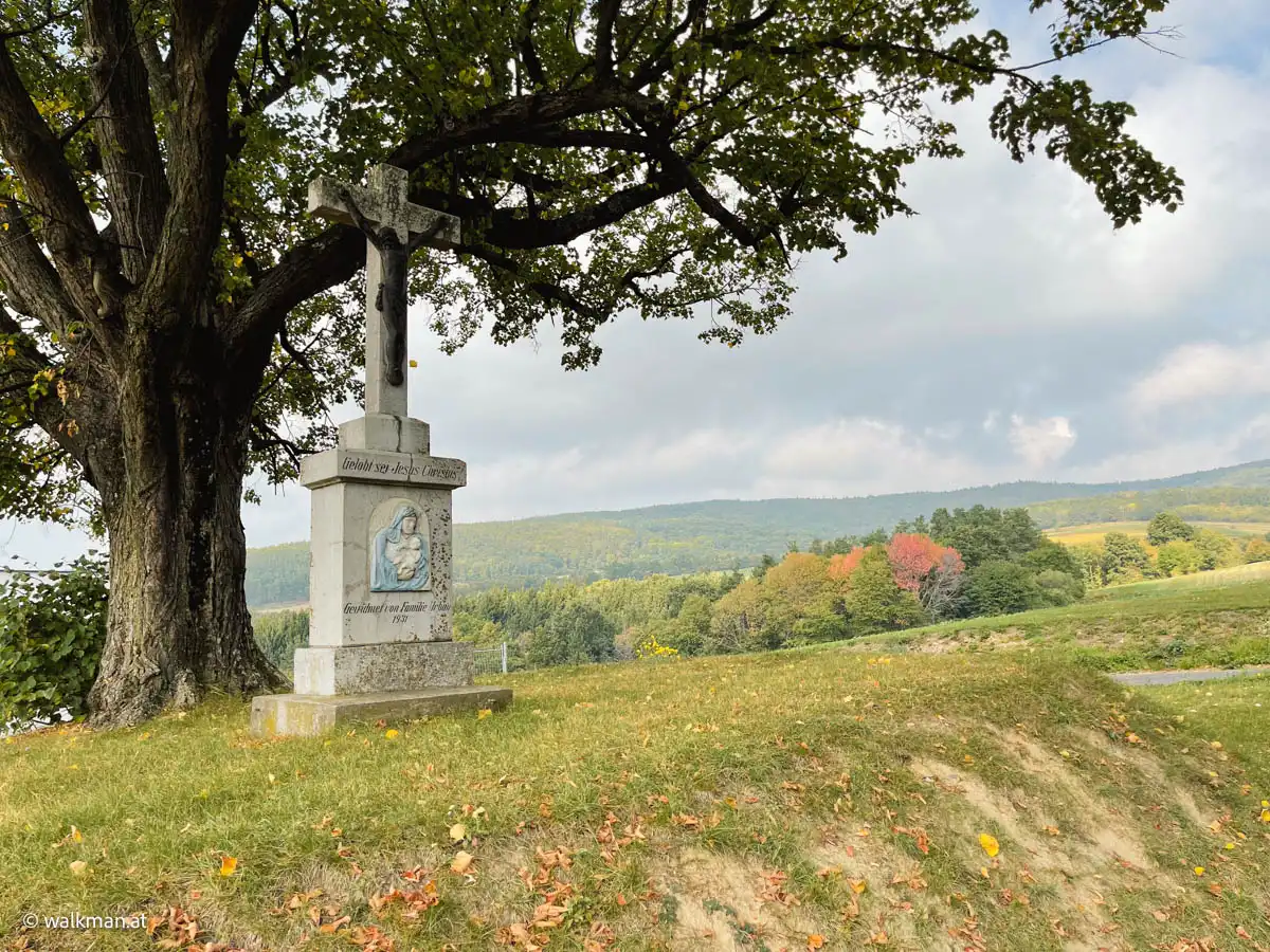 An der Kirche vorbei biegen wir rechts ab und wandern die Gasse nordwärts aus dem Ort hinaus. Am Ortsende werden wir in gleicher Art verabschiedet, wie wir empfangen wurden. Nur statt einem Friedhof steht hier ein Jesuskreuz. Amen. Die Strecke an sich geht hier langsam in die Wadeln in Form einer stetigen 10-15%igen Steigung.