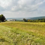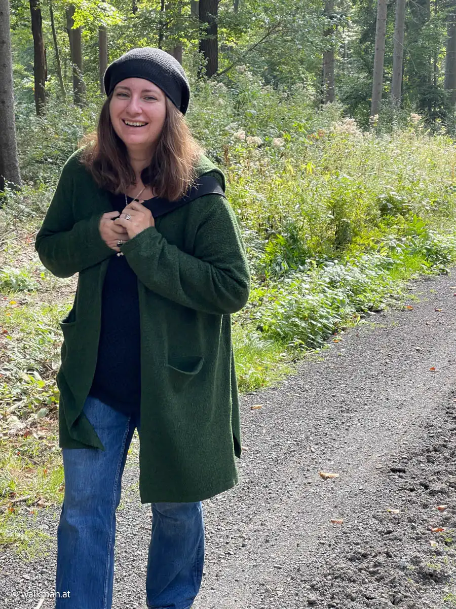 Wir nutzen die zehnminütige Pause ausgiebig zur Erholung. Wasser trinken. Und auch die Blicke über die Landschaft unter uns schweifen lassen. Schön ist sie, die Gegend. Geschwungene Hügel, die verstreuten Häuser der Ortschaften verteilt zwischen Wäldern und Wiesen. Typisch Südburgenland eben. Und das Wetter: Leicht bewölkt, aber hält.