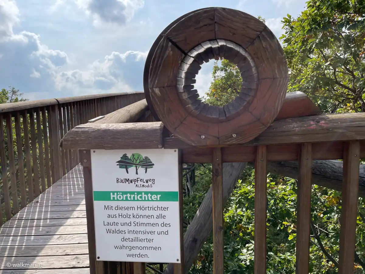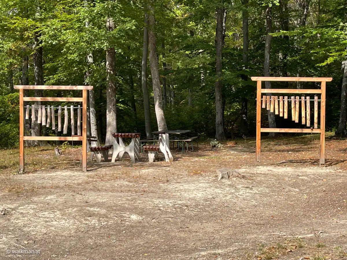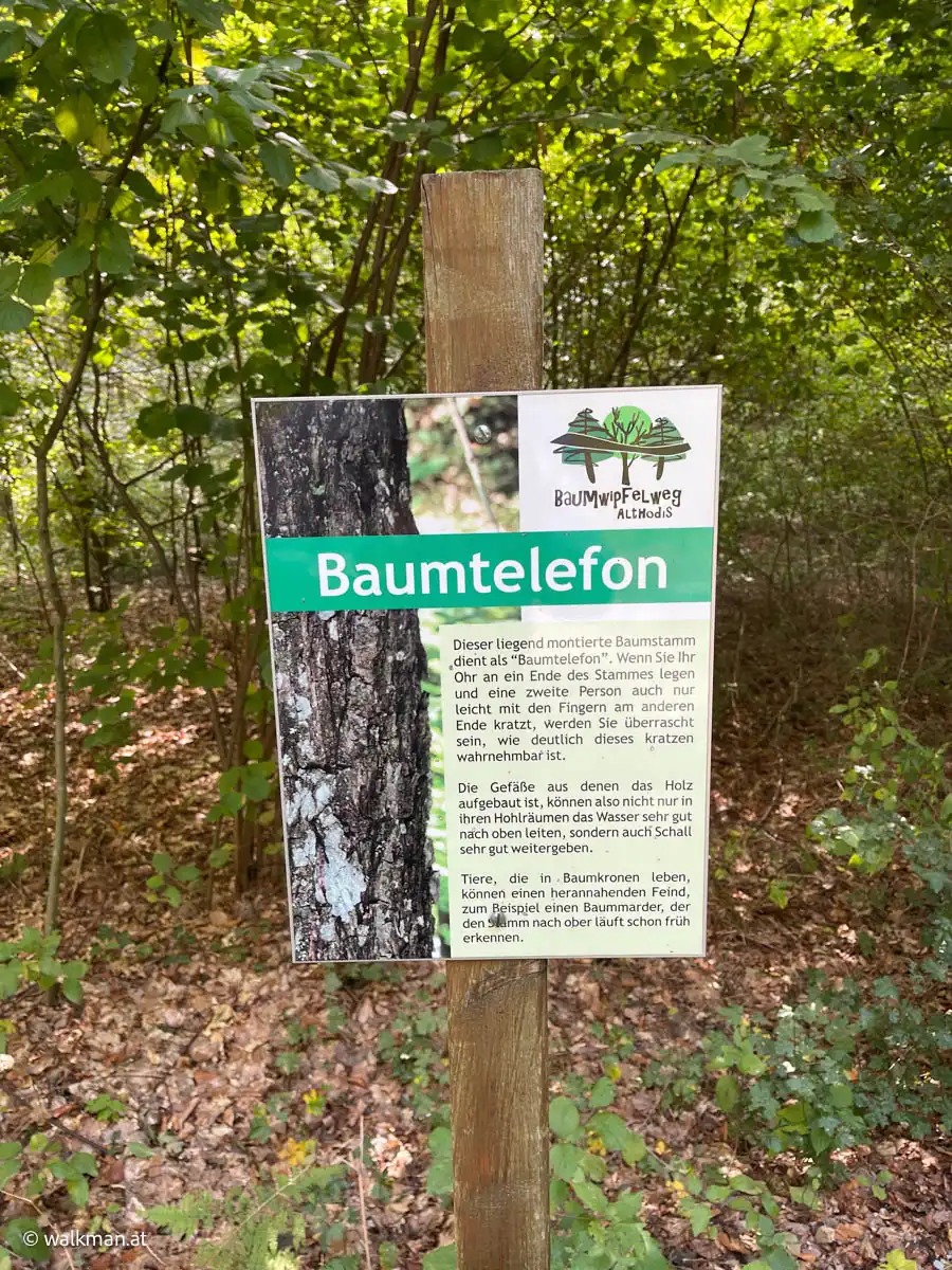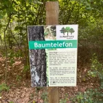 Unsere musikalische Ader wird bei einer Art Waldklavier aktiviert, während wir auf der nächsten Station die Technik eines vermutlichen Vorreiters des Smartphones ausprobieren dürfen: Wir „telefonieren“ mit dem Waldtelefon. So bleibt der, hier ebene Weg, kurzweilig und ehe wir uns es versehen, erblicken wir bereits das Café.