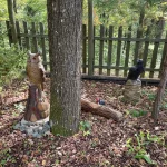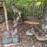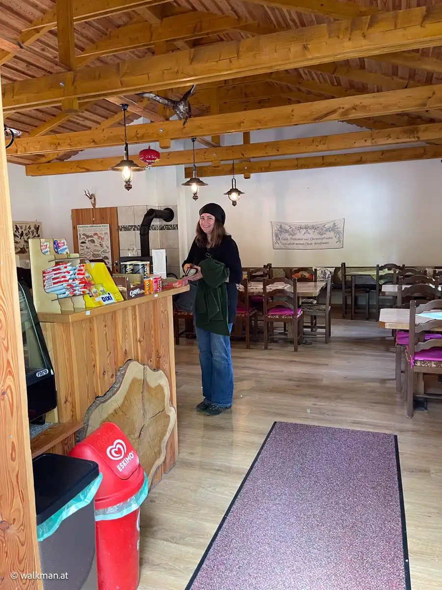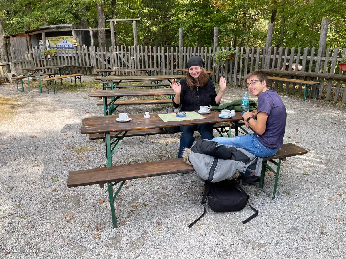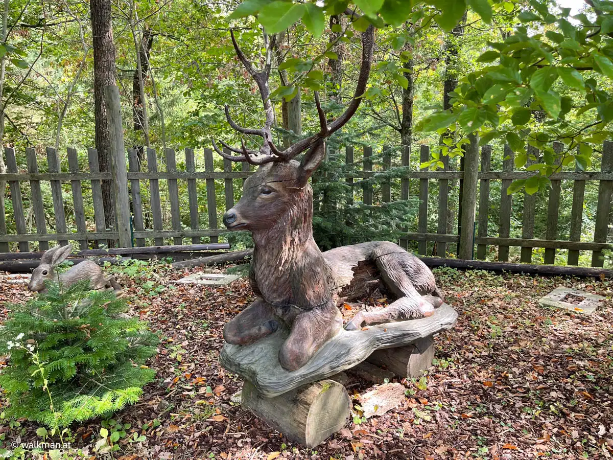 Wir kehren um und wandern die Rampen wieder retour, zurück zum Café. Hier machen wir nun mal eine längere Pause samt gerösteten Bohnen, mit heissem Wasser aufgegossen. Auch der Akku des Handys will aufgeladen werden ob der bereits etlichen geschossenen Fotos. Ein gemütliches Plätzchen ist das hier. Auf einer Waldlichtung, mit Schanigarten und etlichen Dingen zum Gucken, wie zum Beispiel geschnitzte Tierfiguren.