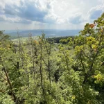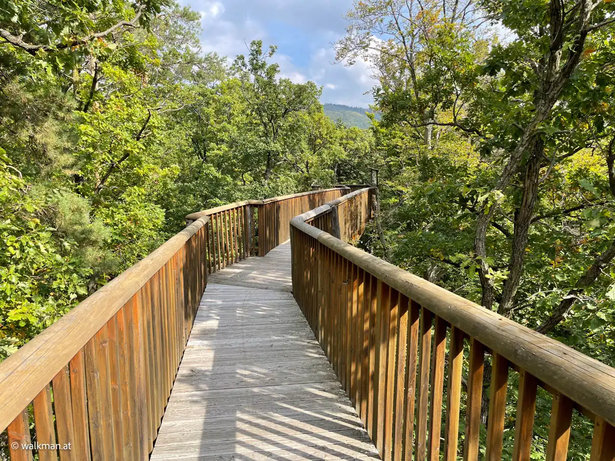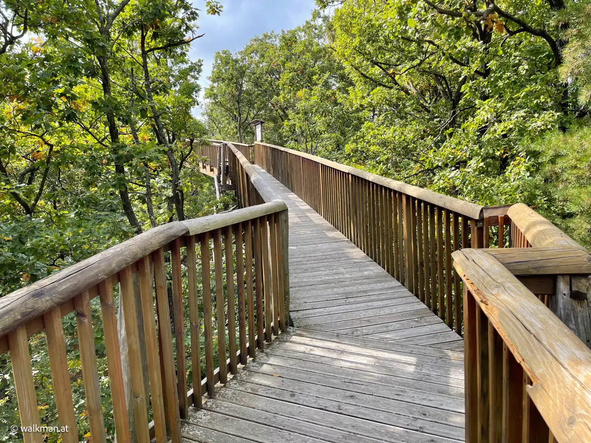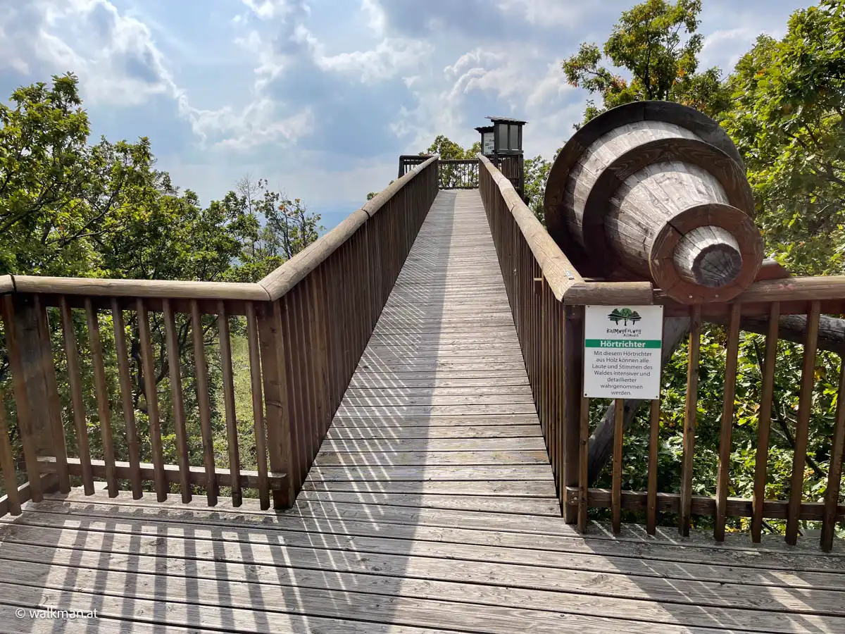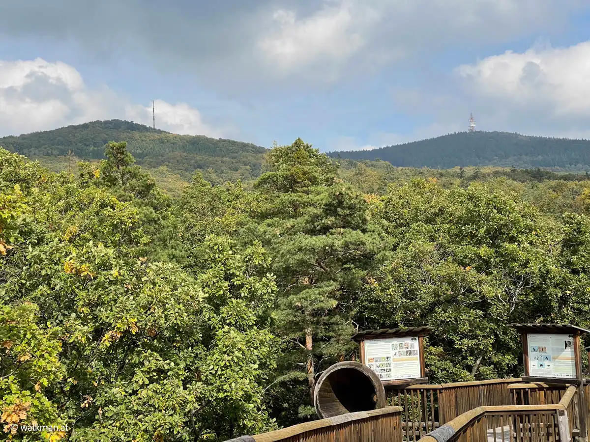 Zu guter Letzt sind wir dann genau an dem Ort, der diesem Weg seinen Namen verleiht: zwischen den Baumwipfeln, ganz oben. Vor uns breitet sich das Südburgenland aus. Mit einer weiten Sicht, bis wohin? Das gibt es auf den Info-Tafeln hier zu erfahren (alles wollen wir ja auch nicht verraten). Und auch unser Ziel erblicken wir von hier aus. Den Sender Hirschenstein, der weit über uns auf seinem, nach ihm benannten, Gipfel thront.