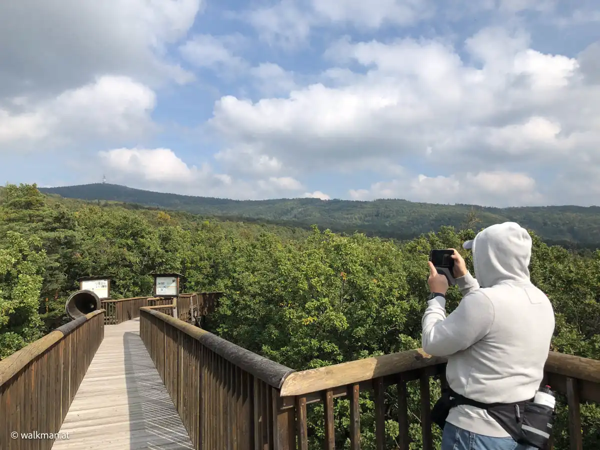 Pause gemacht. Neue Kräfte gesammelt. Weiter gehts. Wir haben noch viel vor. Unser erstes Highlight wartet schon auf uns: Der Baumwipfelweg. Die Strecke führt so weiter, wie sie vor der Pause geendet hat. Aber mittlerweile sind wir schon ziemlich weit oben, haben gut drei viertel der Steigung bis zum Highlight hinter uns gebracht und marschieren nun das letzte Viertel motiviert bergauf.