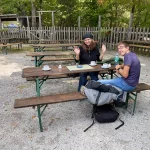 Geschafft. Neben dem Sender steht auch ein Gipfelkreuz und eine Bank mit Tisch zum Rasten. Und – ja natürlich – nutzen wir diese. Erschöpft und nass vom Schweiß, aber glücklich den Gipfel erklommen zu haben. Pause, Jause und Erholung. Drei Wörter die unsere nächsten 30 Minuten dominieren.