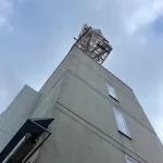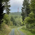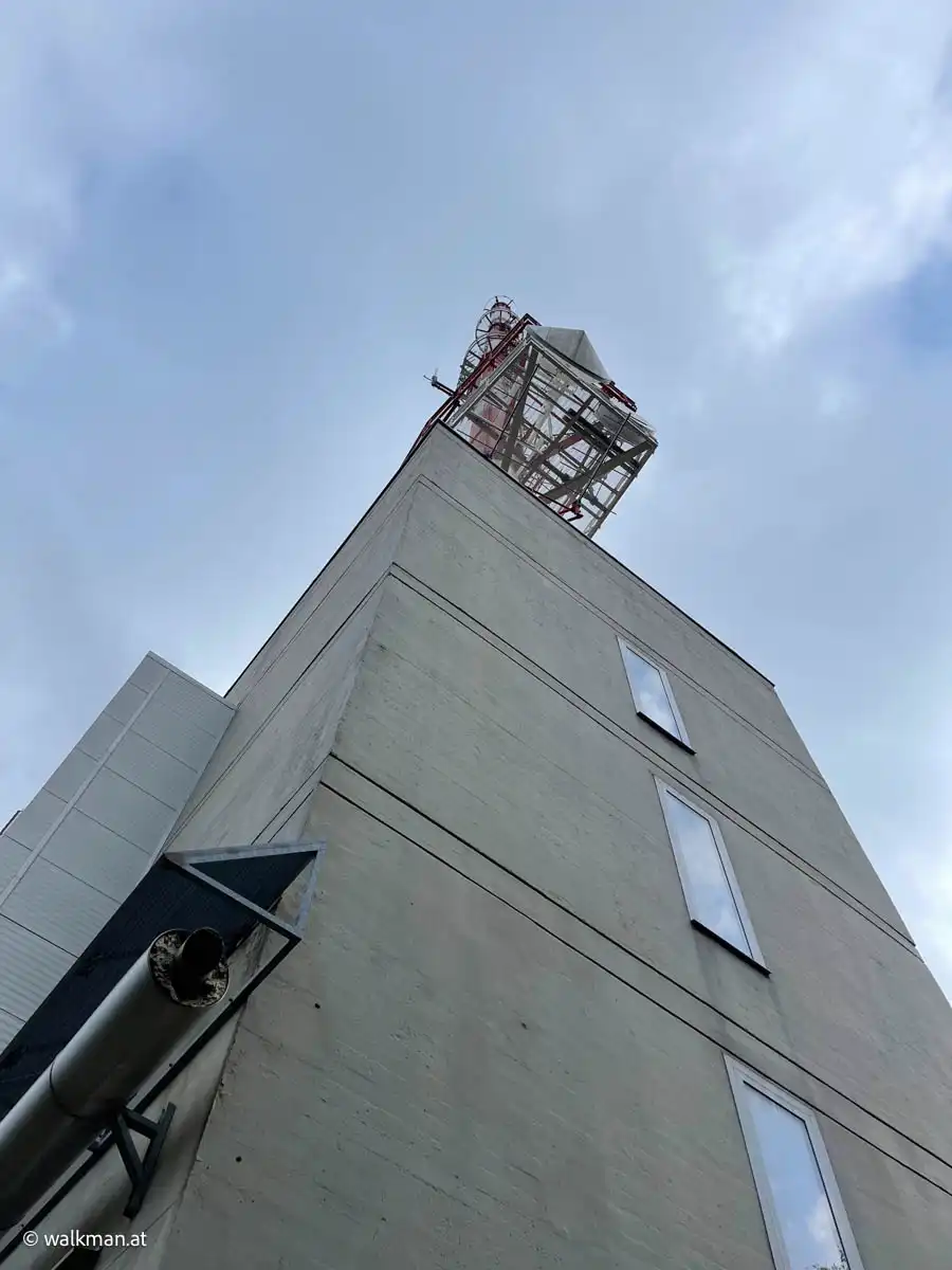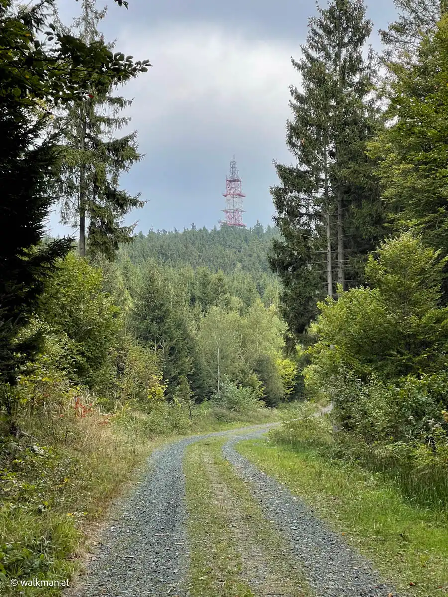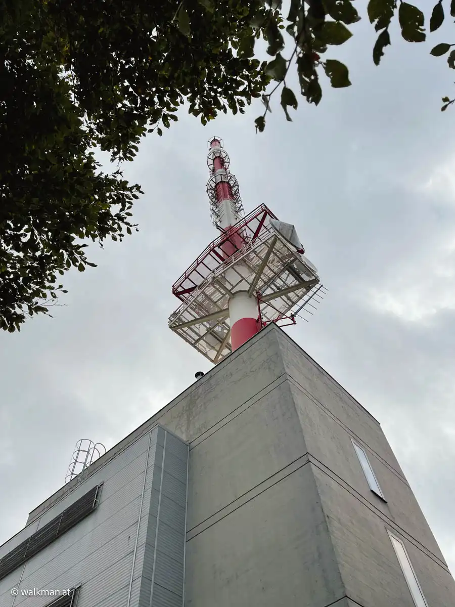 Ab und an reißen wir Witze, um uns gegenseitig zu motivieren. Nun ist es ja nicht mehr weit. Auch das Wetter hält heute. Zwar bewölkt aber kein Regen in Sicht. Das „Beste“ aber, kommt – wie immer – zum Schluss. Die letzten 100 Meter zum Sender hinauf haben es extra in sich. Diese verlaufen extra steil. Hier düsen auch mal, als Teil der Mountainbike-Strecke, Bikes runter. Aber dann ist es soweit. Zwischen den Bäumen hindurch konnten wir ihn ja schon sehen, dann konnten wir seine lauten Ventilatoren hören und jetzt, treten wir aus dem Wald raus und er steht vor uns.