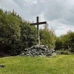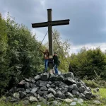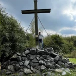 Mächtig ist er schon, der Sender. Besonders wenn man drunter steht und hinauf blickt, wird einem richtig schwindlig. Was man hier aber gänzlich vermisst ist eine Aussicht. Die gibt es hier nicht. Die Senderanlage steht mitten im Wald umrandet von Bäumen. Aber wie gesagt – ein Gipfelkreuz. Das von uns natürlich für etliche Fotos, mit etlichen Grimassen, als Hintergrundmotiv benutzt wird.