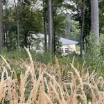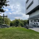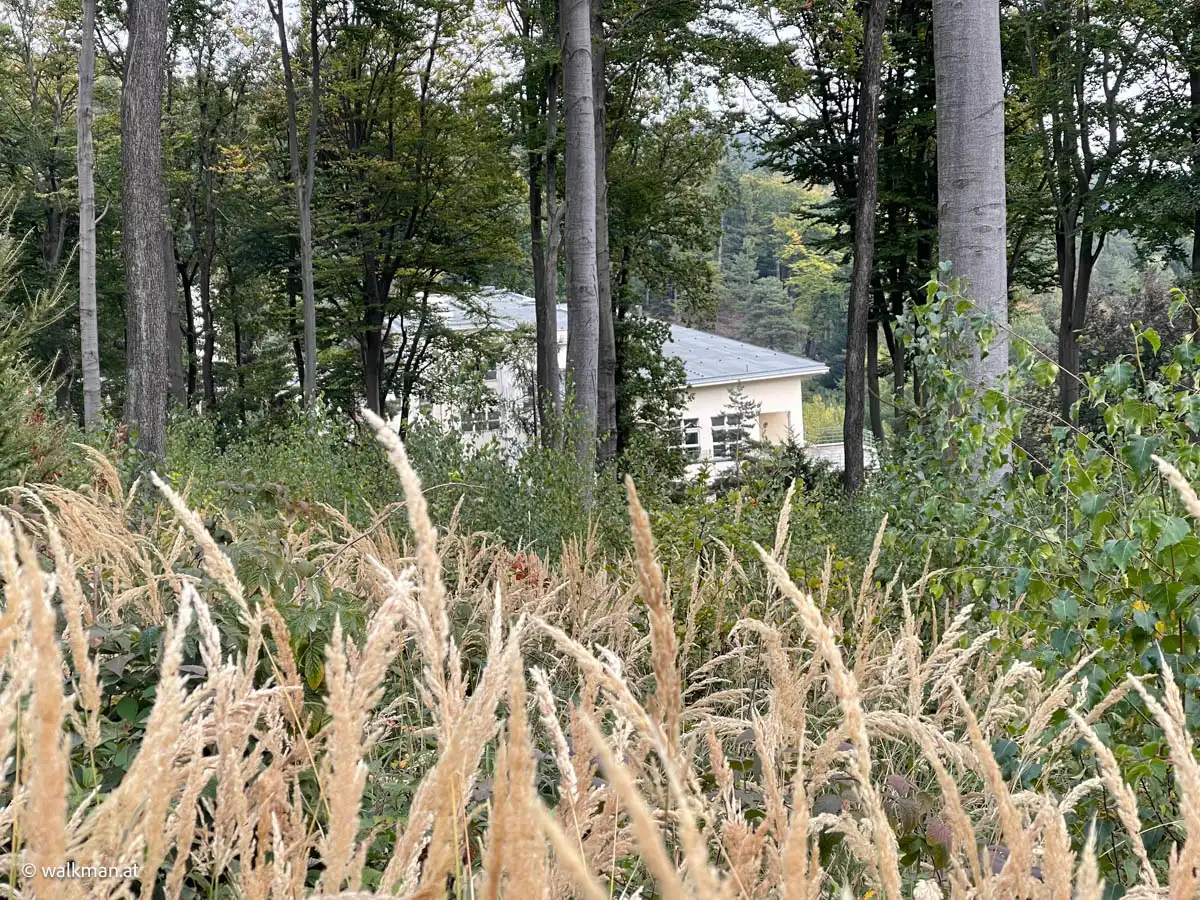 Durch die Bäume hindurch zeichnet sich der Komplex ab. Sieht irgendwie richtig gruselig aus und wäre durchaus geeignet für einen Horrorfilm. Wenn man sich die leeren Gänge vorstellt, wo der Wind leise durch pfeift und den einen oder anderen Vorhang bewegt. Vielleicht stehen auch noch diverse Betten und Instrumente rum.