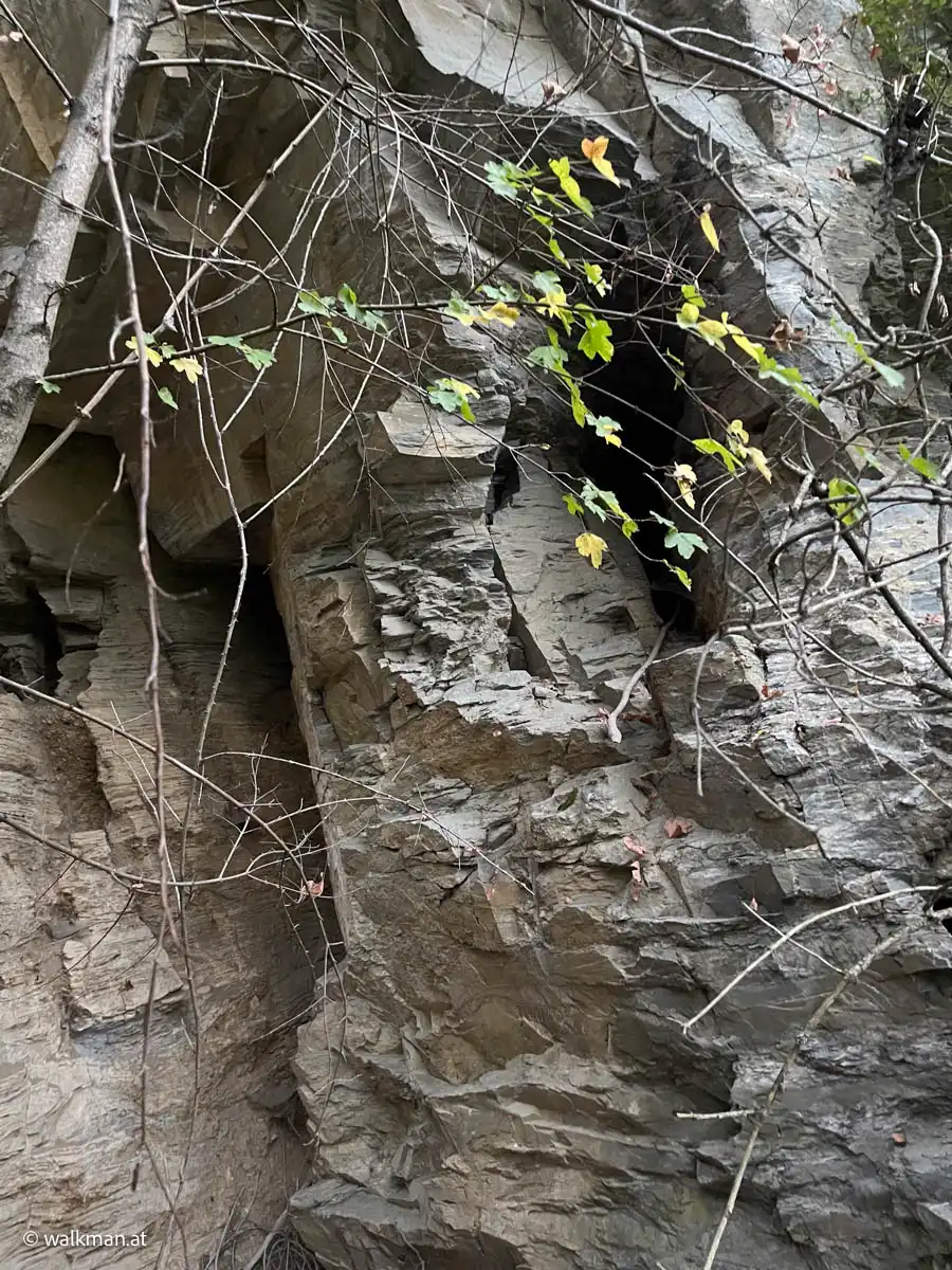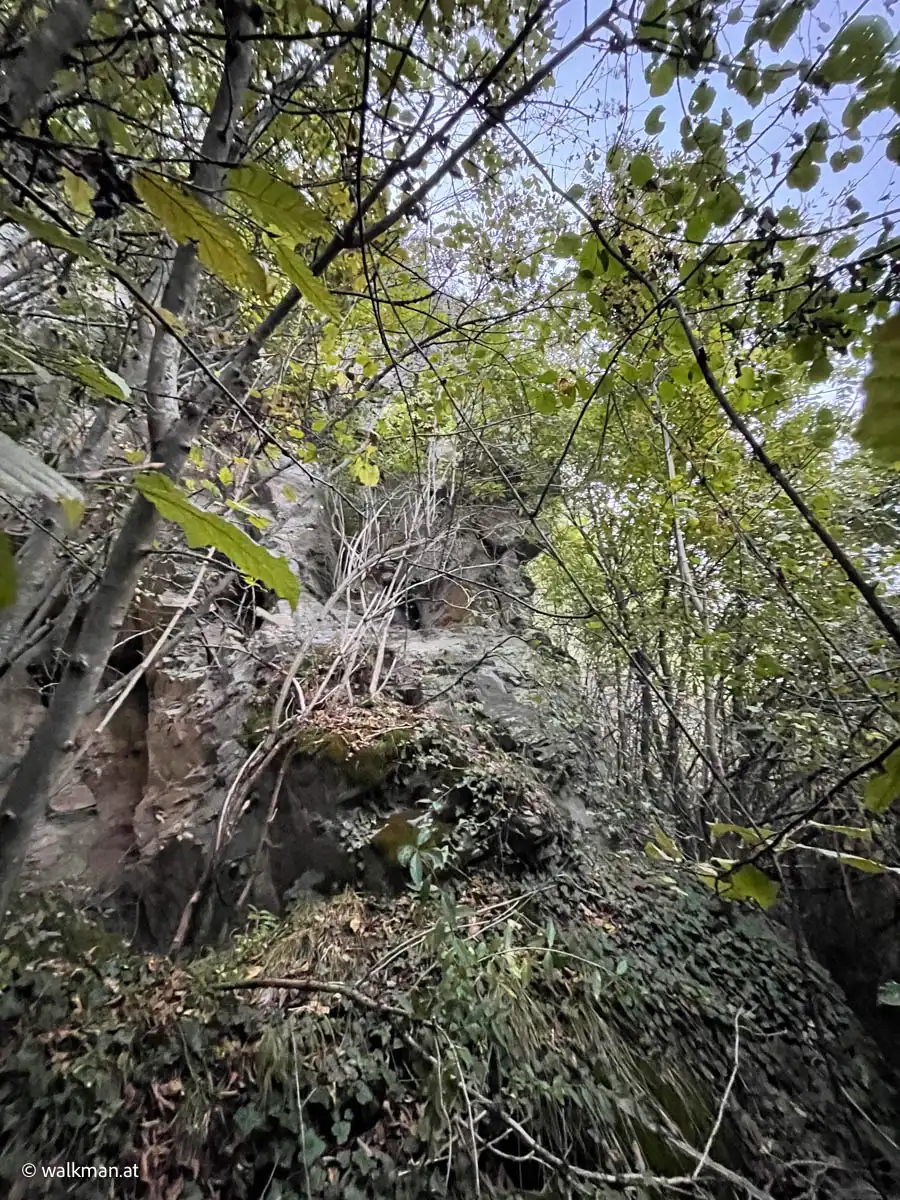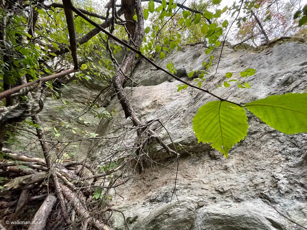 Mehr noch. Um den genauen Platz der auf der Karte angegeben ist zu erreichen, ist eine Klettertour durch den Wald notwendig. Steil bergauf. So zumindest unsere Erfahrung, als wir am Weg standen und der Punkt irgendwo oben am Hang, an der Felswand sein sollte. Meine Gefährtin war sichtlich ein wenig enttäuscht. Diese Kletterung konnte sie nicht mitmachen. Ihr Fuß machte Manuela auch hier einen Strich durch die Rechnung.