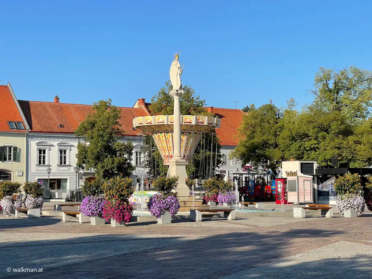 Ein paar Minuten weiter, beim Schnitzelcorner (nein, heute gibt es kein Schnitzel) biegen wir links ab und halten uns Richtung Zentrum. Vorbei an begrünten Straßenrändern und schönen Brunnen spazieren wir nun gemächlich dahin und schenken den Gebäuden ringsum vermehrte Aufmerksamkeit.