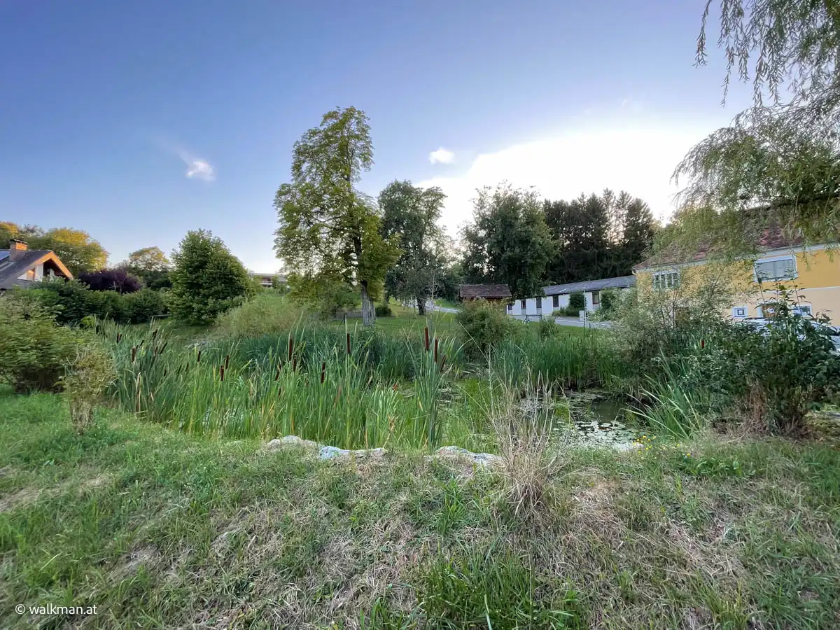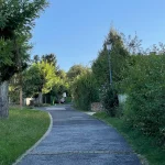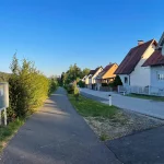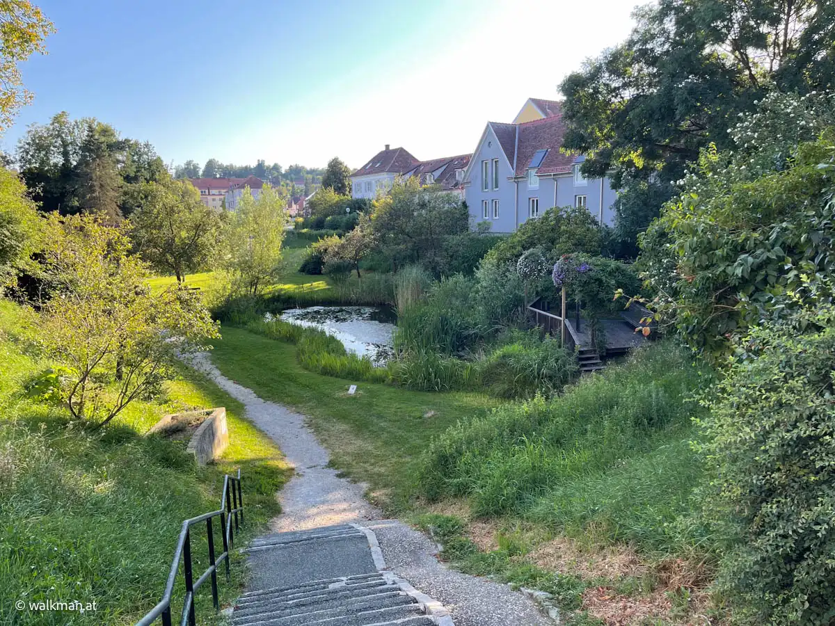 Wir verlassen das Kapellen-Areal und wandern, wie vorher vom netten Bewohner beschrieben, Richtung Norden weiter. Durch die adrette Parkanlage einer Wohnsiedlung hindurch. Auf die Straße hinaus. Hier halten wir uns nun links und sind gleich beim oberen Ende, des zuvor erwähnten städtischen Parks (mit Teich), angelangt.