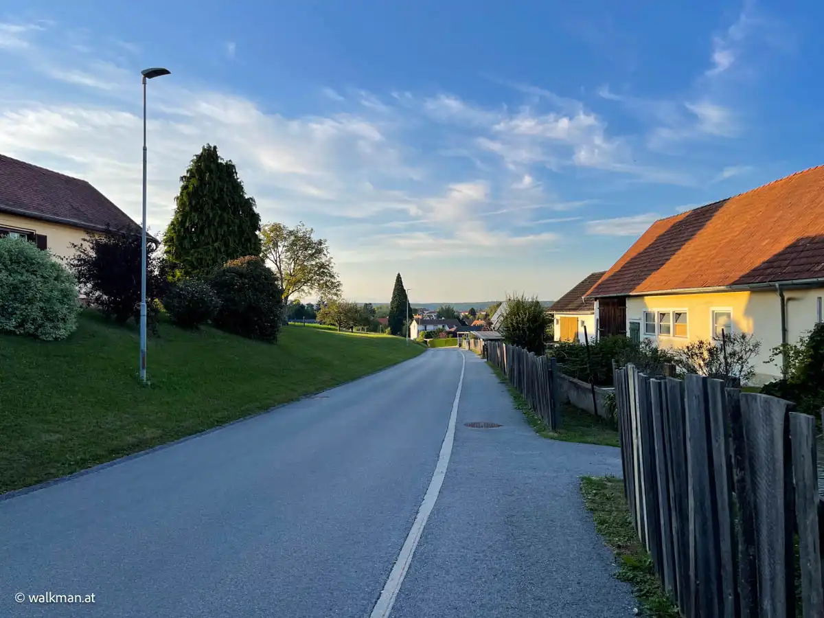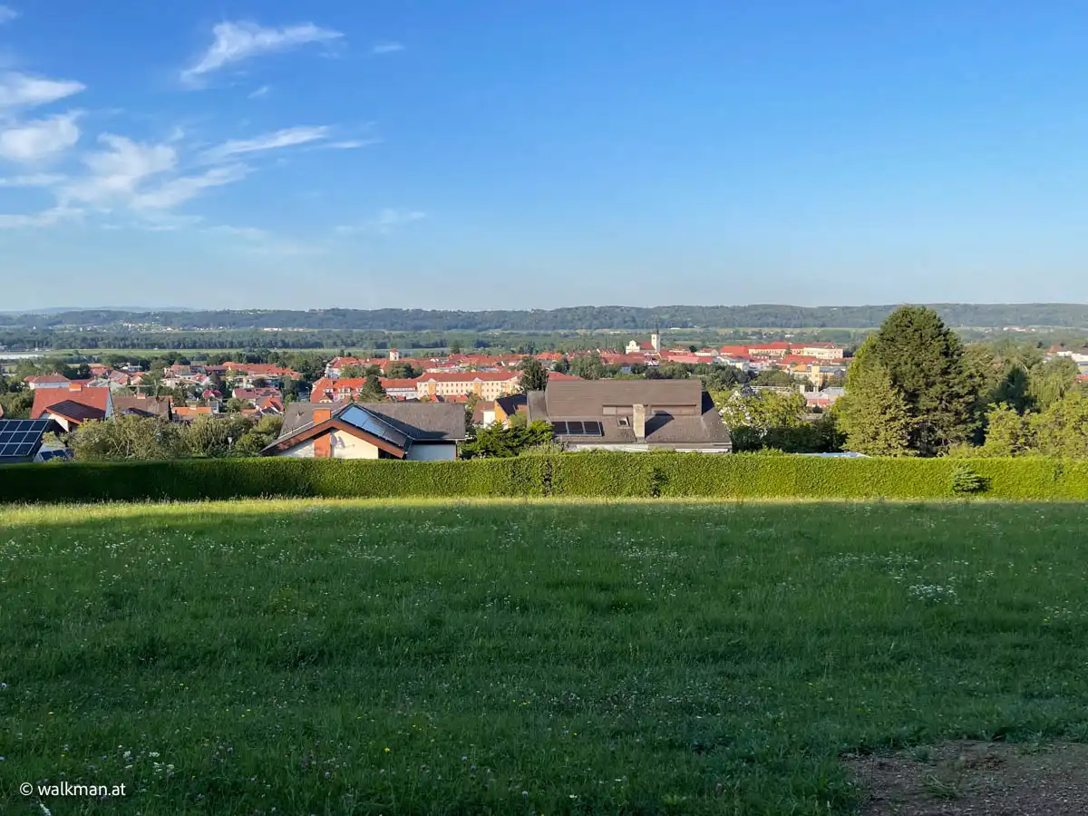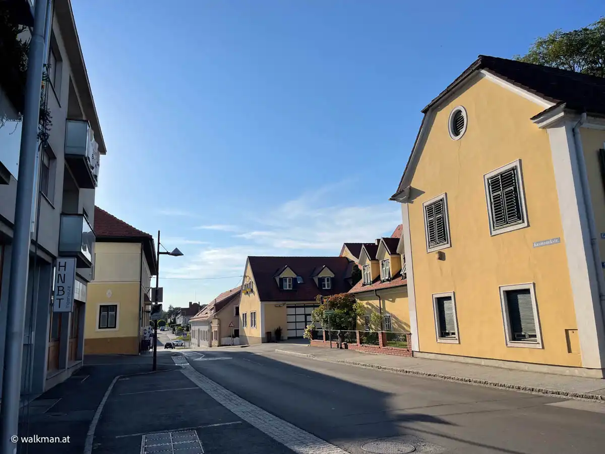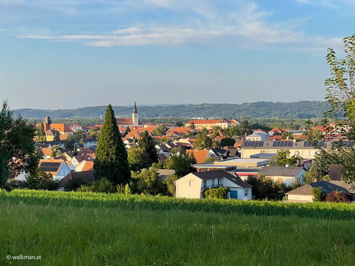 Aus der Parkanlage am Dreikreuzberg hinaus, halten wir uns an der Gerichtsbergenstraße links und wandern, dem Straßenverlauf folgend, auf unserer Route weiter. Der zweite Teil ist der angenehmere der beiden Hälften. Hier geht es fortan nur mehr bergab, bis zu unserem Ziel, dem Hauptplatz in Fürstenfeld.
