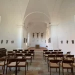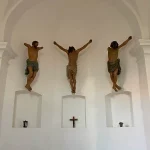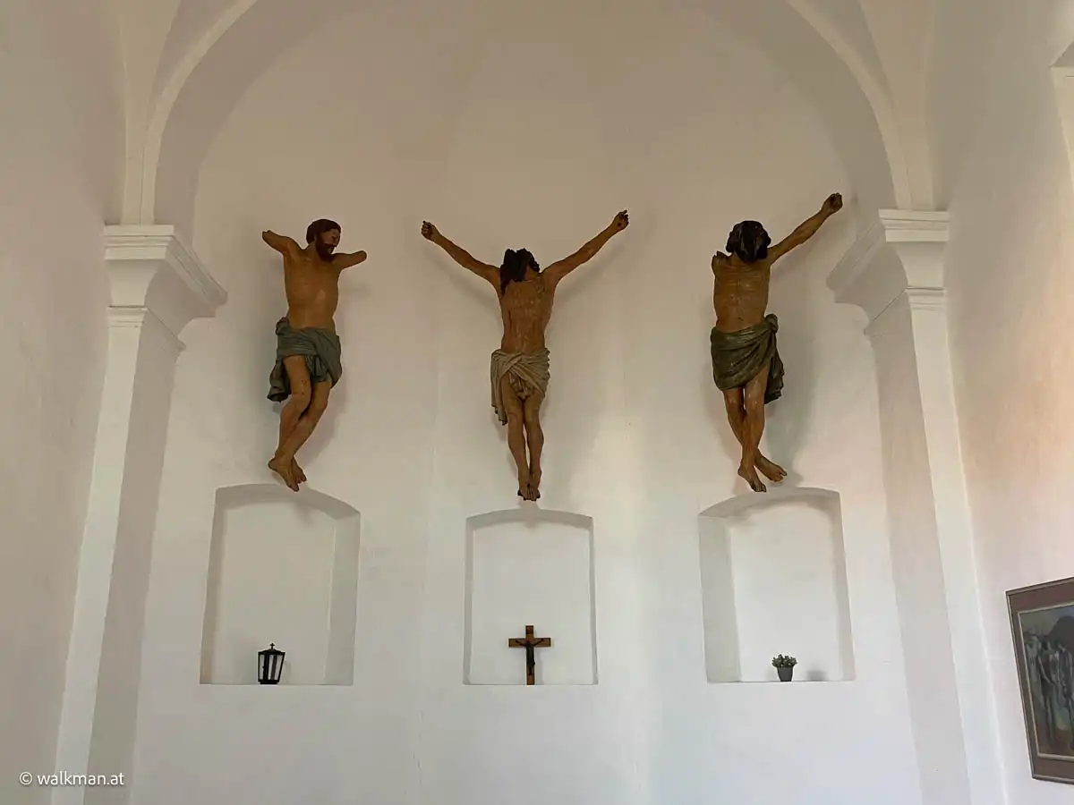 Ein paar Bankreihen. An den Wänden ein paar Holzschnitzereien. Und hinter dem schlichten Altar drei Kreuze an der Wand. Unspektakulär, einfach, aber schön. Und vor allem angenehm kühl. Das ist meine Wahrnehmung des Gebäudes.