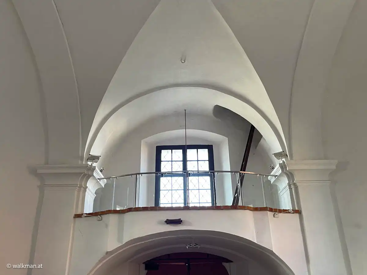 Und beim Umdrehen entdecke ich auch einen innenliegenden Balkon über dem Eingang. Mit einer Leiter oben, die sichtlich auf das Dach führt?! Oder um beim Kirchlichen zu bleiben: „In den Himmel?“ Mein Humor eben. Aber um das auch genau zu titulieren, es dürfte sich beim „Balkon“ um eine „Chorempore“ handeln!? Habs gerade versucht beim Schreiben zu googeln. Hab ich auch noch nie gehört, aber scheint so zu sein. Für meine Unwissenheit ist es schlicht und einfach ein Balkon.