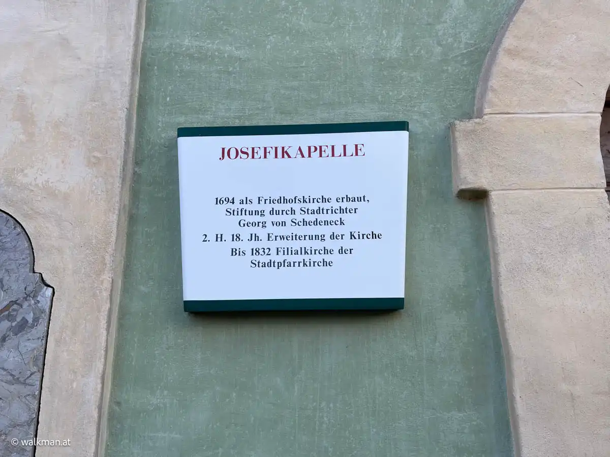 Also halten wir uns hier an der Straßenführung und spazieren diese weiter entlang bis zur Josefigasse. Hier nun links rein. Die gleichnamige Kapelle taucht auch bald zwischen zwei Häusern auf. Allerdings wissen wir jetzt nicht: Dürfen wir hier rein? Am Anfang des Weges ist ein Schild angebracht: „Privatgrund“.