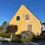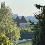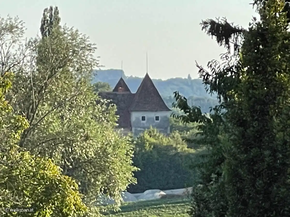 Aber zuvor queren wir noch die „Schlossgasse“. Das mag was heißen oder? Und beim genaueren Hinsehen entdecken wir es auch. Oder zumindest Teile davon. Die Dächer des Schlosses „Welsdorf“. In weiterer Ferne. Auch das werden wir noch erkunden. Irgendwann.