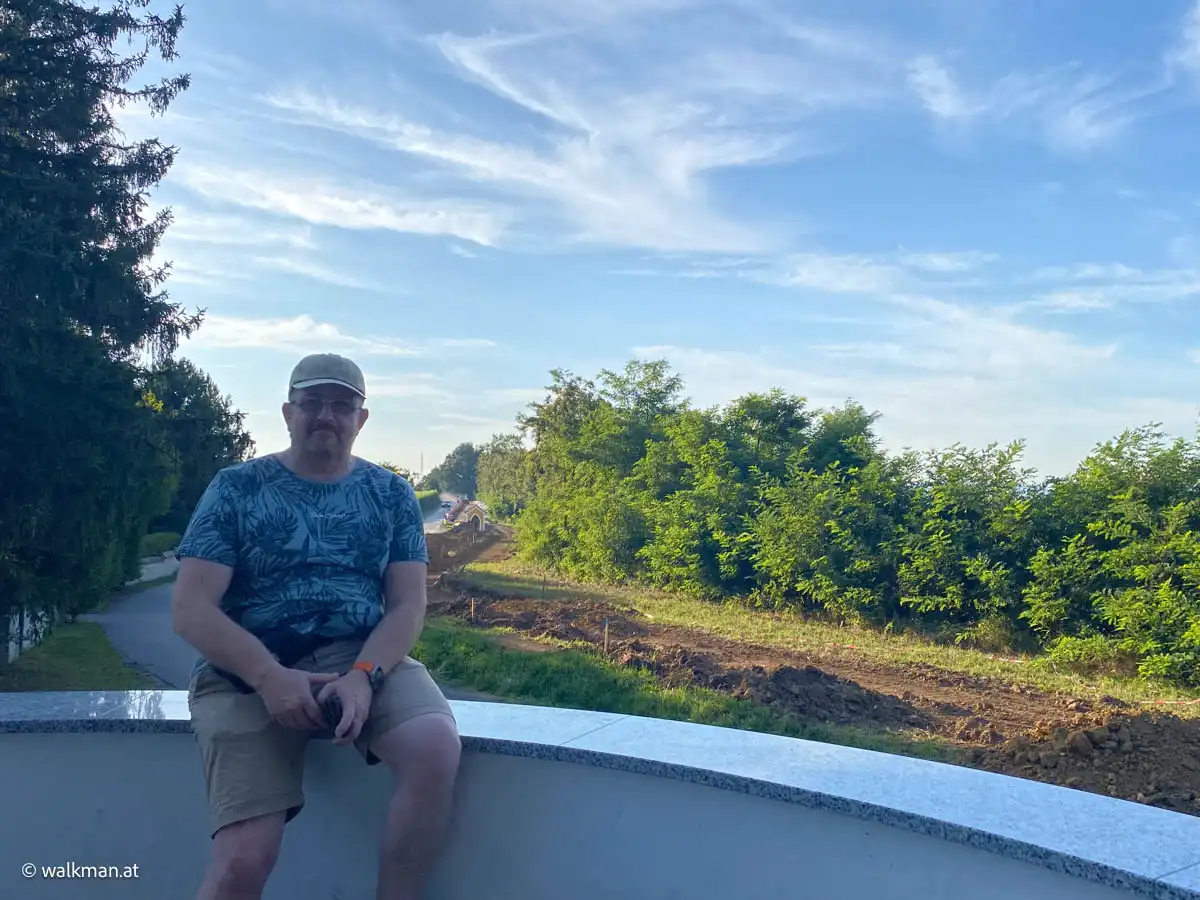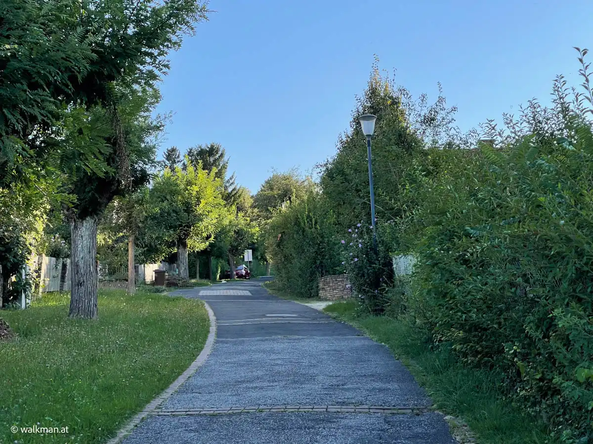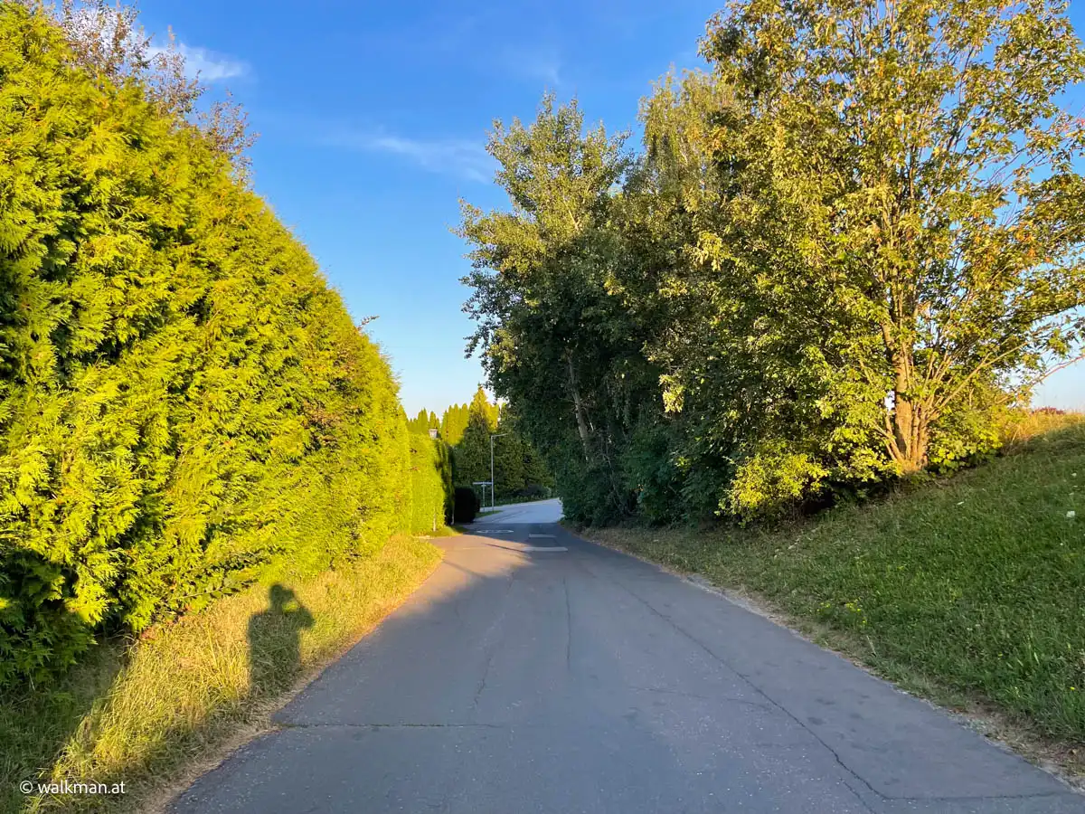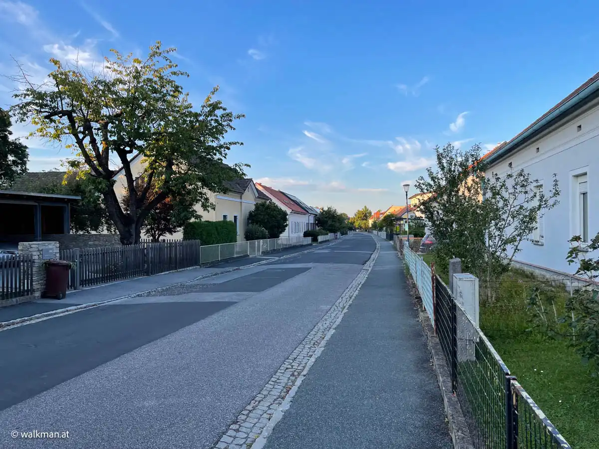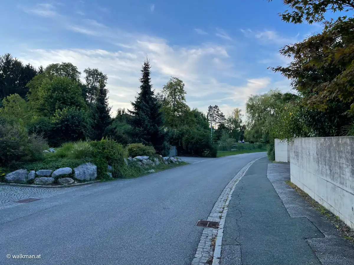 Aber es geht für Manuela. Wir spazieren hier zwar wesentlich langsamer, aber stetig hinauf. Hin und wieder eine kleine Verschnaufpause einlegend. Aber es geht. Von Vorteil ist jetzt sicher auch der Schatten. Ob der Uhrzeit, um 19 Uhr herum, steht die Sonne bereits ziemlich tief hinter den Häusern. Und die Temperaturen sind jetzt gerade auch wirklich angenehm. Perfektes Wanderklima.