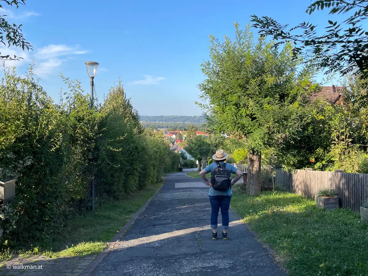 Schnellen Schrittes sind wir auch bald an der Kreuzung angelangt, an der wir nun scharf links hinunter müssen. Wir verabschieden uns in Gedanken vom Ortsteil „gerichtsbergen“ und tauchen ein in die ruhigen, grünen Gassen der Stadt, abseits vom Zentrum.