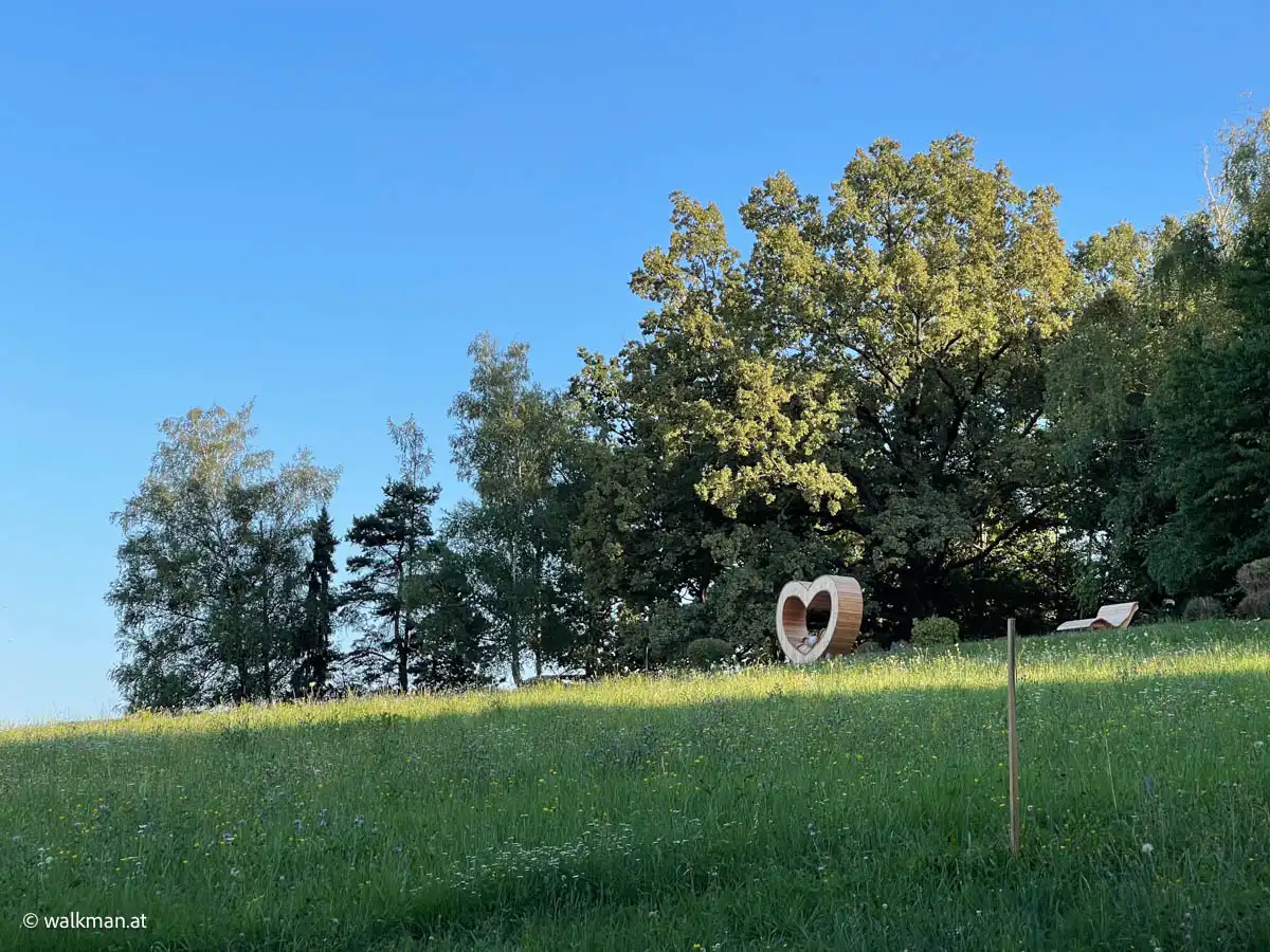 Exakt das machen wir jetzt auch: Den Moment leben. Aussicht, Stimmung, das Jetzt einfach in uns aufsaugend. Mit einer gehörigen Portion Genuss und Entspanntheit. So soll es sein. Und auch ein grosses hölzernes Herz ist hier installiert. In das man sich sogar reinlegen kann.