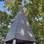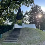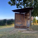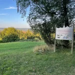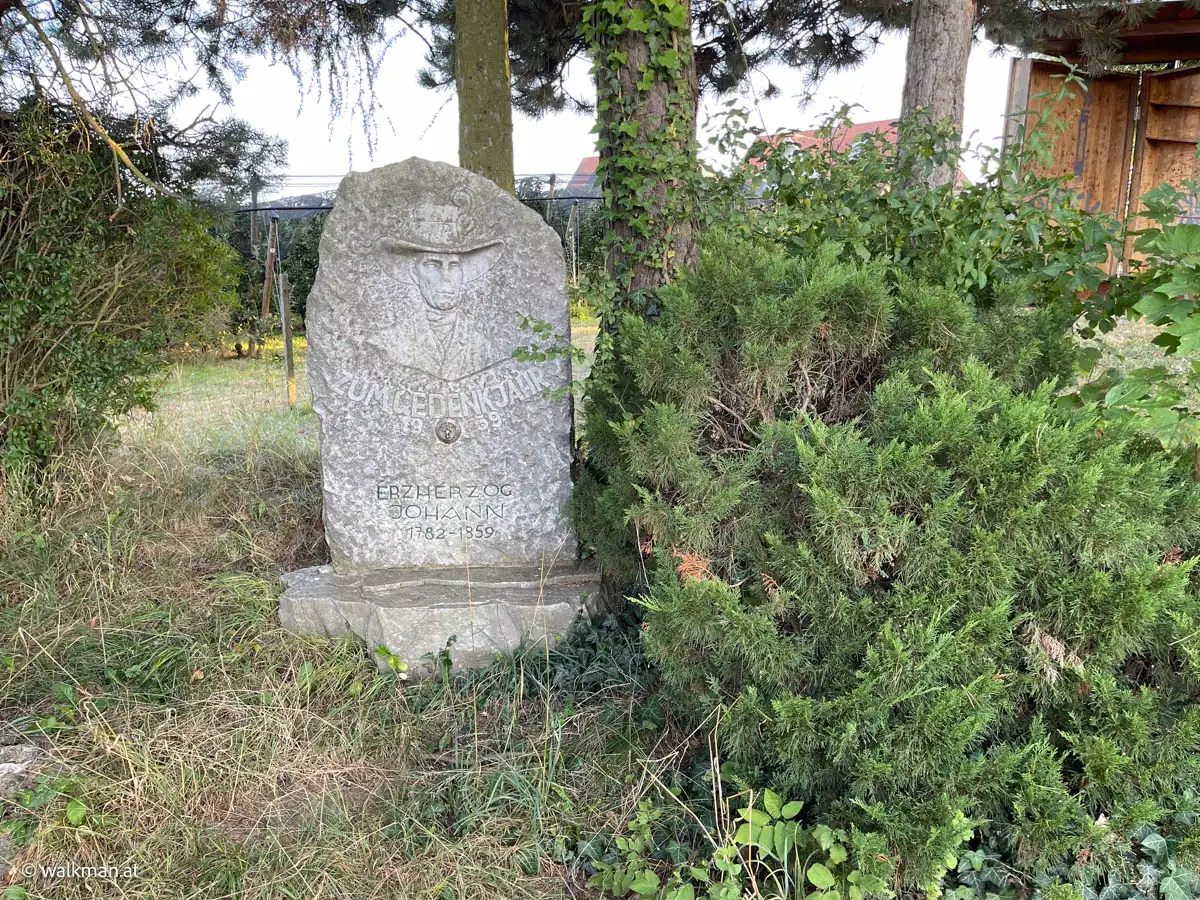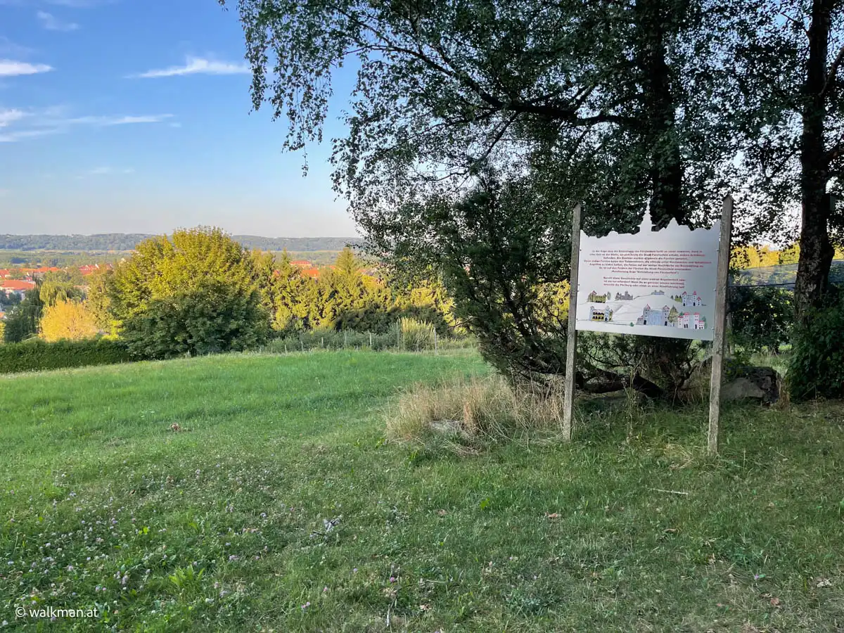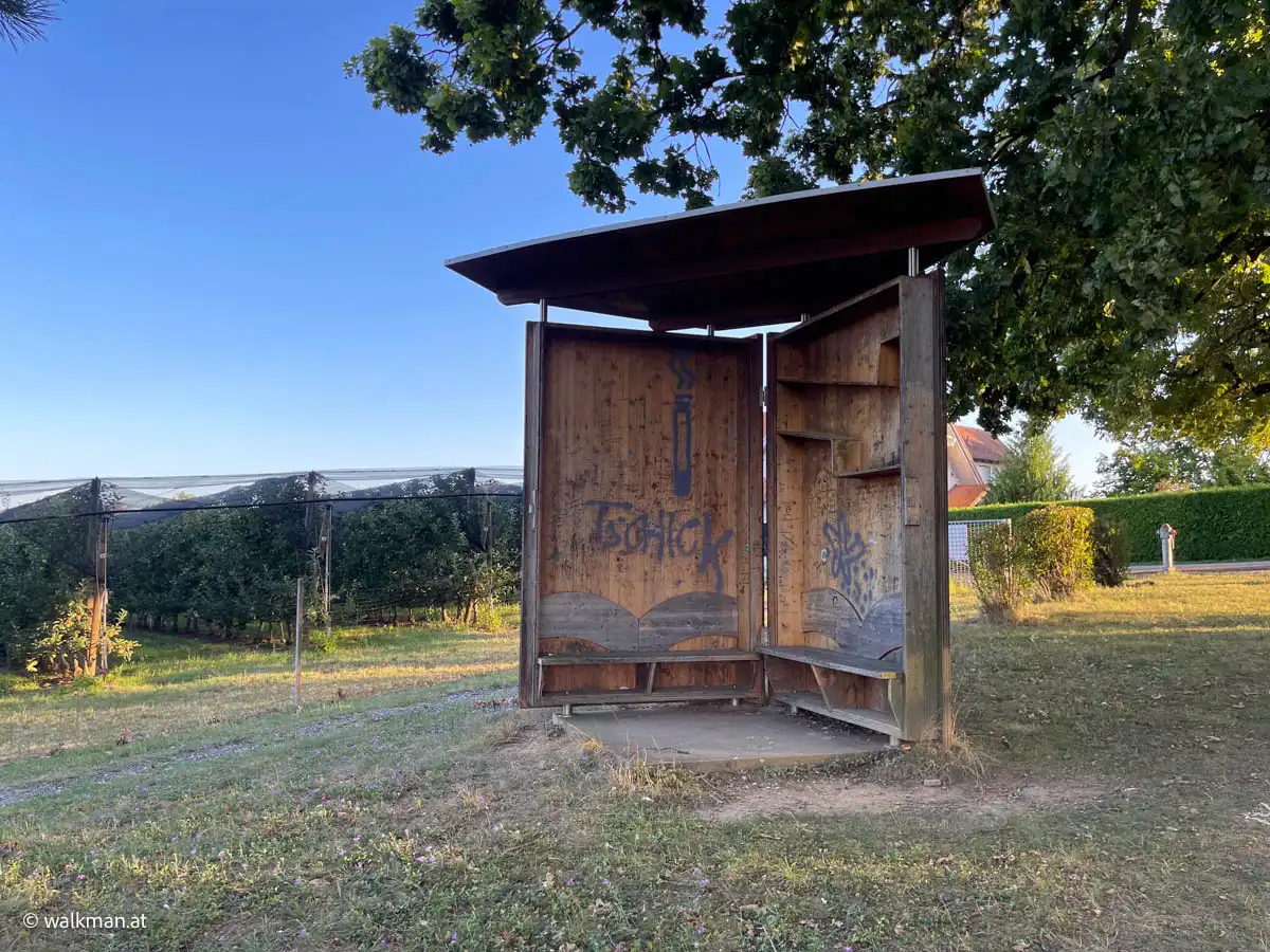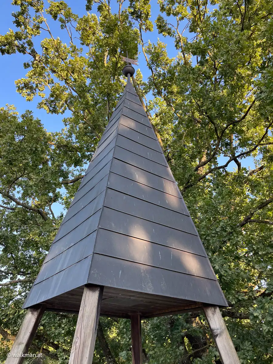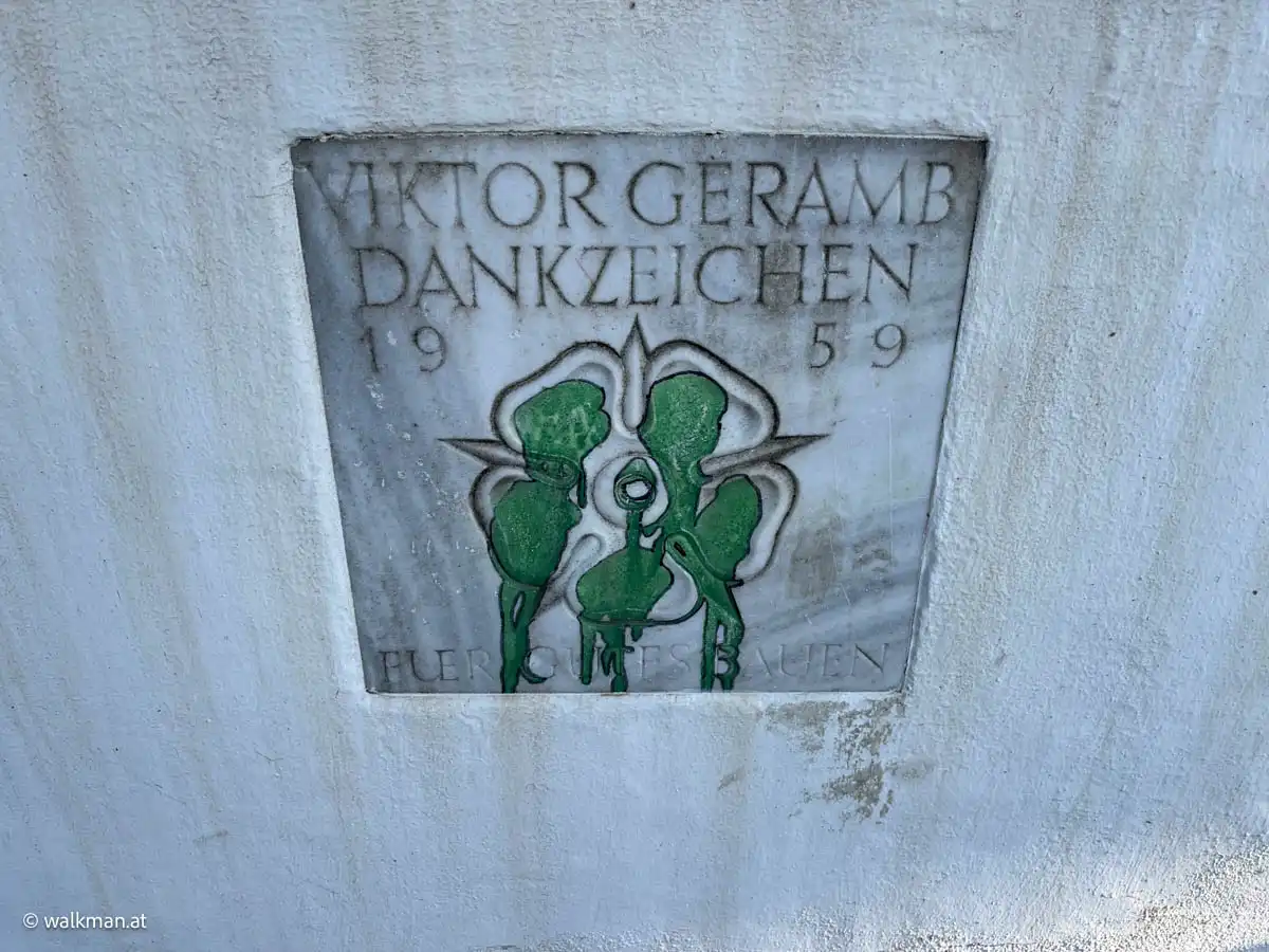 Und bald darauf ist es auch geschafft. Wir sind „oben“. Am Gipfel unserer heutigen Runde. Beim „Schwammerl“. So benennen zumindest die Einheimischen das hier erbaute Konstrukt. Ein erhöhtes Bauwerk mit einer Sitzgelegenheit. Ein Keramikschild informiert uns darüber das es 1959 erbaut wurde. Als Dank an einen „Viktor Germab“ für gutes Bauen. So zumindest die Inschrift.