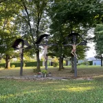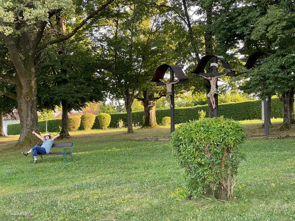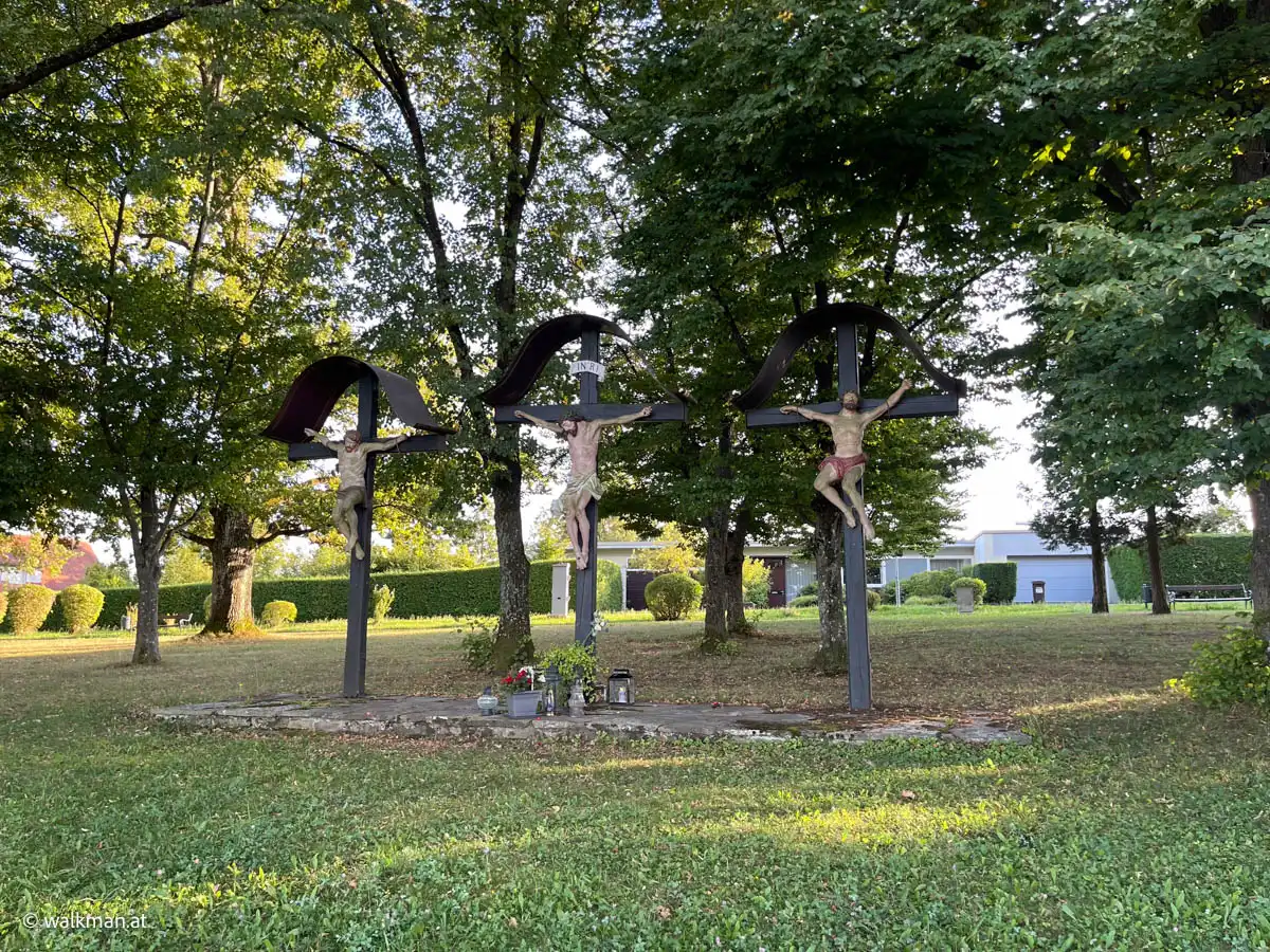 Jetzt sind wir aber am Dreikreuzberg angelangt und stehen vor den drei Kreuzen. Einerseits wirken diese, ob der Erhebung, Anordnung und Ausrichtung irgendwie wie „Golgahtha“ aus der biblischen Erzählung. Aber der Charakter der „Rundherums“ schwächt die dominant, sakrale Wirkung, durchaus stimmig, ab. Mit dem Ergebnis, dass hier ein wirklich schöner Ort der Ruhe und der Entspannung für die Seele entstanden ist. Unabhängig vom Klerus und der Natur zu verdanken.