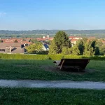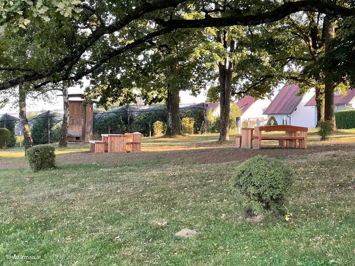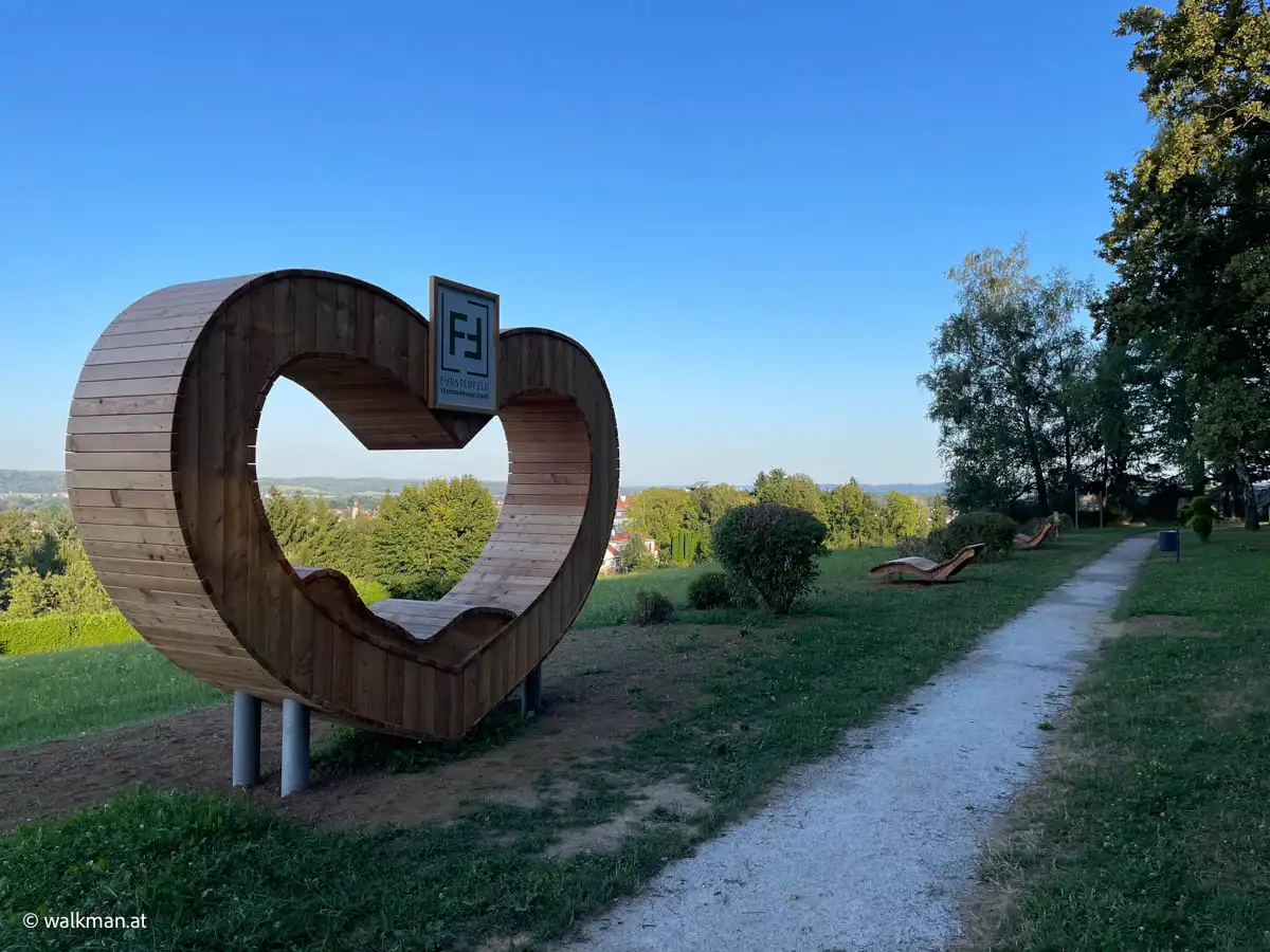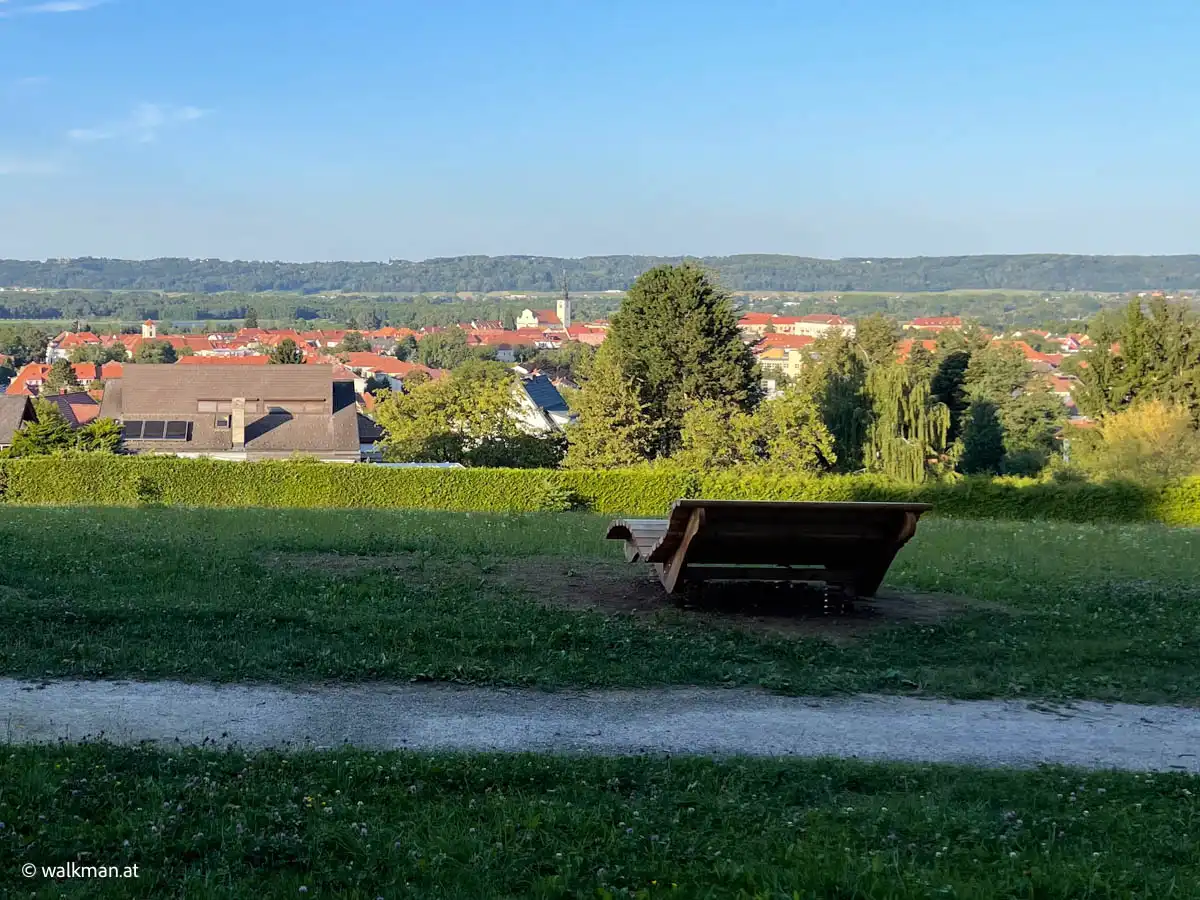 Unter diesem schmucken Platz breitet sich Fürstenfeld aus und bietet dabei ein wirklich schönes Panorama. Hier bleiben wir jetzt für eine Weile und genießen die Aussicht. Diverse Sitzgelegenheiten, in Form von Bänken, Tisch-Bank Kombinationen und sogar hölzernen, gefederten, geschwungenen „Sofas“, laden allesamt dazu ein, hier zu verweilen.