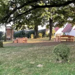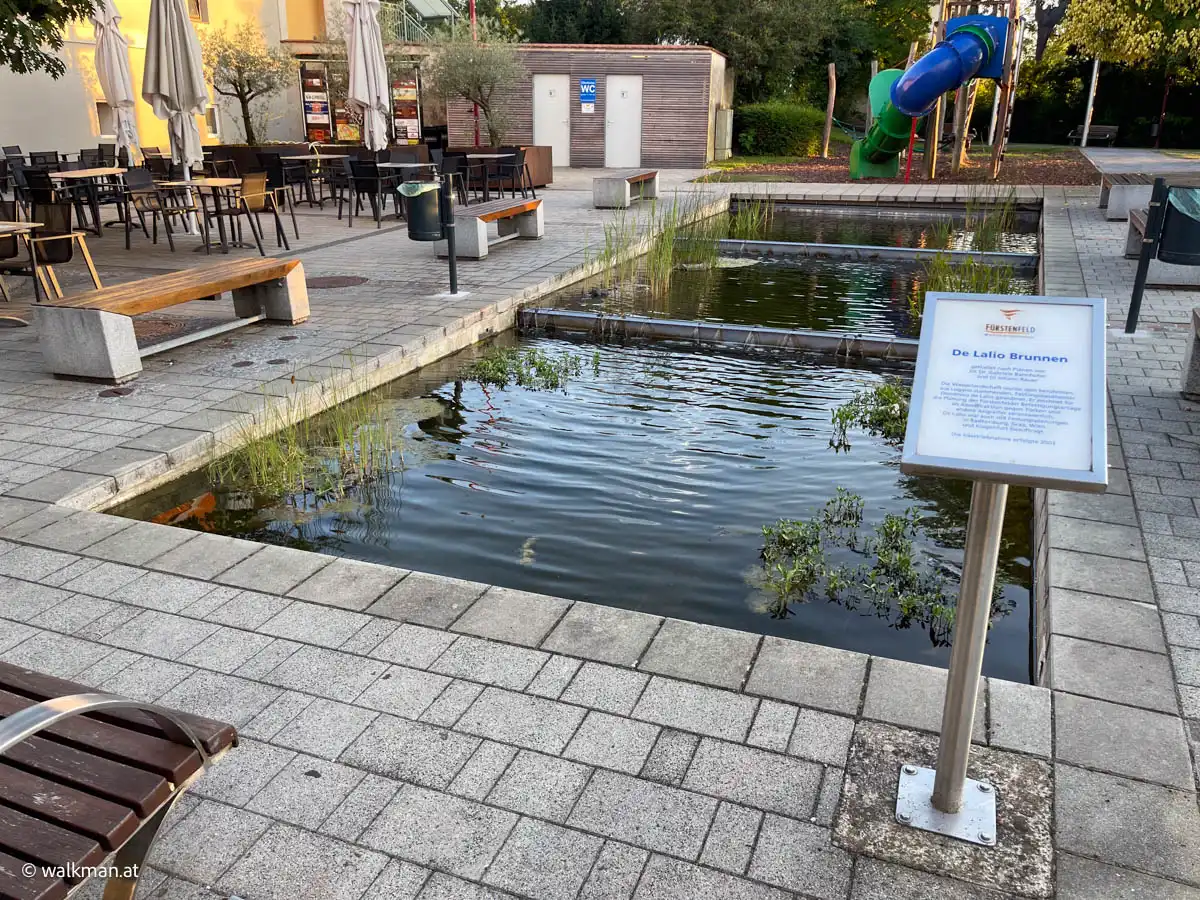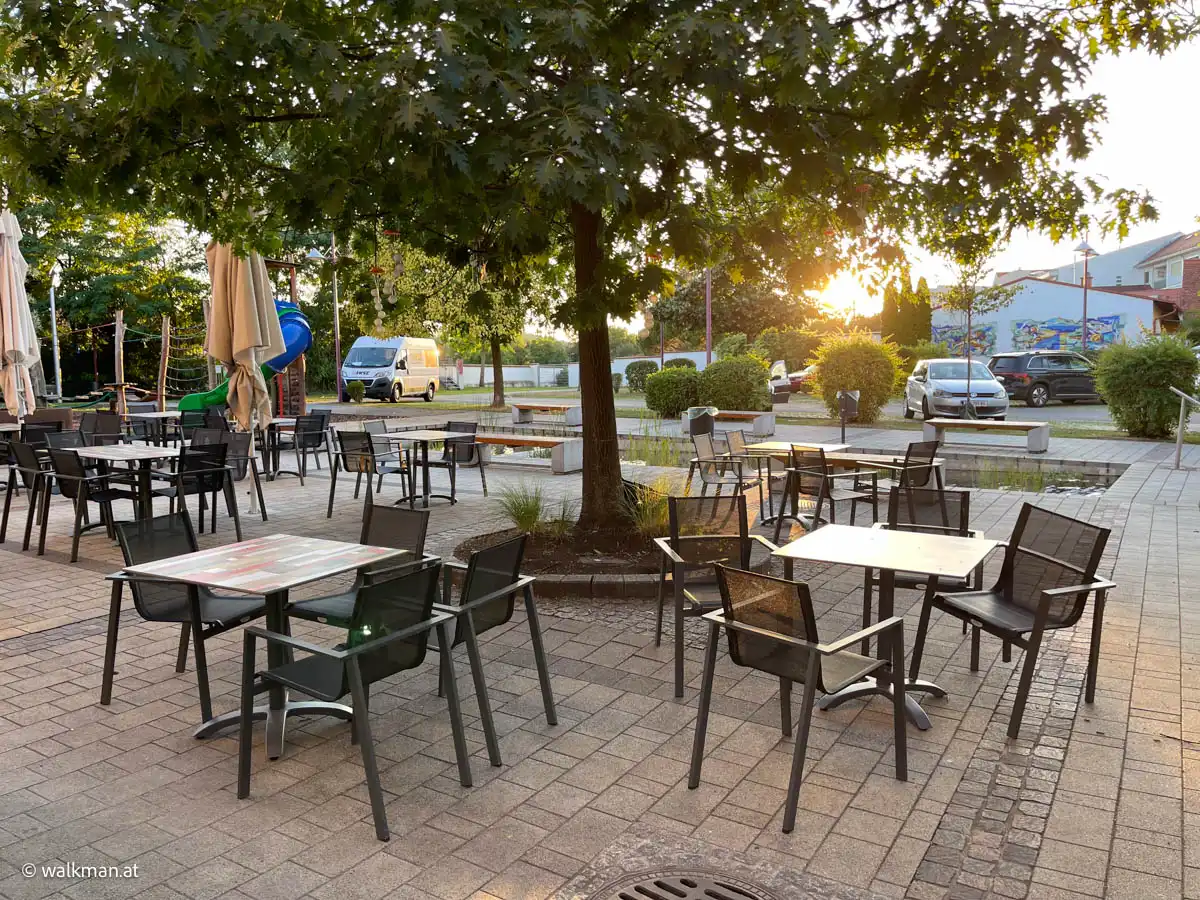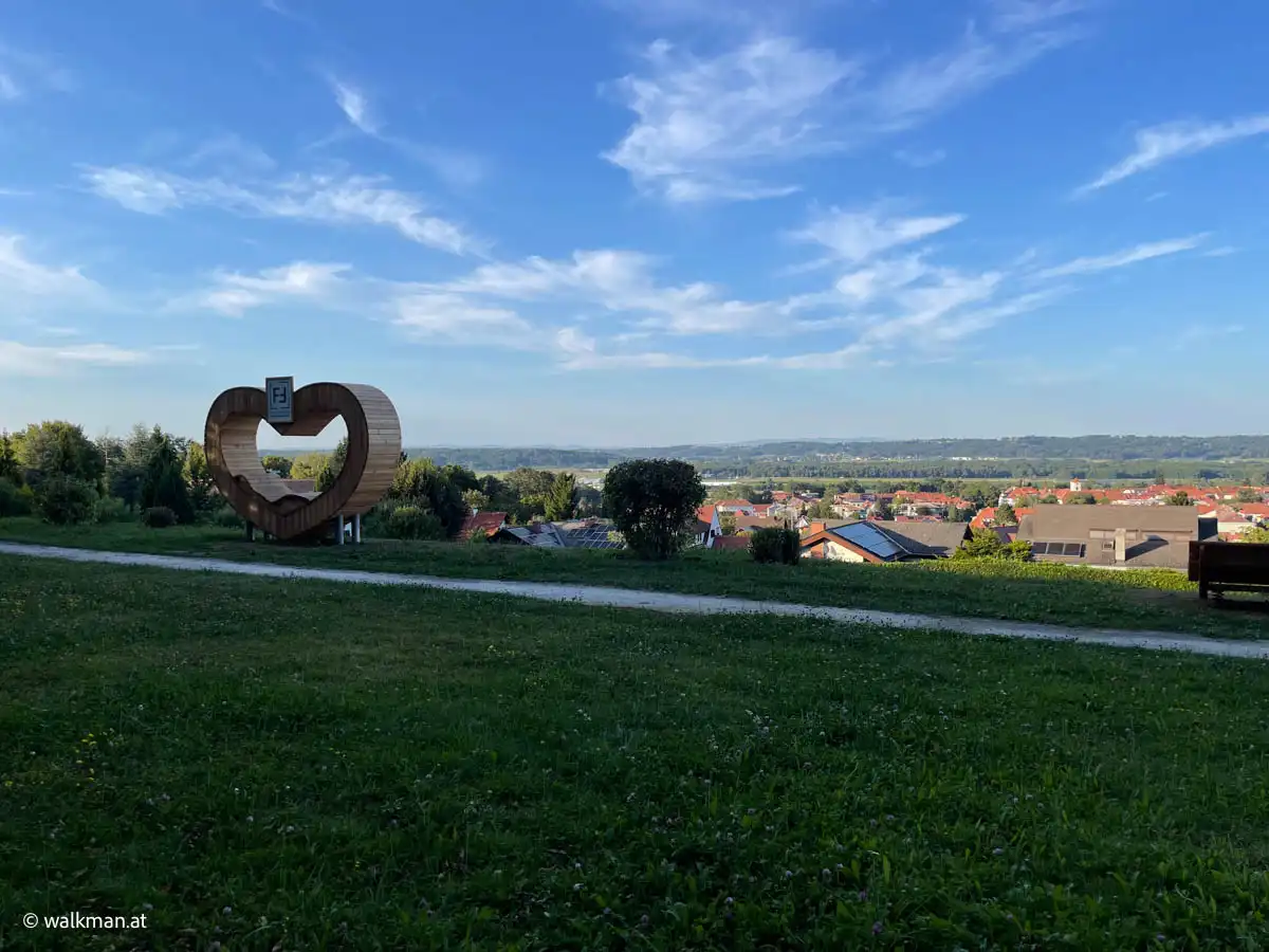 Unter diesem schmucken Platz breitet sich Fürstenfeld aus und bietet dabei ein wirklich schönes Panorama. Hier bleiben wir jetzt für eine Weile und genießen die Aussicht. Diverse Sitzgelegenheiten, in Form von Bänken, Tisch-Bank Kombinationen und sogar hölzernen, gefederten, geschwungenen „Sofas“, laden allesamt dazu ein, hier zu verweilen.