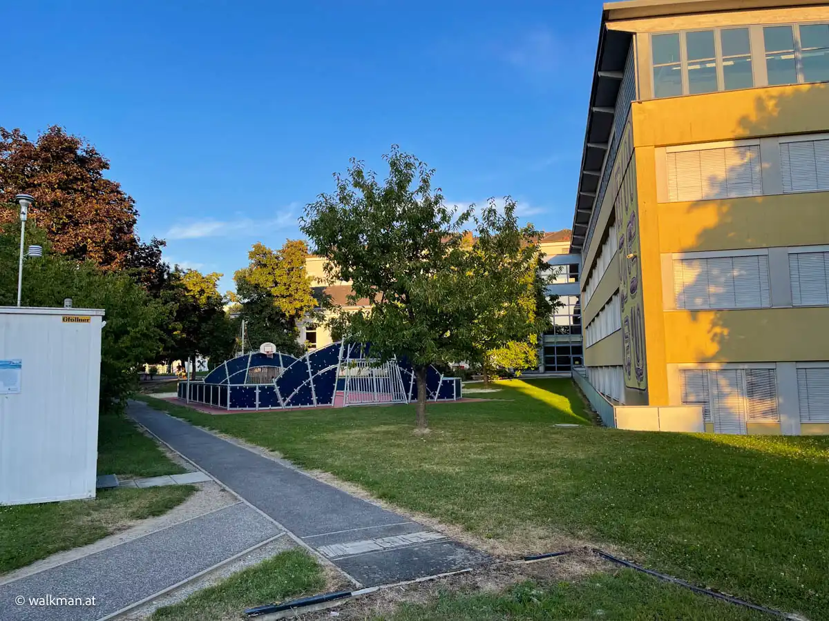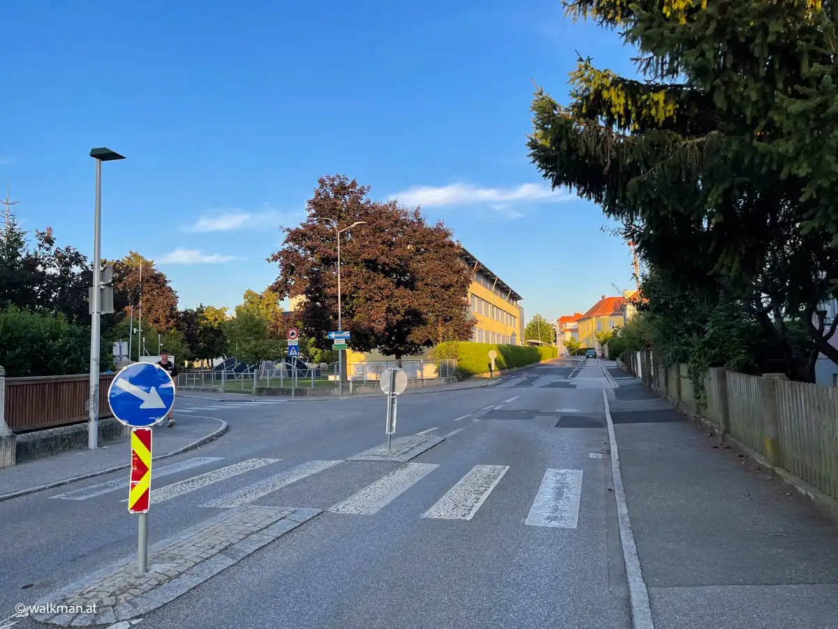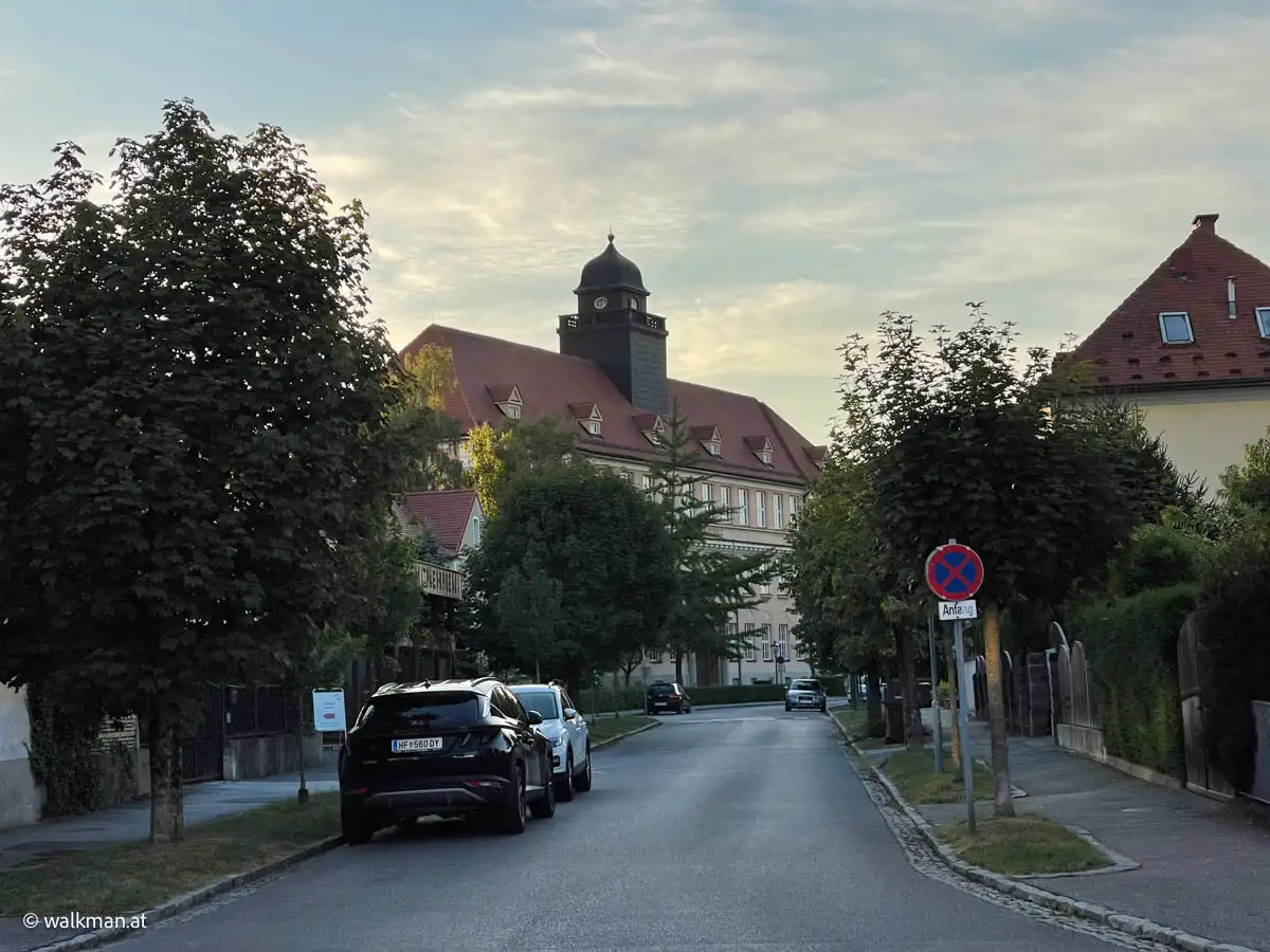 An der nächsten Kreuzung sehen wir links, ein wenig die Gasse hinauf, die Schule, wo Manuela, auf unserer zuletzt gegangenen Tour, gerastet hat. Die alte ehrwürdige Realschule. Und wandern kurze Zeit später auch an der neuen Mittelschule vorbei. Scheint der „Schulbezirk“ zu sein.