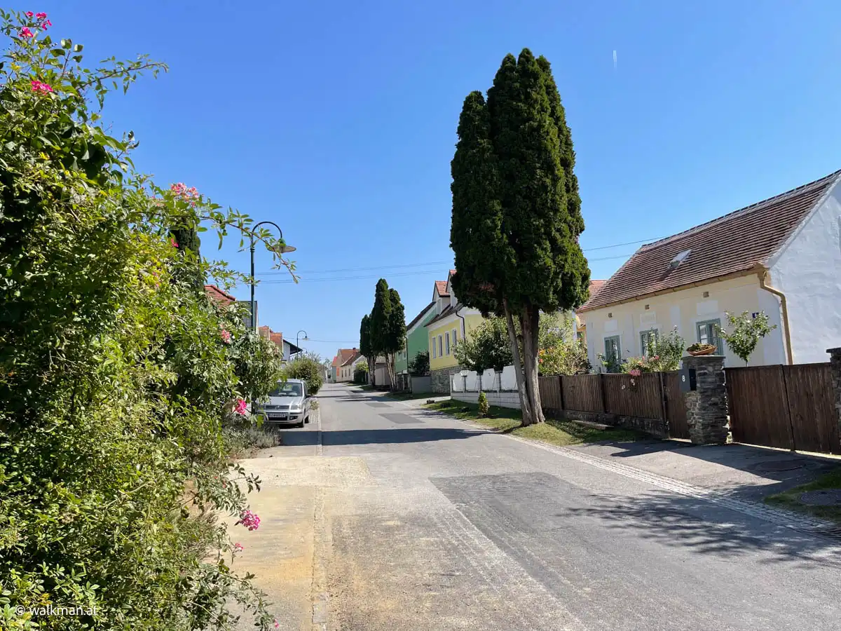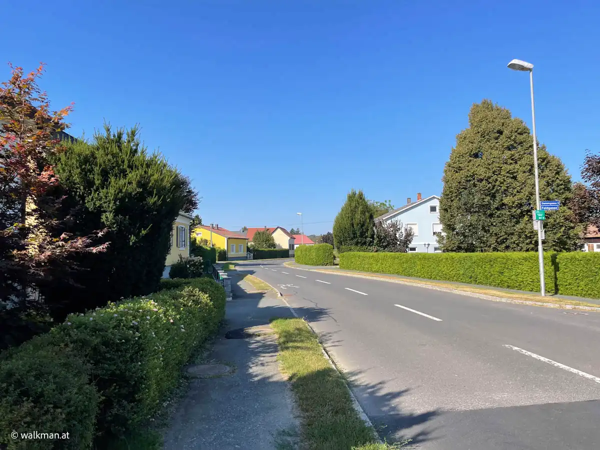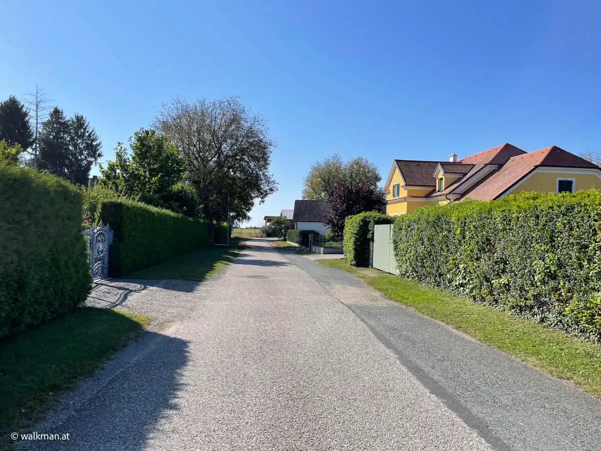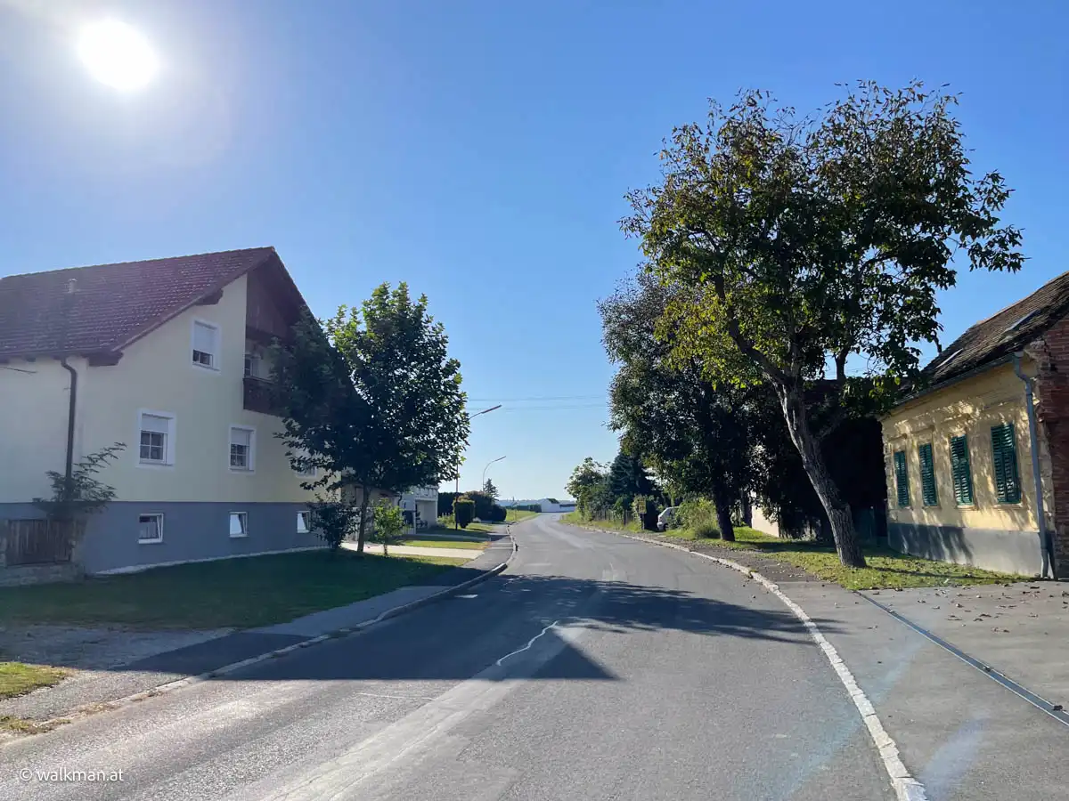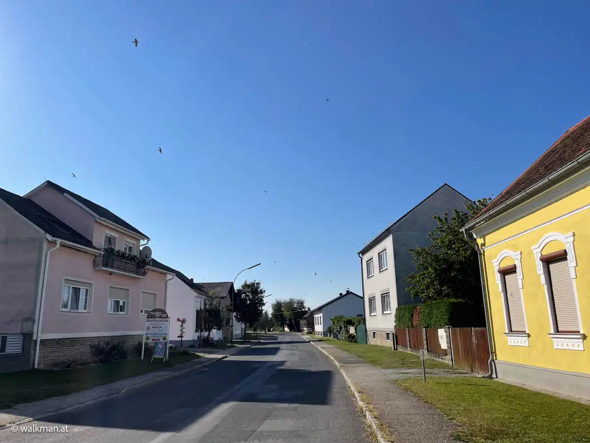 Das bleibt mir heute aber mehr oder weniger erspart. Das Nachdenken. Über die Brücke der Pinka drüber, gleich rechts rein, marschiere ich nun durch einen Teil von Bildein, den ich noch nicht kannte. Eine schöne Gasse am Rande des Ortes. Beim Sportplatz vorbei. Und hier wieder links.
