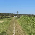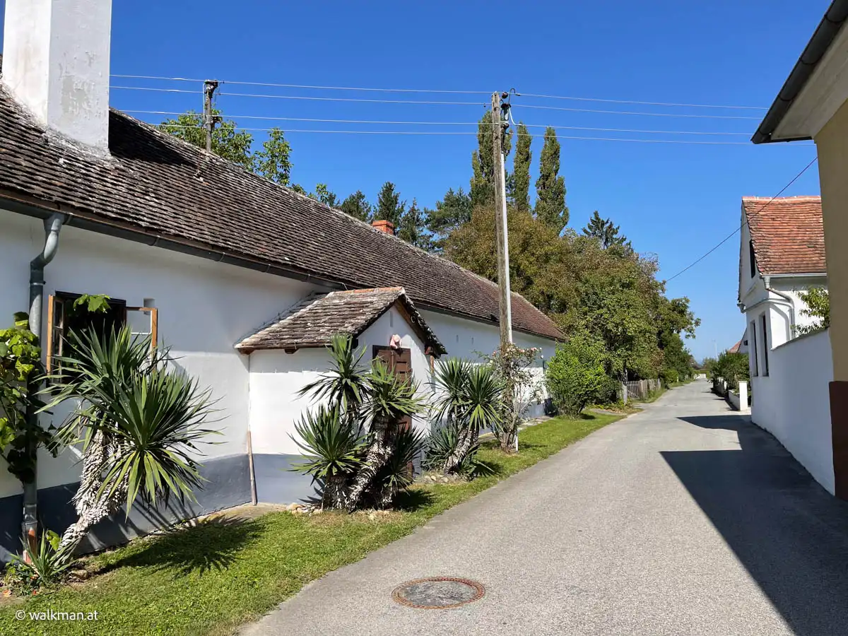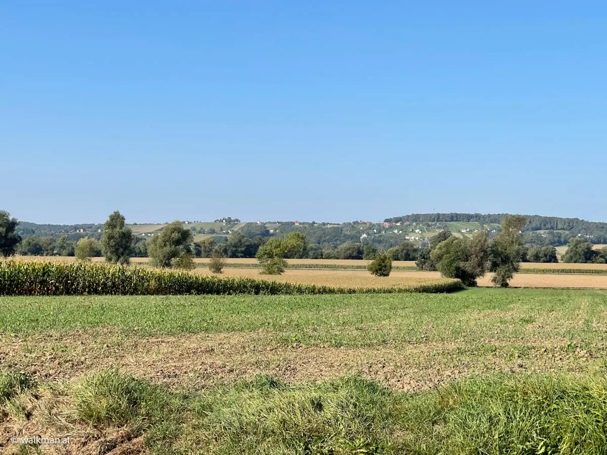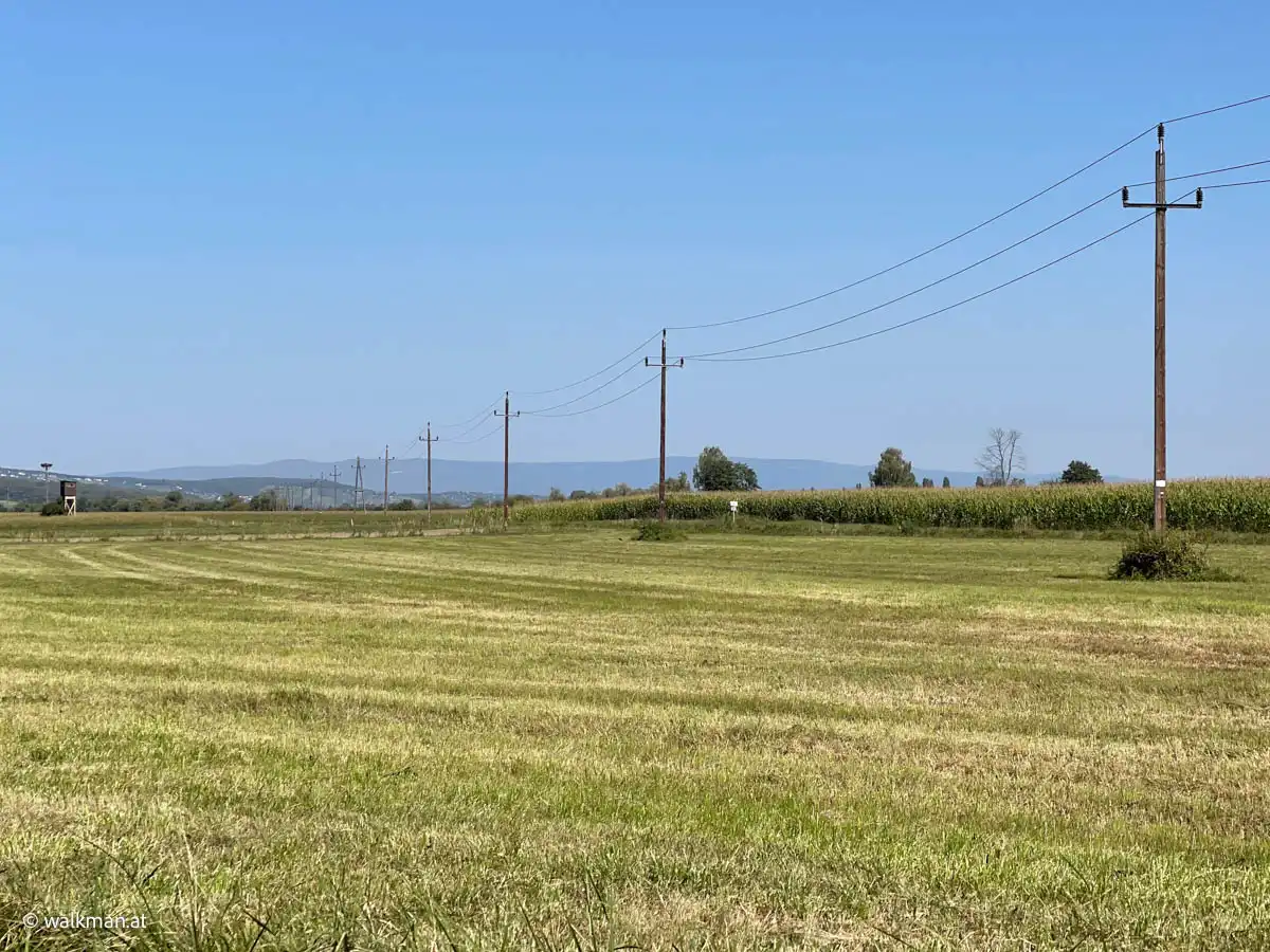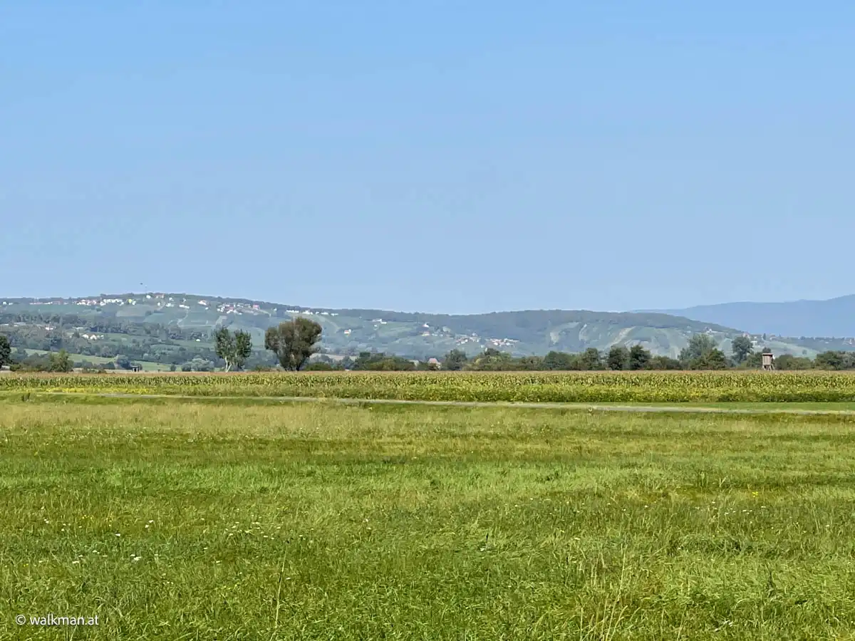Flach. Ganz flach. Aber auch problemlos zu bewandern. So stellt sich dieser Abschnitt bei mir vor. Und das nehme ich dankend an. Erlaubt es mir doch auch, mit schnellem Schritt übers Land zu flitzen. Zu meiner Rechten, im Osten, kann ich, in etwa 2 Kilometern Luftlinie, das Grenzland von Österreich-Ungarn erkennen. Links von mir erheben sich die Ausläufer der Alpen, in Form von den bekannten südburgenländischen Weinbergen, die im sanften Klima der beginnenden pannonischen Tiefebene, hier herrliche Trauben hervorbringen.