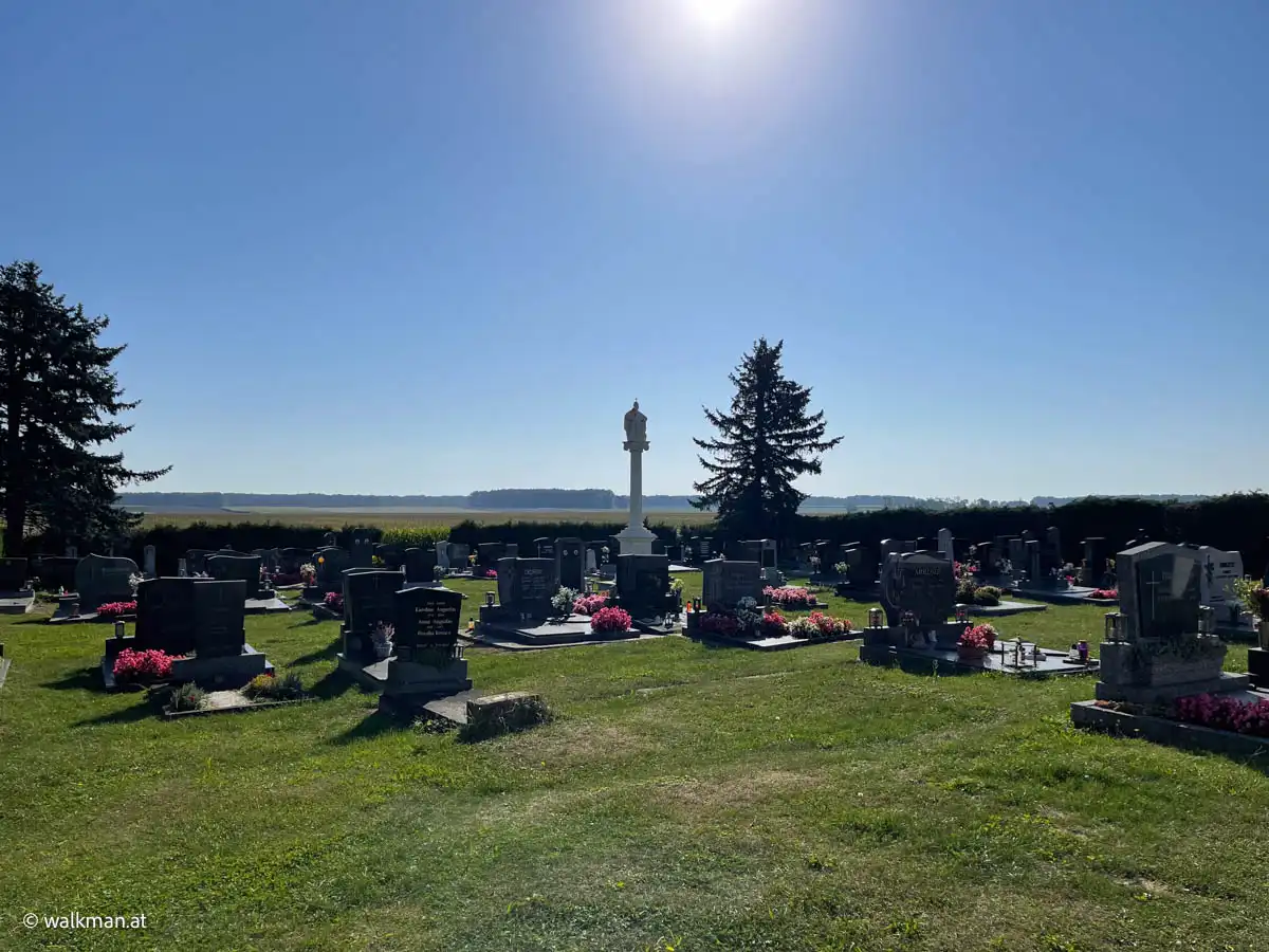 Vom Hauptplatz in Bildein marschierten wir also los, Richtung Ortsende. Vorbei an der Ortstafel und am Friedhof, nach Süden. Die Gegend hier ist leicht zu bewandern. Durchwegs flach und übersichtlich. Ohne größere Schwierigkeiten oder unvorhersehbare Hindernisse. Über die asphaltierte Straße spazierten wir über das Grenzland. Die Temperaturen waren angenehm und die Vormittagssonne lachte strahlend, aber nicht zu warm, vom Himmel.