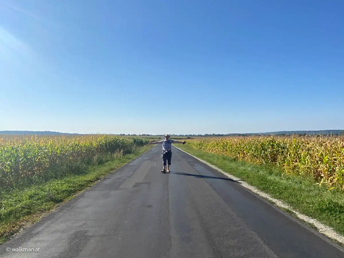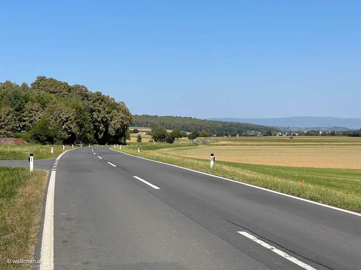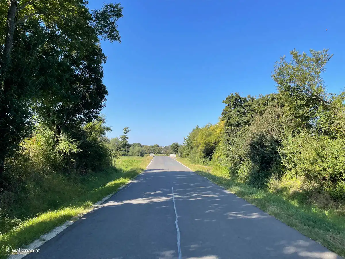Nach dieser Rast gehen wir die Route weiter, Richtung Eberau. Auf dieser Straße, nun nach Westen verlaufend, begegnen uns kaum mehr Fahrzeuge als vorher. Deswegen ist das Spazieren hier, am linken Straßenrand, wie wir es praktizieren, auch weitgehend ohne Risiko. Bei anderen Routen würden wir uns das vermutlich zweimal überlegen.