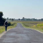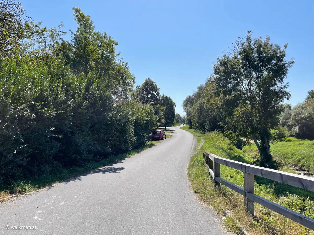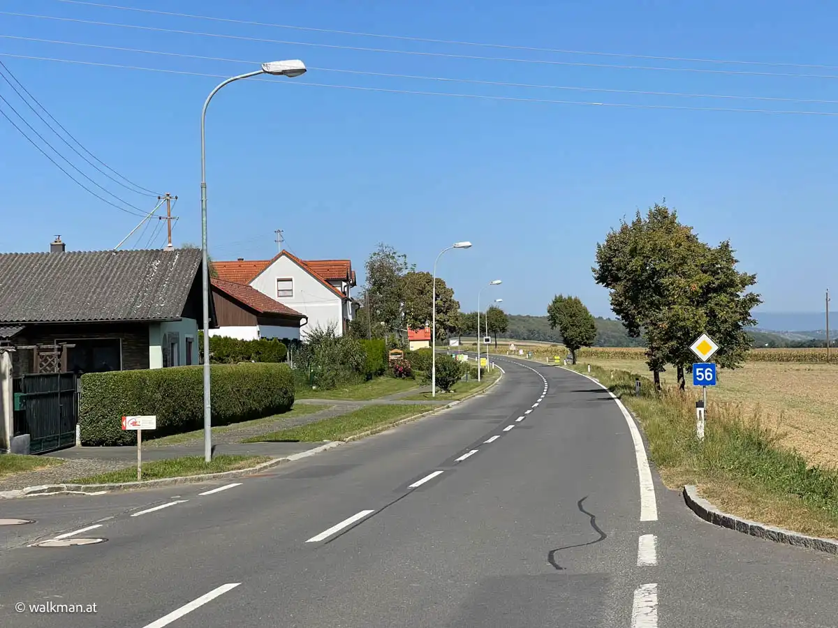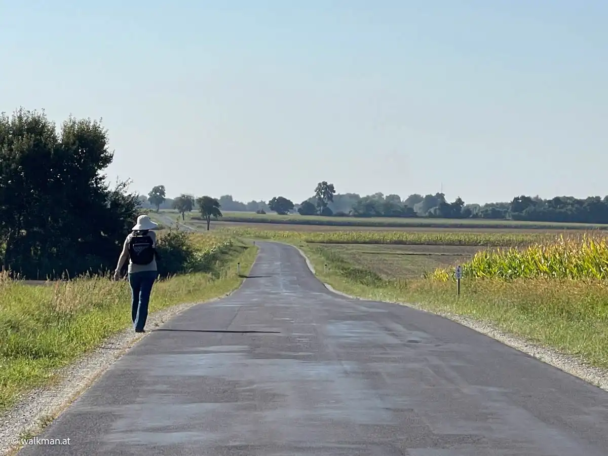 Nach dieser Rast gehen wir die Route weiter, Richtung Eberau. Auf dieser Straße, nun nach Westen verlaufend, begegnen uns kaum mehr Fahrzeuge als vorher. Deswegen ist das Spazieren hier, am linken Straßenrand, wie wir es praktizieren, auch weitgehend ohne Risiko. Bei anderen Routen würden wir uns das vermutlich zweimal überlegen.