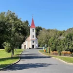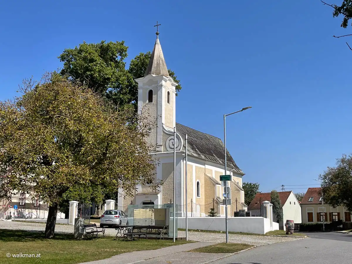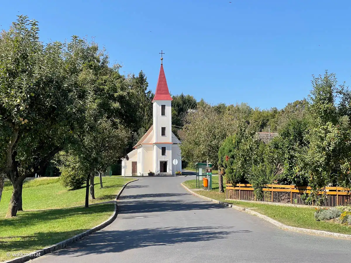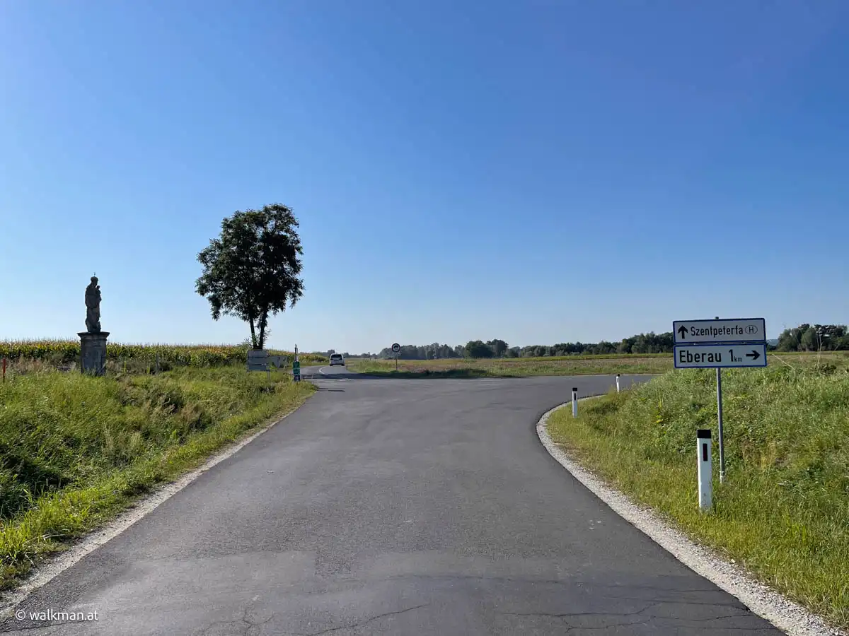 Bereits kurz nach dem Ortsende von Bildein kann man auch schon den Kirchturm von Eberau erkennen, was natürlich zusätzliche Motivation verleiht, wenn man schon quasi am Start das erste Ziel sieht. Der Verkehr hält sich hier auch in Grenzen. Auf unserer Wanderung bis zur ersten Rast, nach etwa 2 Kilometern – bei der Kreuzung, wo man sich nach Eberau oder dem ungarischen Szentperterfa entscheiden kann – fuhren vielleicht 10 Fahrzeuge vorbei. Zwei davon waren Traktoren. Und alle miteinander grüßten freundlich. So macht das Wandern richtig Spaß.