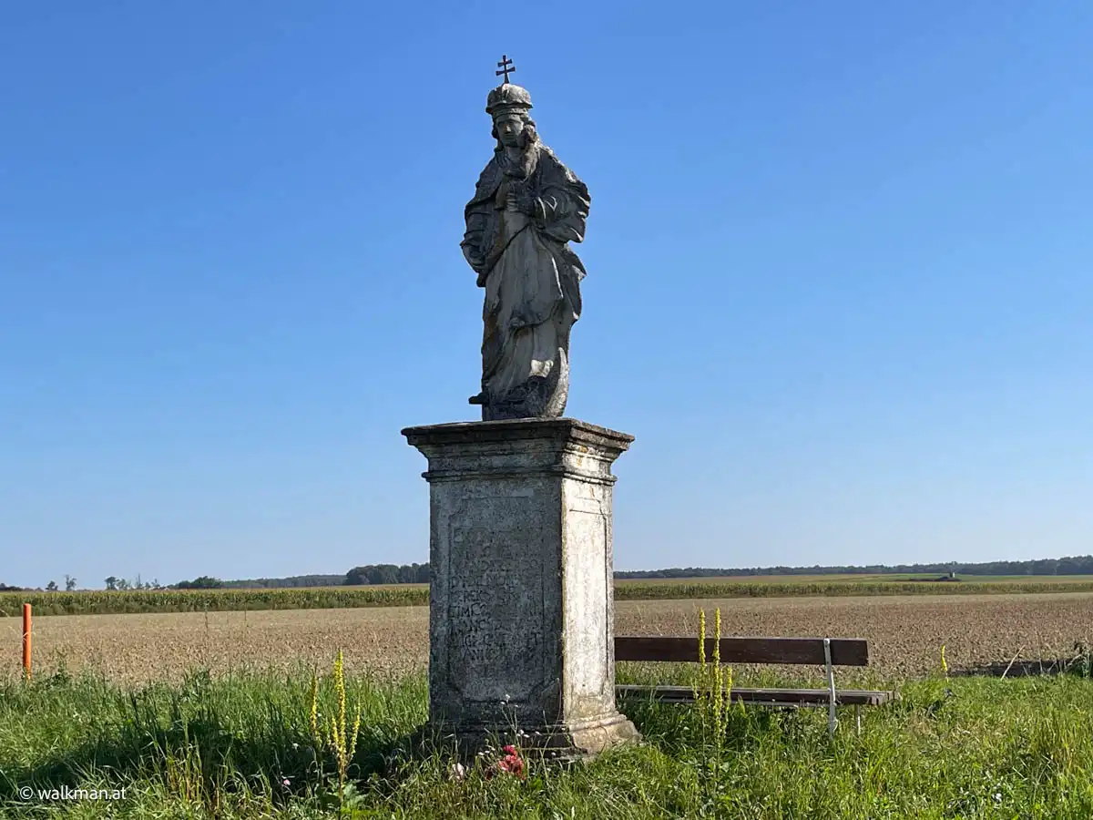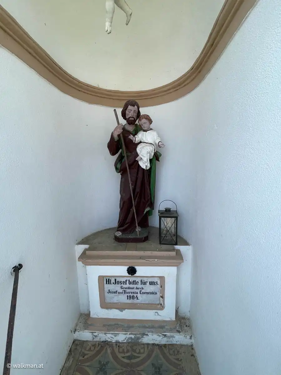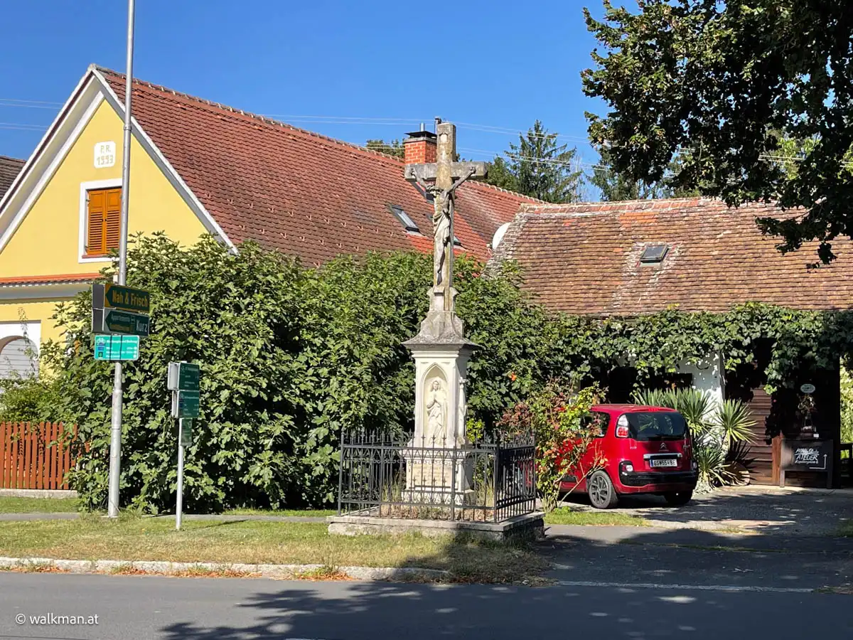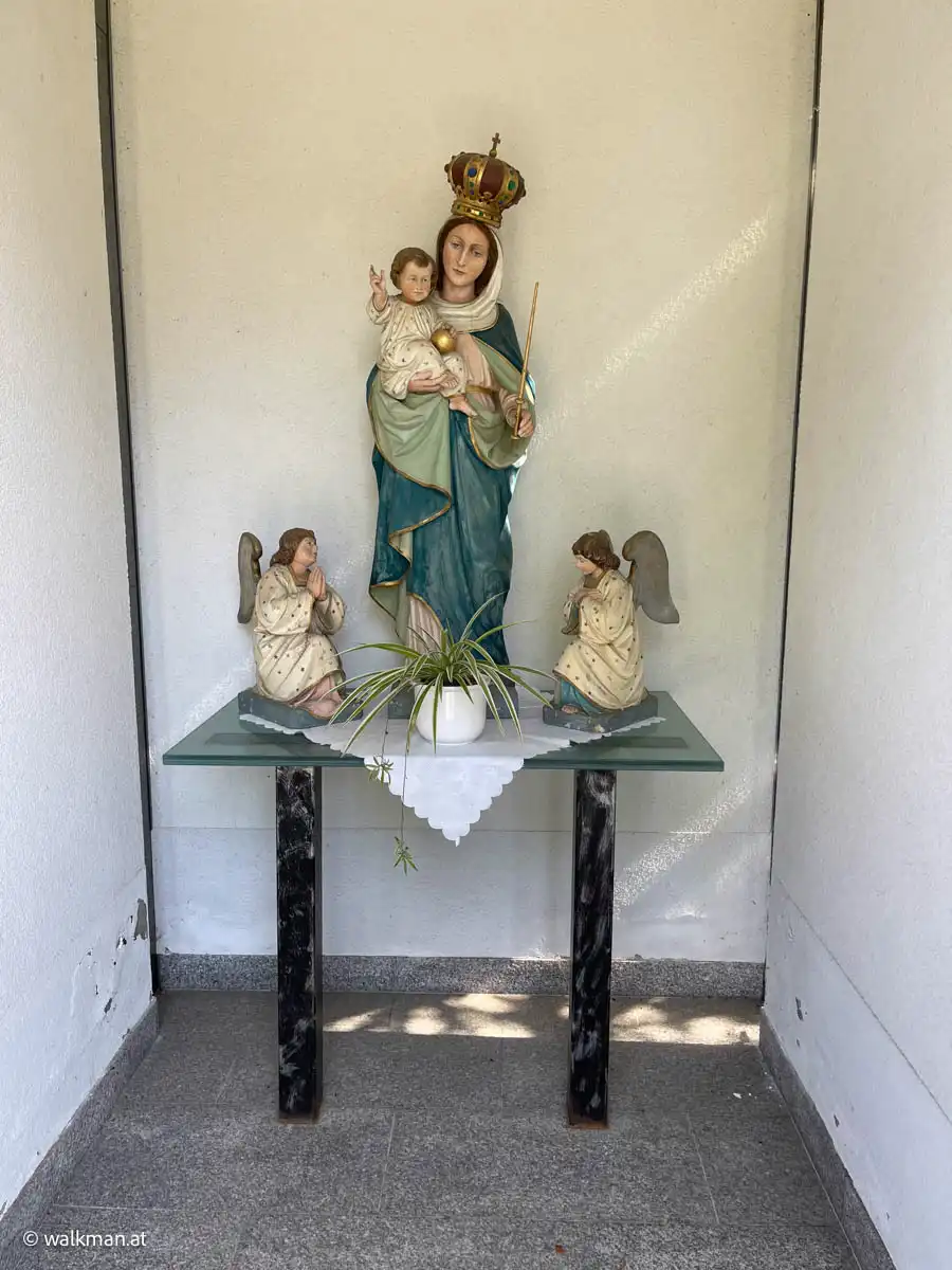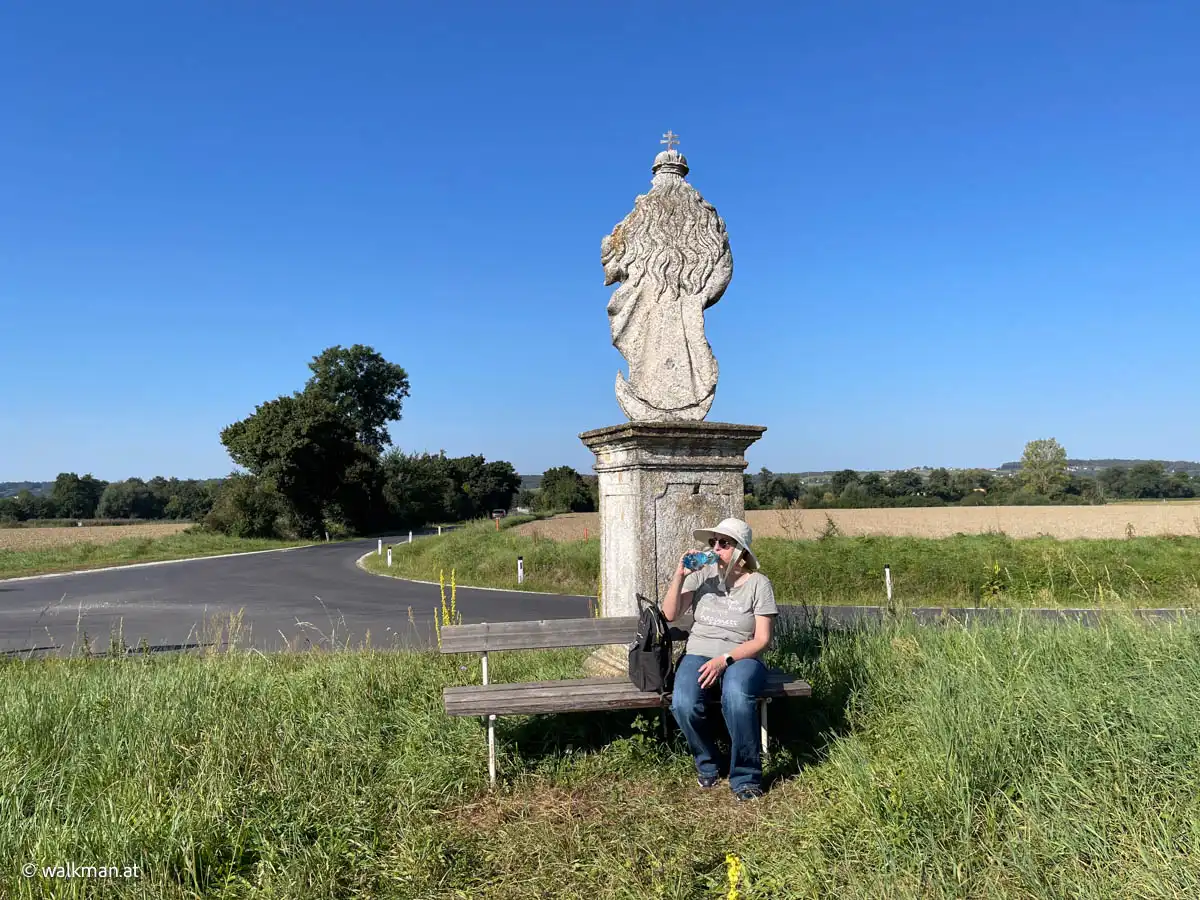 Hier machten wir eine kleine Pause. Die Bank neben der, hier stehenden Marienstatue, lädt ja förmlich ein dazu. Ist aber auch ein schönes Platzerl, das muss man dazu sagen. Den Blick übers Land schweifen lassend, ein paar Schlucke aus den Trinkflaschen und miteinander scherzend. So muss Leben sein.