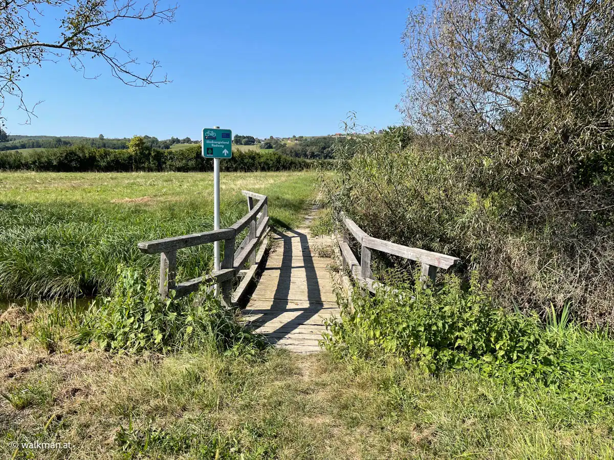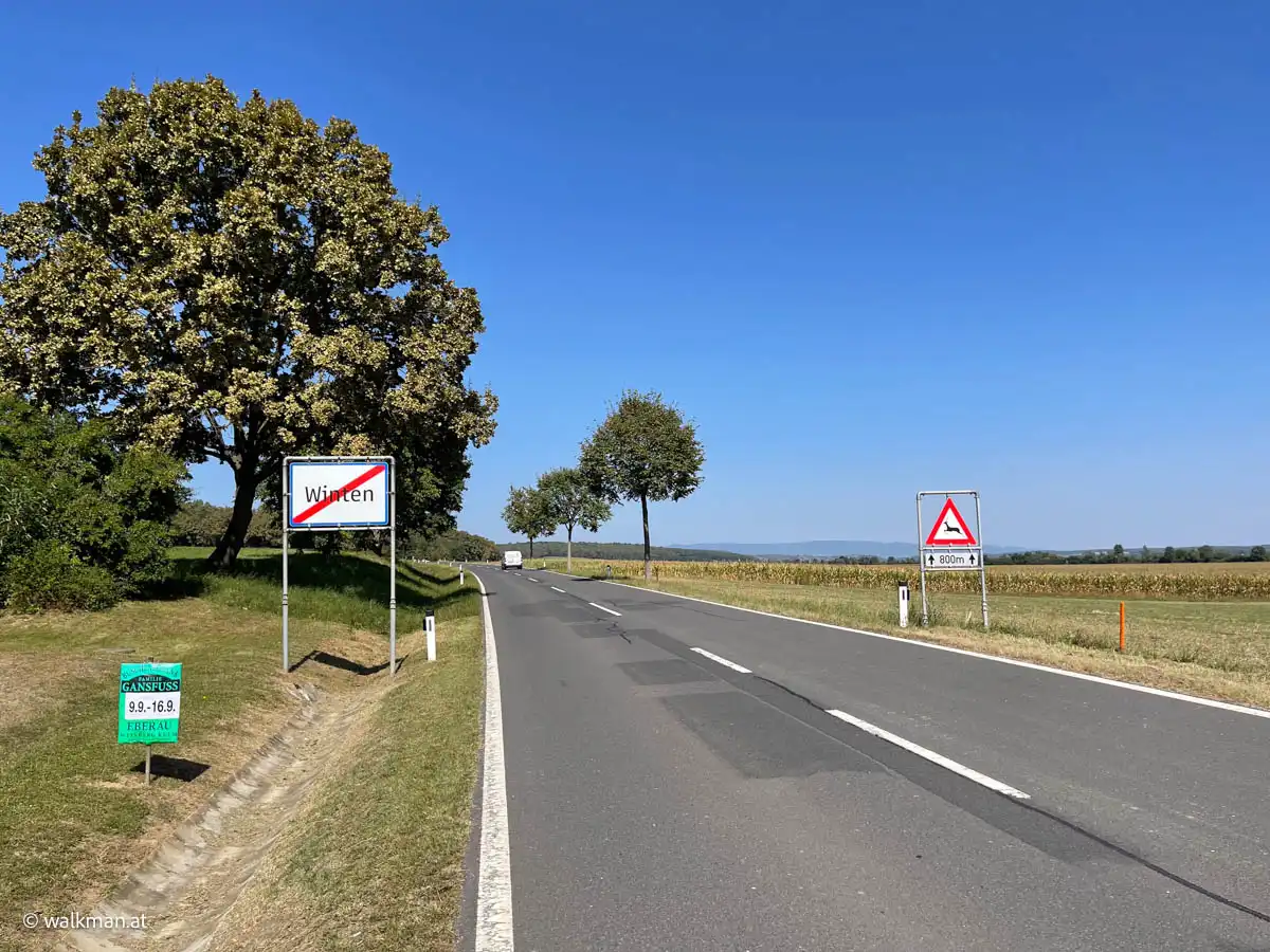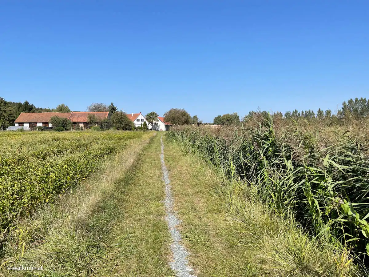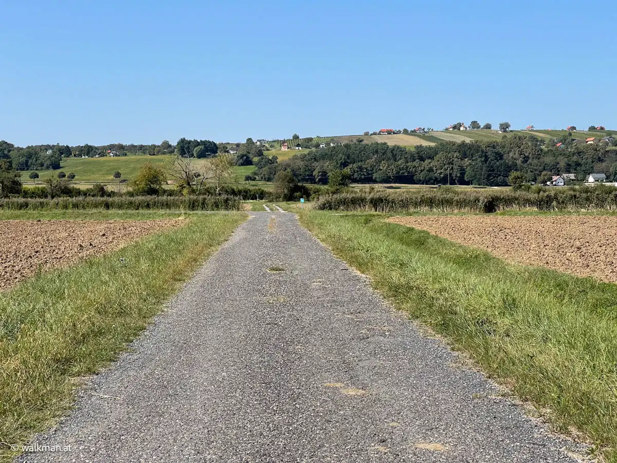 Aber das soll meine Wanderlaune nicht trüben. Ich marschiere flotten Schrittes weiter, aus der Kapellengasse und dem Ort hinaus. Nun geht die Tour auf einem Schotterweg weiter. Am Ende des Weges einmal nach links abbiegen, über eine kleine Brücke drüber und schon bin ich auf dem Feldweg, der mich nach Winten, einem Ortsteil von Eberau, führen soll, unterwegs.