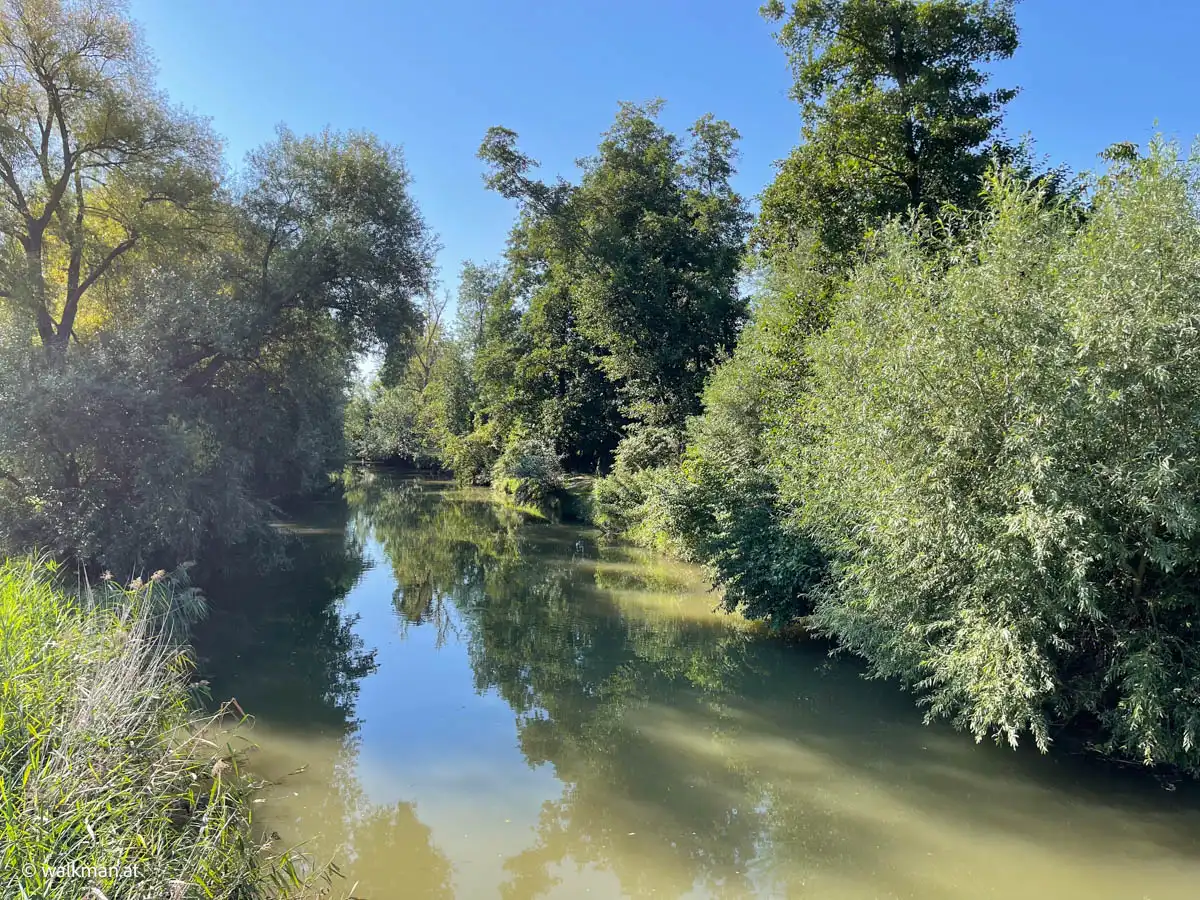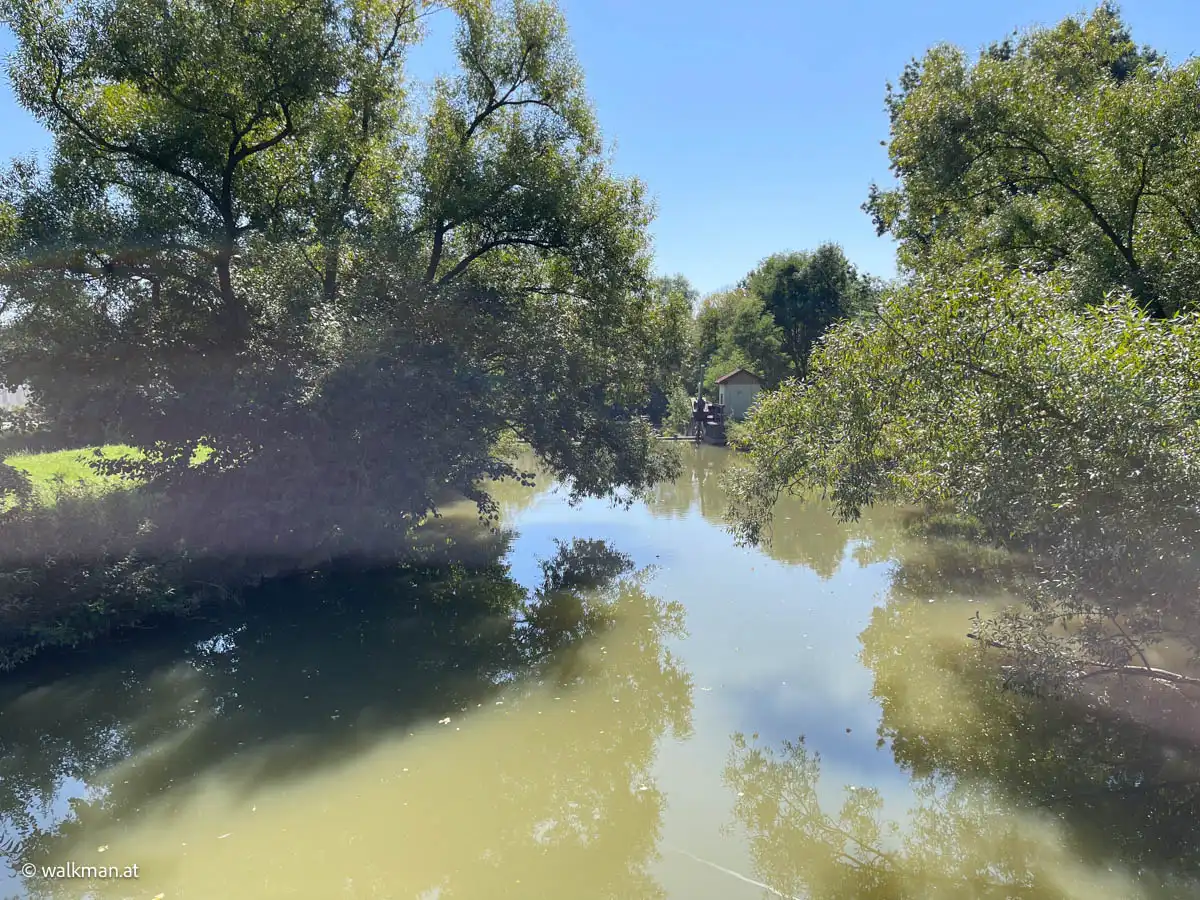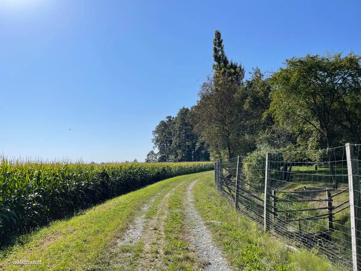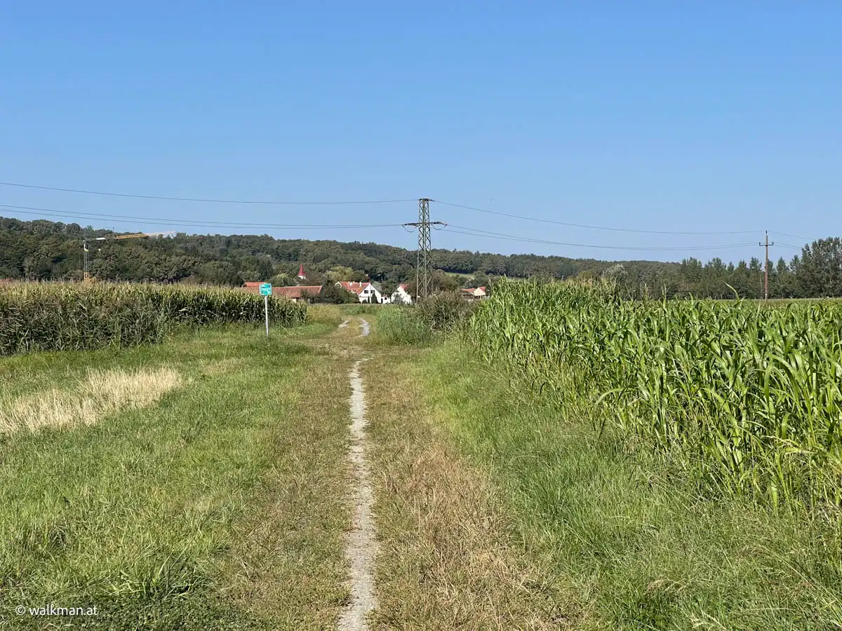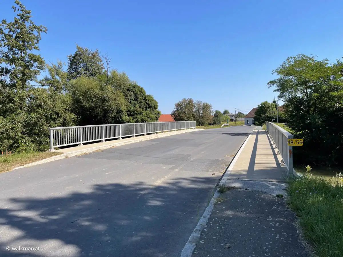 Aber das soll meine Wanderlaune nicht trüben. Ich marschiere flotten Schrittes weiter, aus der Kapellengasse und dem Ort hinaus. Nun geht die Tour auf einem Schotterweg weiter. Am Ende des Weges einmal nach links abbiegen, über eine kleine Brücke drüber und schon bin ich auf dem Feldweg, der mich nach Winten, einem Ortsteil von Eberau, führen soll, unterwegs.