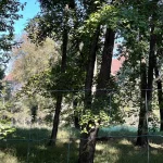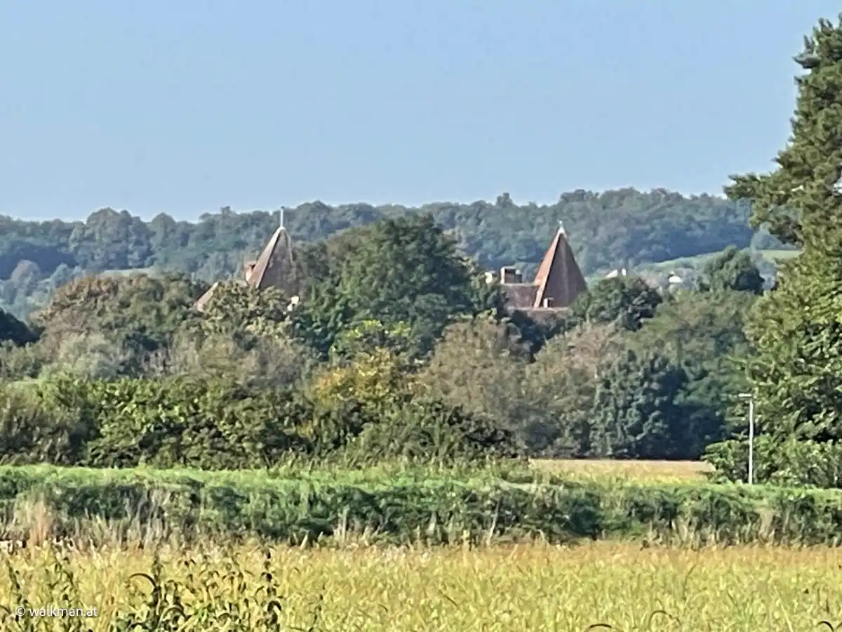 Irgendwo mittig, am Weg um das Schloss, erhaschen wir dann doch noch zumindest einen Blick auf die spitz zulaufenden Türme. Und schemenhaft, durch das dichte Blätterwerk, auch auf die Umrisse der Fassade. Mehr aber auch nicht. Eigentlich schade. Auf den Fotos, die im Internet vom Schloss existieren, scheint es sich um einen gut erhaltenen schönen Bau zu handeln. Tja, Pech gehabt.