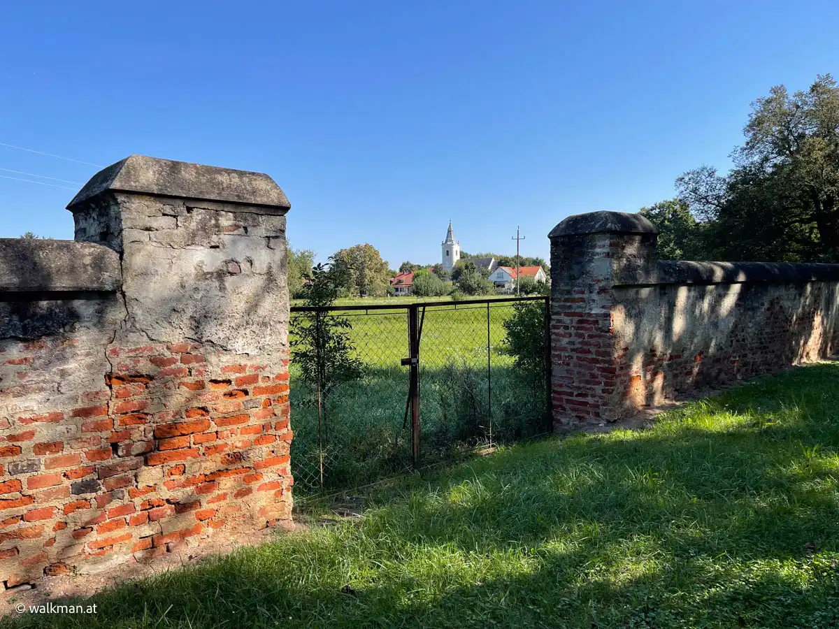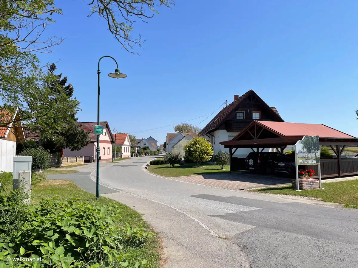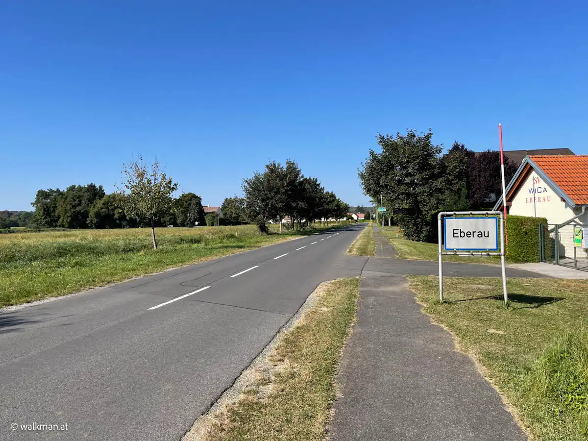 Einen Kilometer weiter und schon sind wir auch schon in Eberau angekommen. Bei der Ortstafel und dem Sportplatz vorbei, halten wir uns bald nach links. Hier muss eine Gasse links rein führen, die uns danach den Weg weiterfolgend, am Wasserschloss vorbei bringen soll. Und so ist es auch. Die Gasse zumindest.