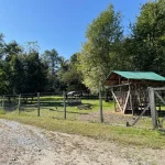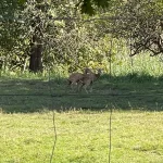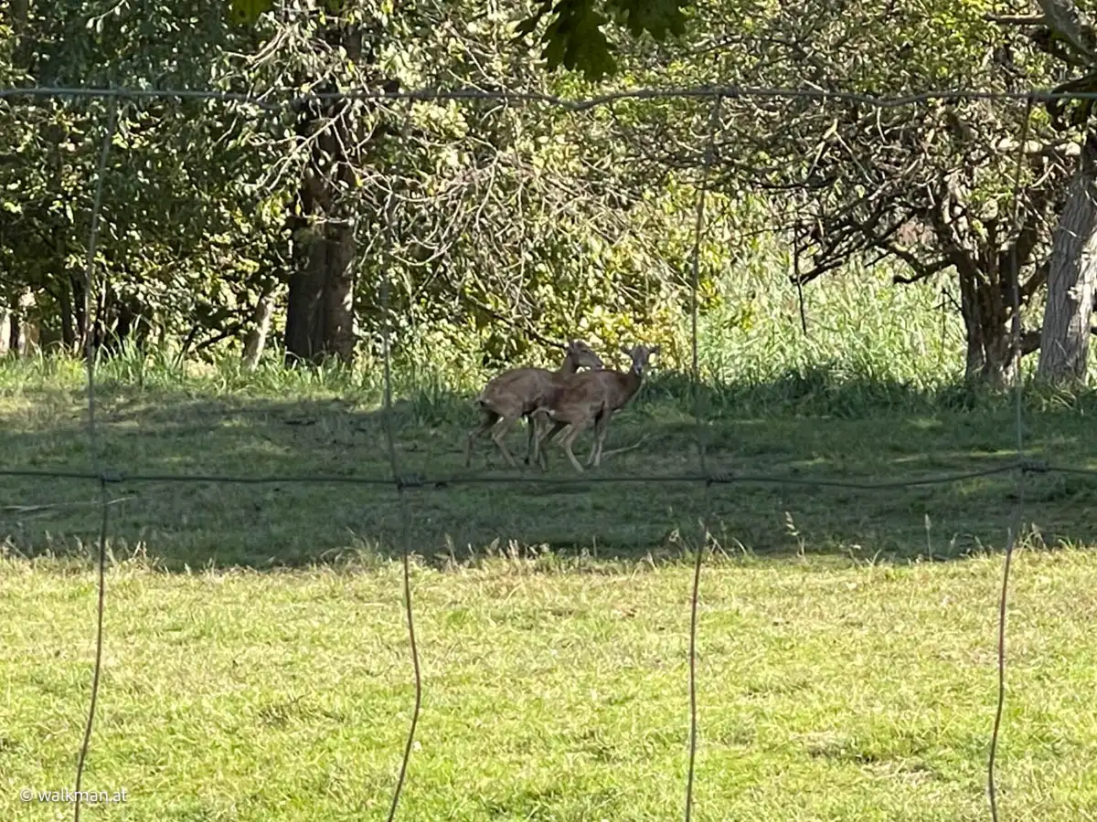 Unser Weg biegt nach Norden und dann nach Osten ab. Und auf dem letzten Stück der Umrundung wandern wir zumindest an der Schlossmauer entlang. Und von hier aus sieht man auch ein wenig mehr vom Gelände hinter dem Zaun. Ja sogar zwei Rehe lassen sich im Inneren blicken. Glücklich sehen sie aber nicht aus. Eher verschreckt und unsicher. Gatterhaltung eben.