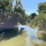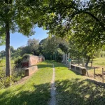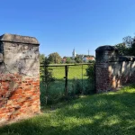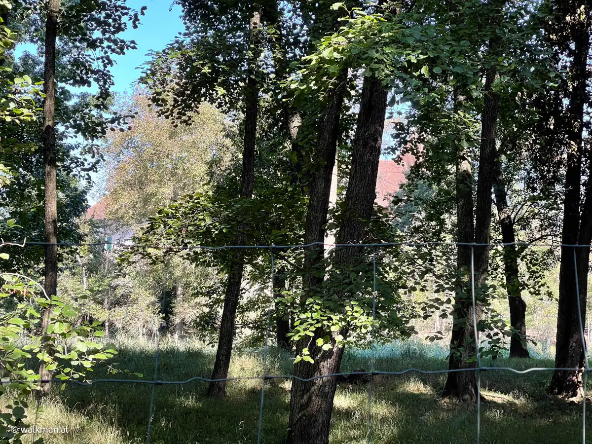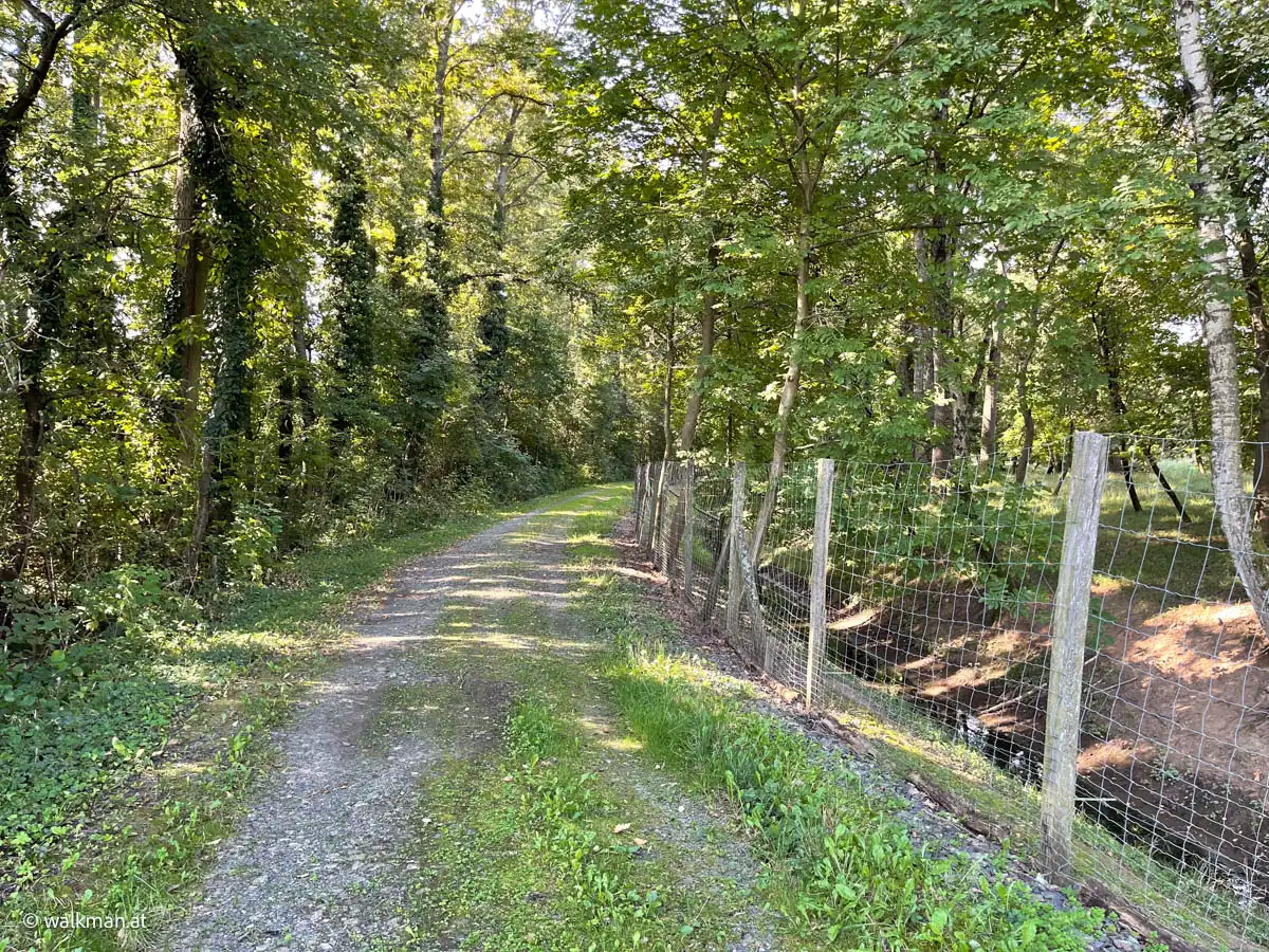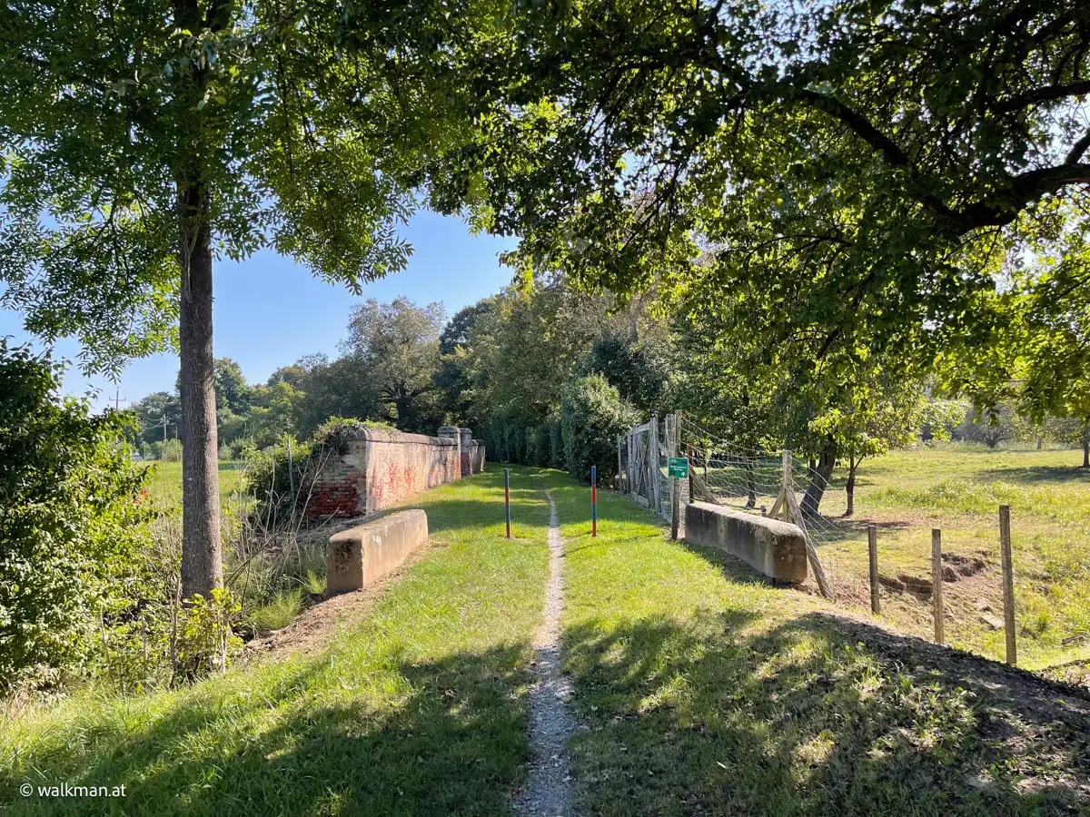 Das Wasserschloss weniger. Wir wandern am alten Zollhaus und einer sichtlich aufgegebenen Ziegelsteinsiedlung im Rohbau, vorbei, aber dort, wo wir das Wasserschloss erblicken sollten, sehen wir nur Bäume. Und Gebüsch. Aber kein Schloss. Sehr wohl aber den vollkommen intakten Wildzaun, der das Areal umschließt und keine größeren Tiere und somit auch keine Menschen hinein lässt. Hier achtet jemand wirklich auf seine Privatsphäre.