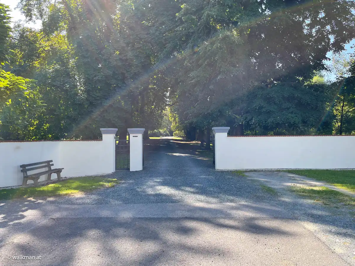 Dann, angekommen beim „großen Tor“, das sichtlich die Einfahrt in den Schlosspark darstellt, erhalten wir weitere Einblicke. Eine schöne Allee, ein gepflegter Park. Aber auch von hier ist das Schloss nicht wirklich zu sehen. Was wir aber erfahren ist, das im Schloss, bzw. im Schlosspark, ab und zu Veranstaltungen stattfinden. Kleiner Konzerte und Ähnliches. So ist es zumindest an einem Info-Bereich an der Schlossmauer ausgeschildert. Das behalten wir im Gedächtnis und werden uns in Zukunft einmal, zu einem solchen Event einfinden.