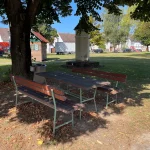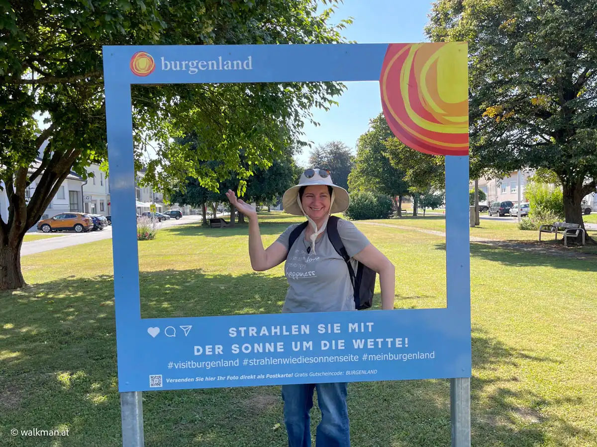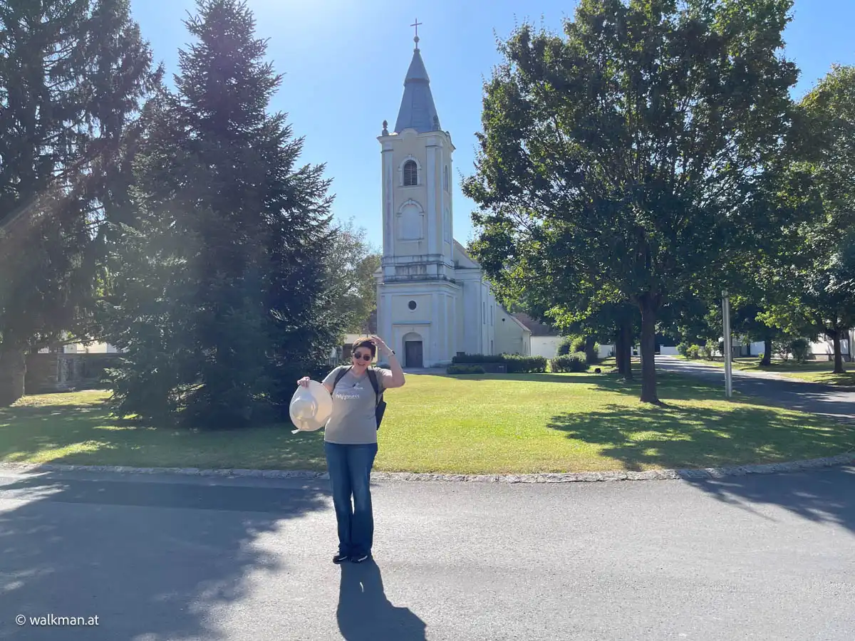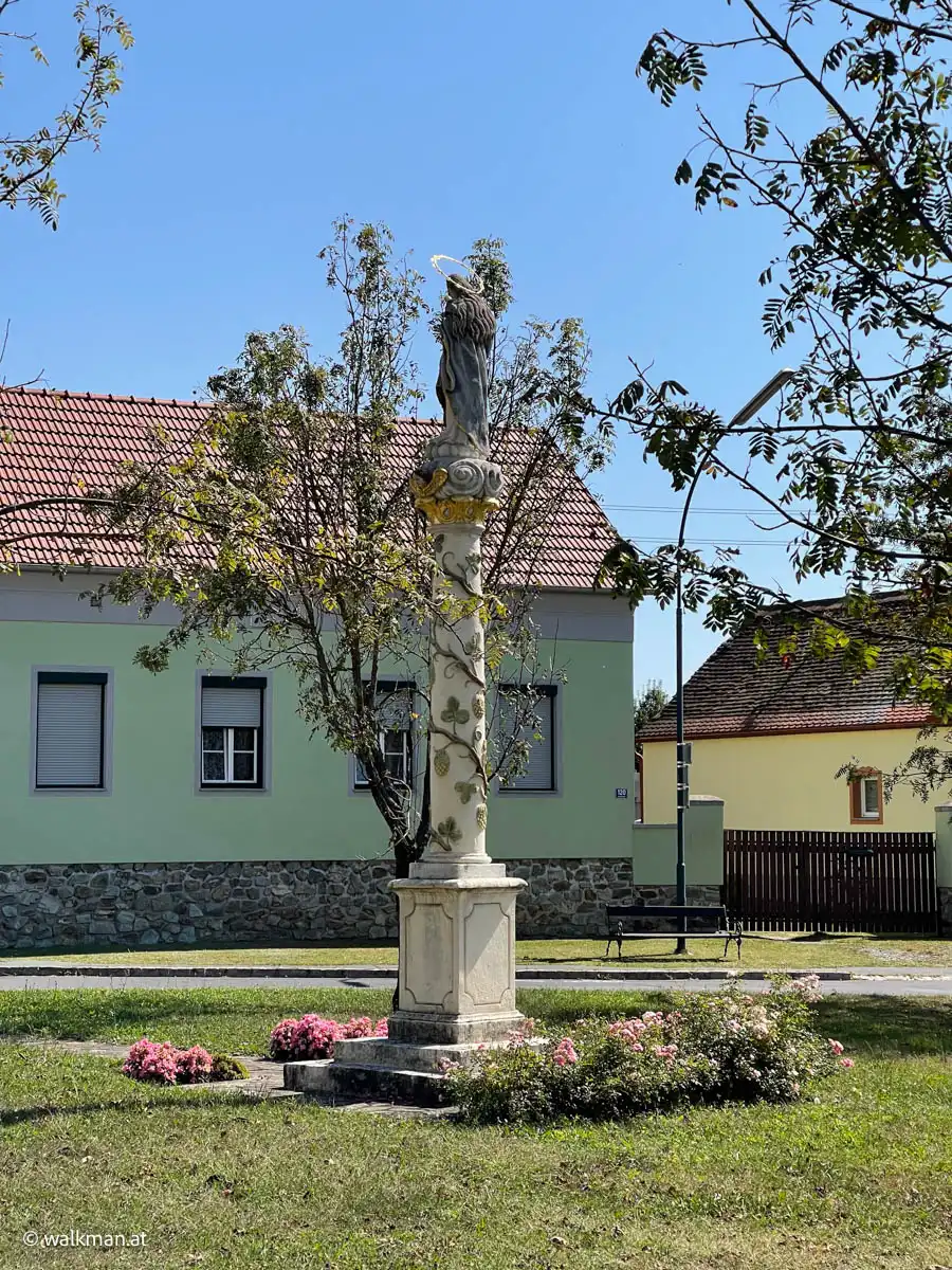 Zum Hauptplatz in Eberau aber (während der Pause) noch ein Wort: Hier befindet sich ein wirklich schöner Park mit schattigen Bänken. Neben dem Park auch eine imposante Kirche und im Park selbst noch eine Marienstatue und ein Pranger. Am anderen Ende, gegenüber der Kirche, weiters ein schöner Springbrunnen. Summa summarum ist Sightseeing mit einer Pause im schattigen Park sicher auch nicht zu verachten.