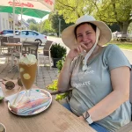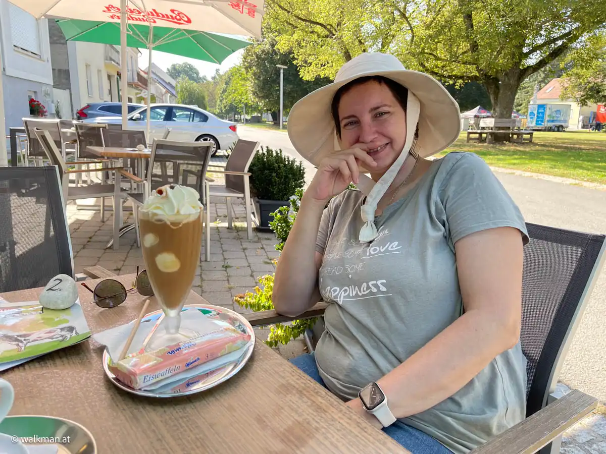 Aber jetzt finden wir uns erst mal im Café Crustulum ein. Halbzeit. Pause! An der Kirche vorbei marschierend sehen wir das Café auch schon. Hier waren wir vorgestern auch gewesen, auf unserer Tour von Gaas herauf. Und jetzt freuen wir uns schon auf Kaffee und Torte. Und Manuela freut sich drauf, dass „ihre Strecke“, ihr Training vorbei ist. Und ist stolz, wieder ein Stück mehr geschafft zu haben. Zurecht.