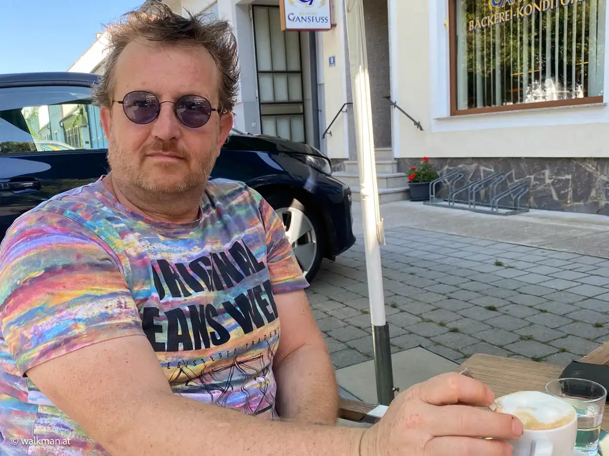 Genüsslich fallen wir also in die Sitze im Gastgarten vor dem Lokal und bestellen bei der freundlichen Kellnerin unsere Labungen. Und genießen jetzt mal eine Zeitlang einfach die Stille hier, die Stimmung und einfach den angenehmen, sonnigen Vormittag.