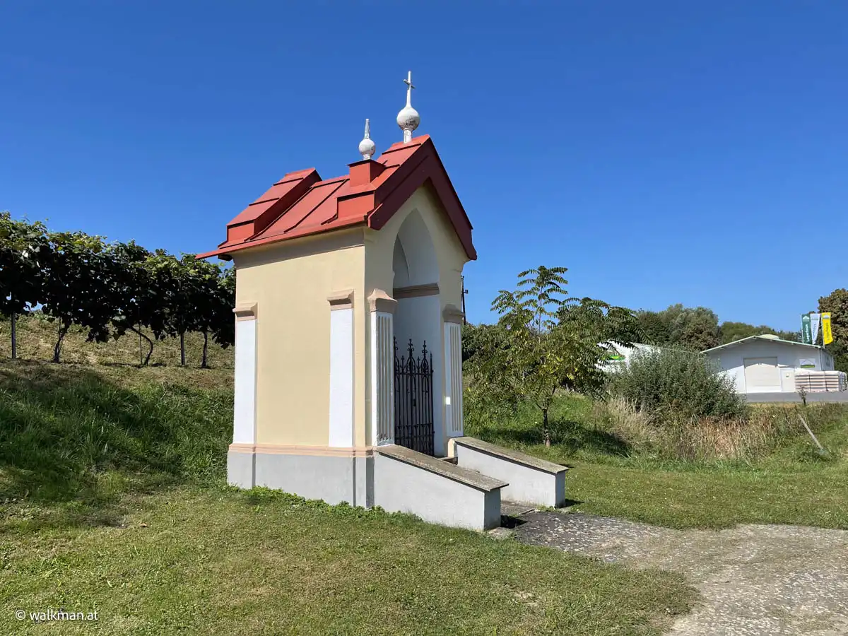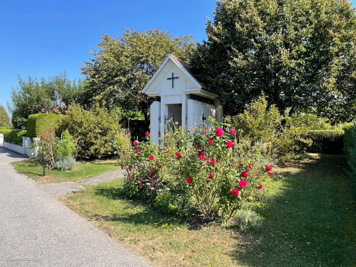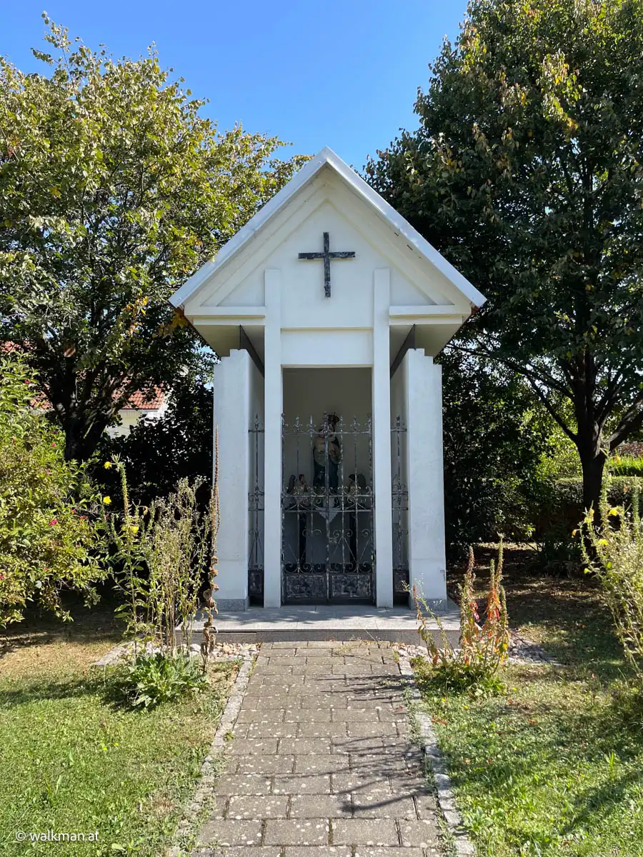 Am Hauptplatz vorbei wandere ich, vorbei an einem Amerikanerkreuz, schräg gegenüber auf der Bundesstraße, die Kapellengasse hinein. Hier muss ja auch eine Kapelle sein, wenn der Name stimmt. Und dem ist auch so. Bald erblicke ich die kleine, schmucke, gepflegte Kapelle am rechten Rand und schieße einige Fotos.
