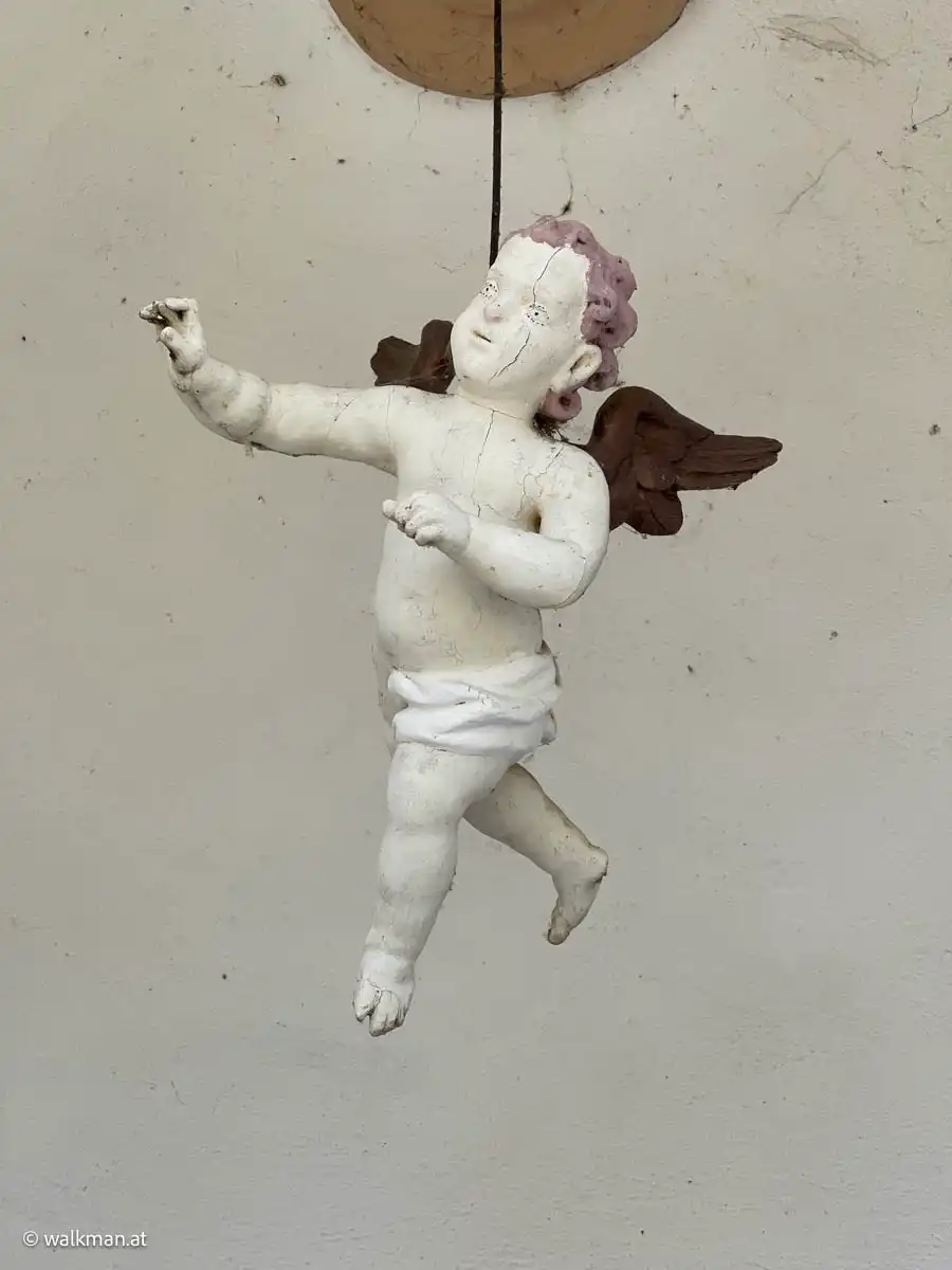 Aber trotz der Hitze überlege ich tatsächlich, ob ich meine Route nicht ein wenig verändern soll. Im Webtool am Handy sehe ich, ein wenig weiter bergan, eine Bergkapelle. Die habe ich auch, beim hierher gehen, am Berg oben thronen, gesehen. Soll ich? Soll ich nicht? Hm. Ich gucke kurz hinein in die Gasse, auf der ich zur Kapelle gelangen würde. Diese verläuft gleich neben der Kirche vorbei. Aber uff … die geht bergauf. Und zwar richtig. Nein, lieber nicht. Nicht jetzt. Nicht heute.
