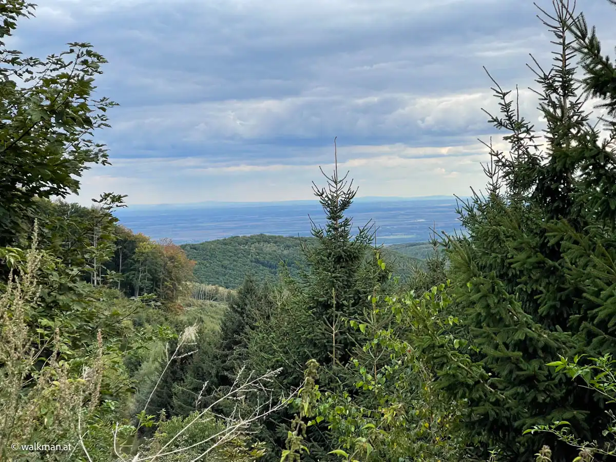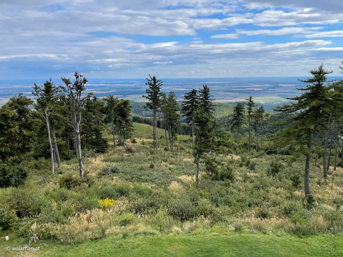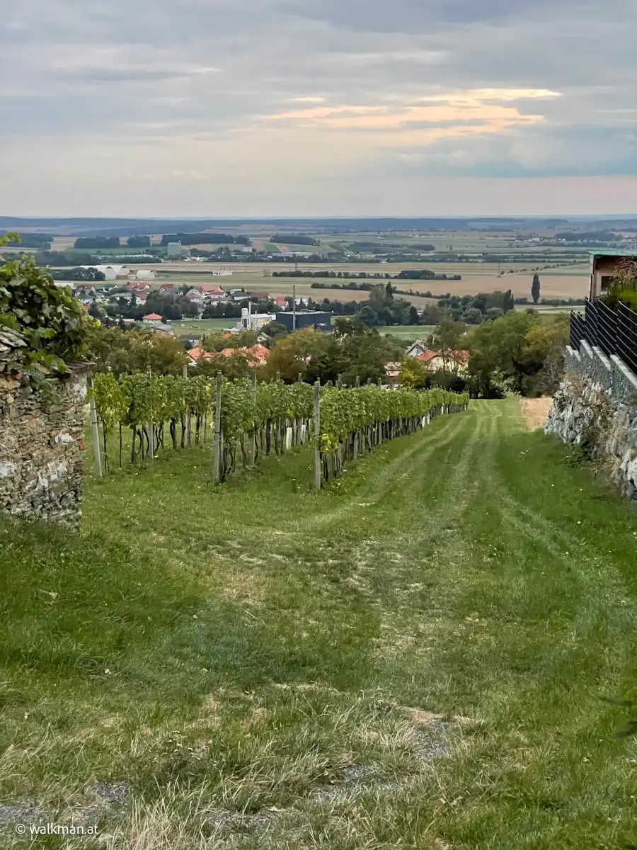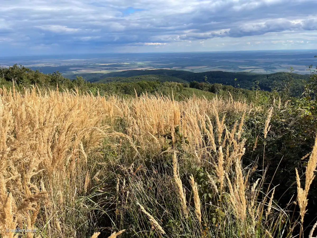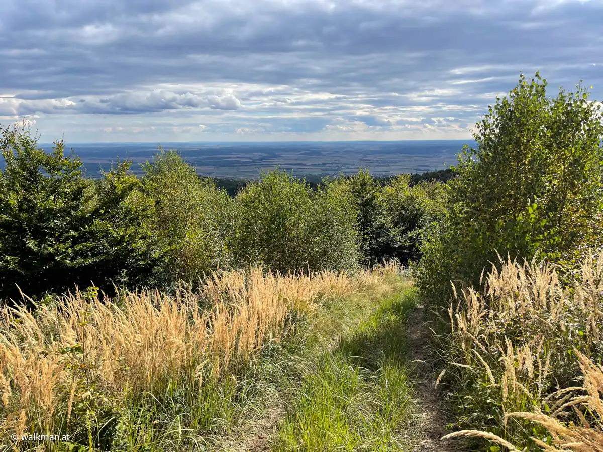 Das war keine falsche Entscheidung, wie man an obigem Bild erkennen kann. Hier ist ein richtig toller Fotopunkt. Und ein traumhaftes Panorama. Hinter vorgelagerten geschwungenen Hügeln sieht man weit bis nach Ungarn rein. Herrlich.